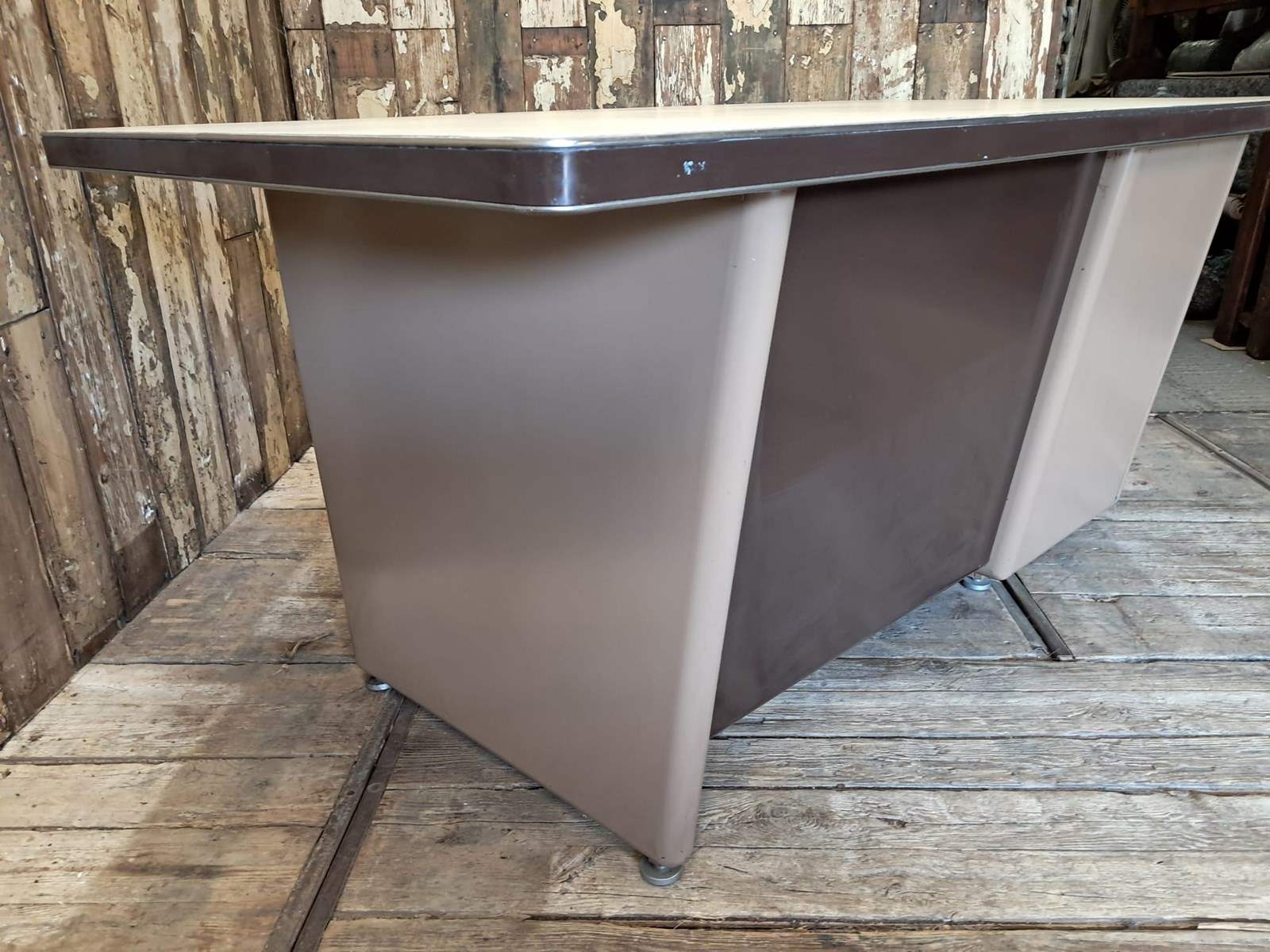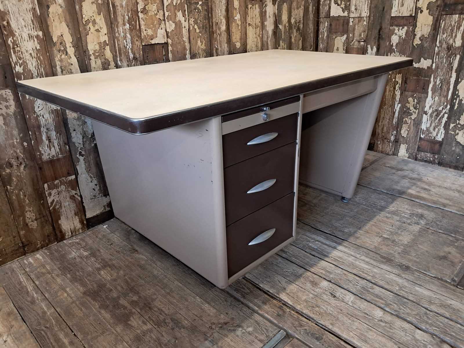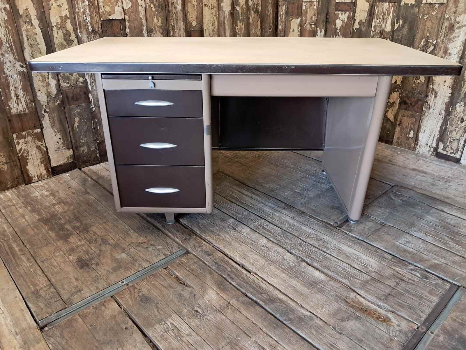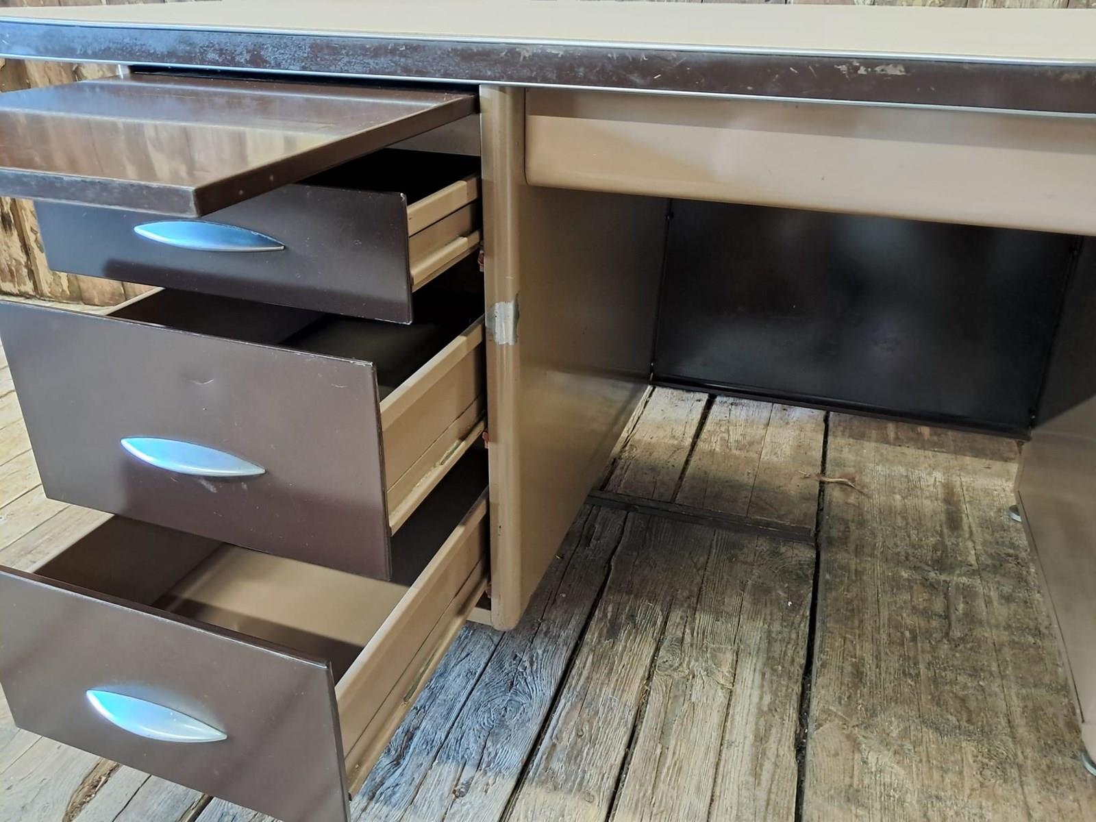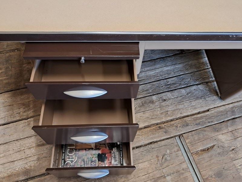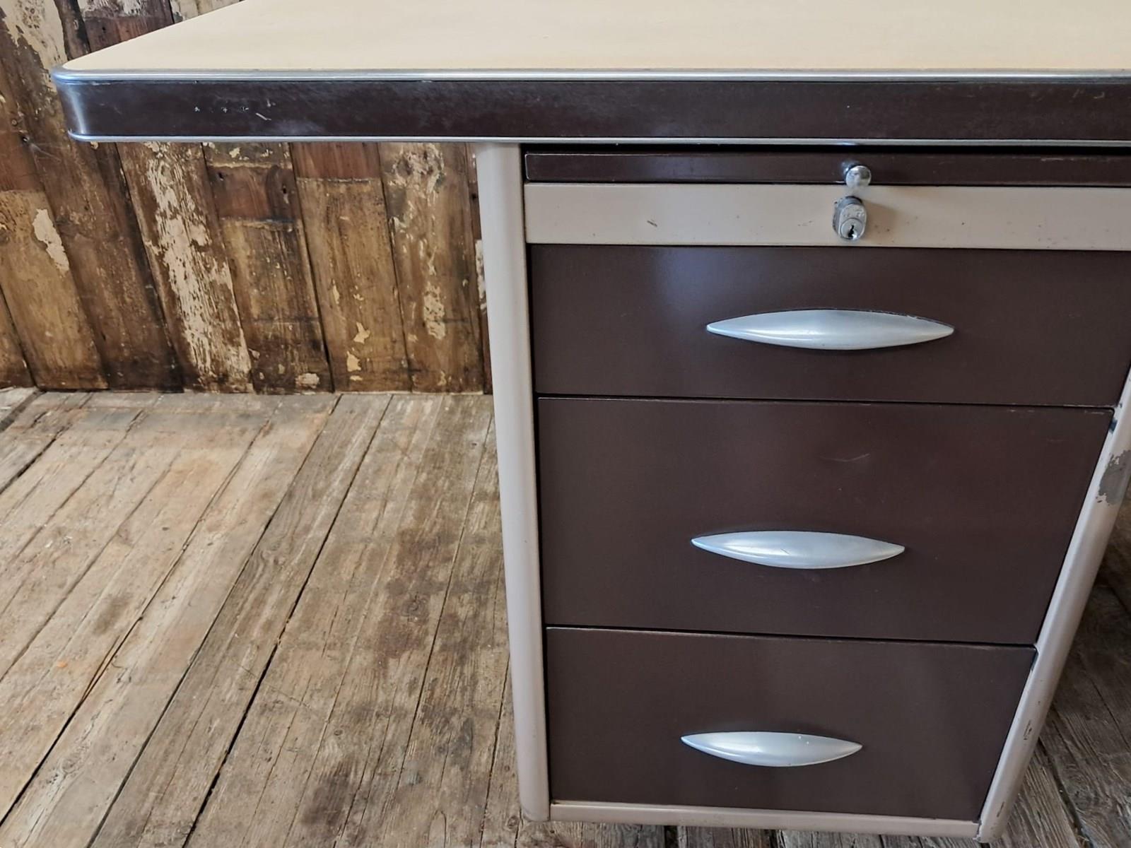 With steel frame and drawers in dark brown and beige and a vinyl inlay top in cream.