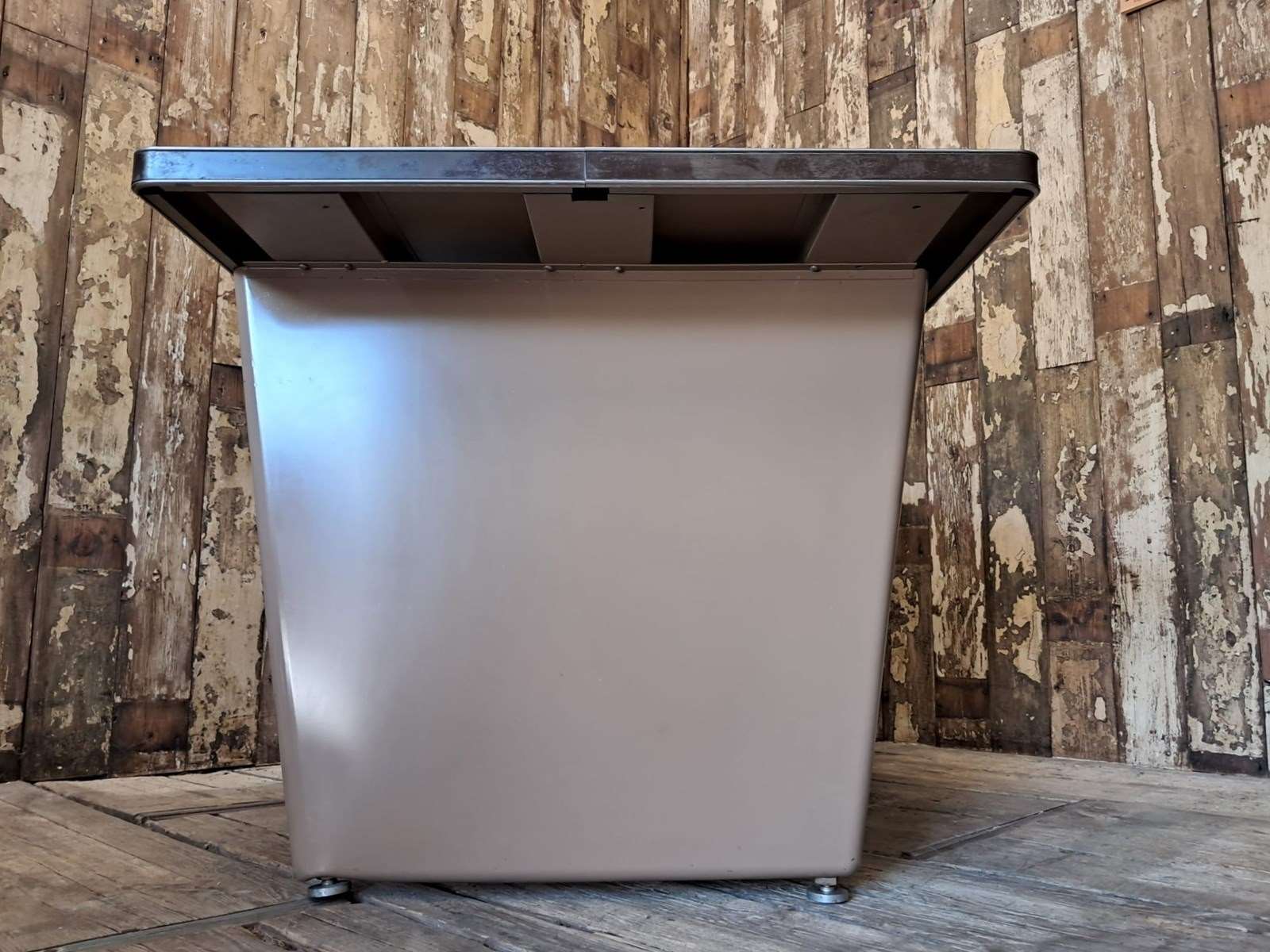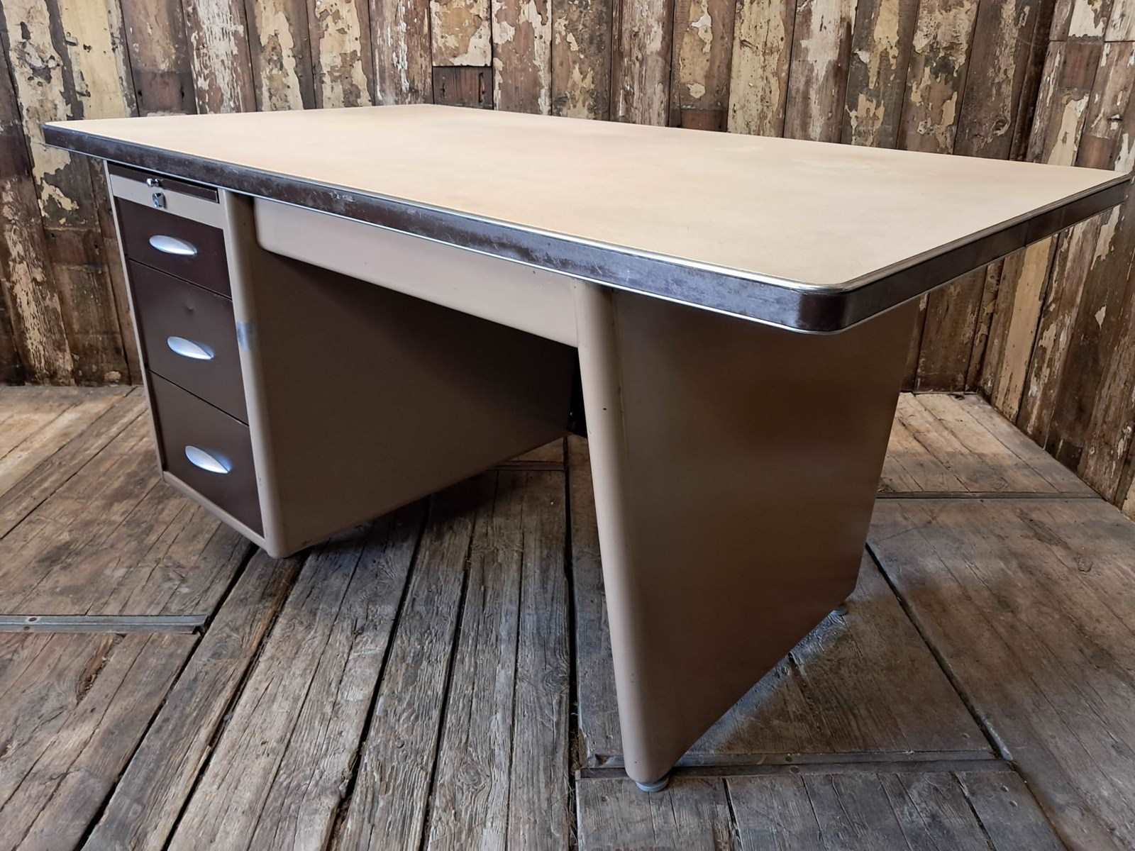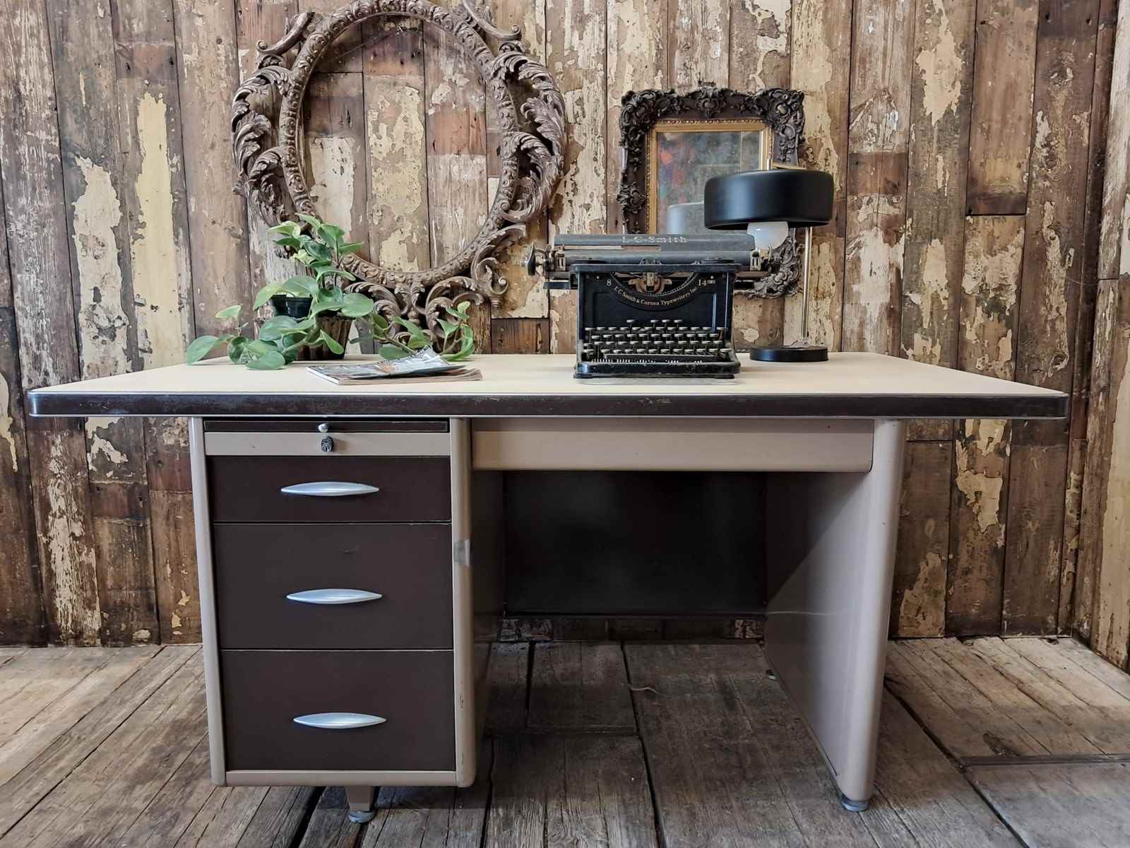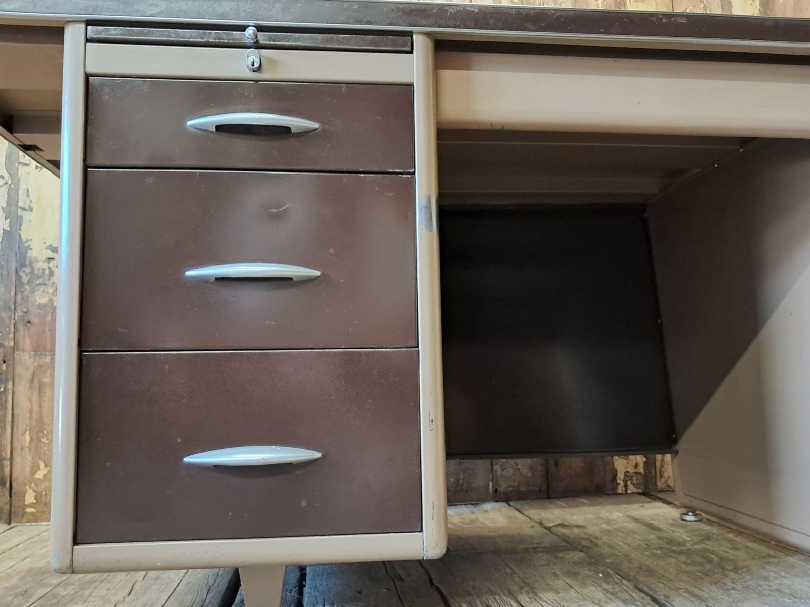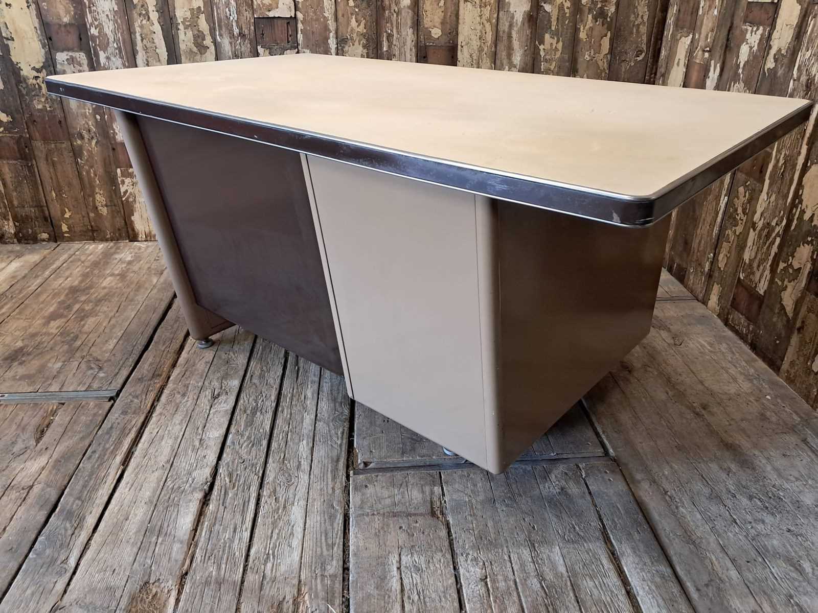 With steel frame and drawers in dark brown and beige and a vinyl inlay top in cream.
