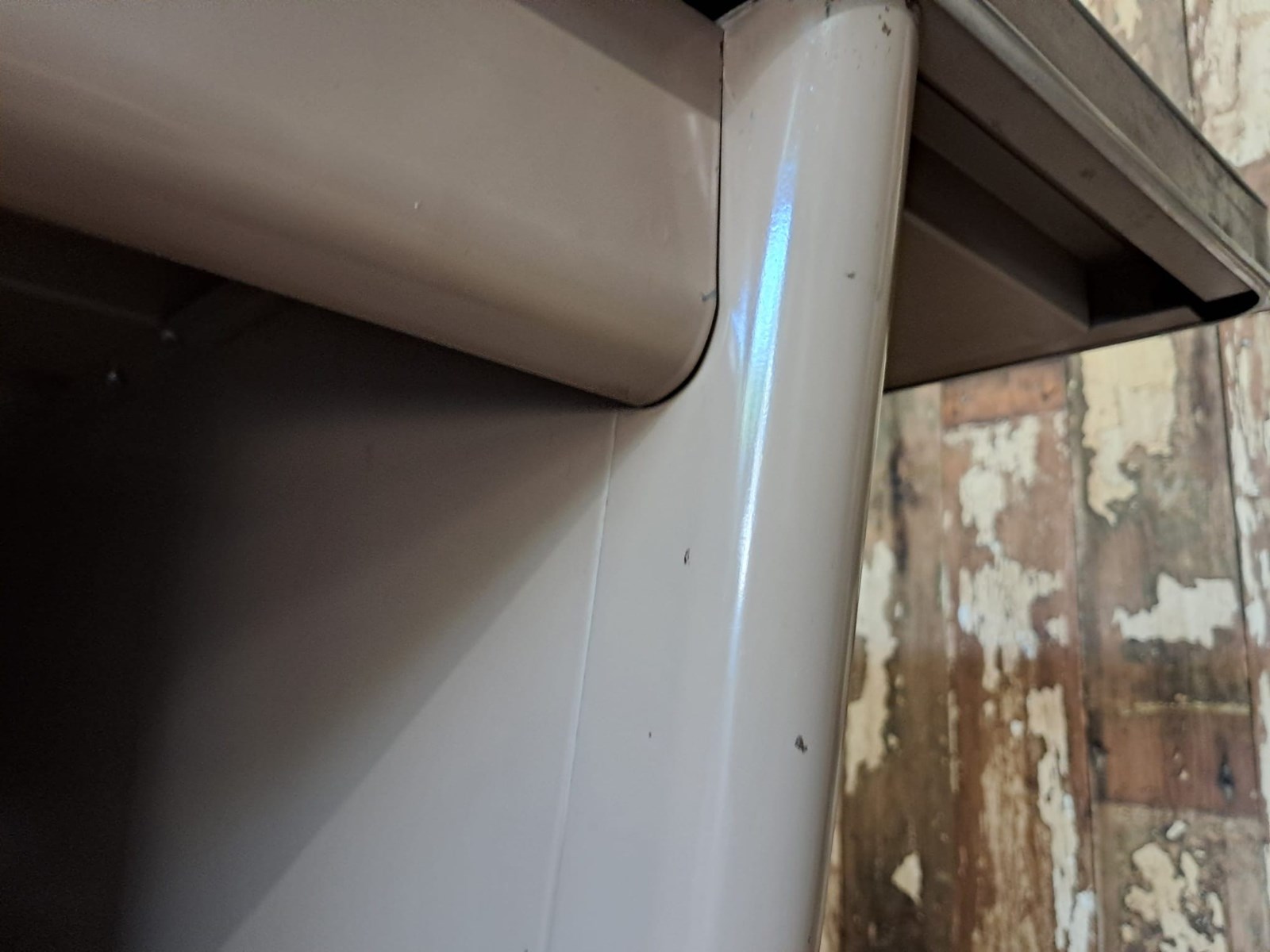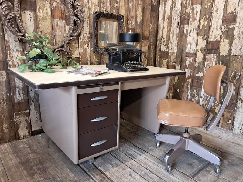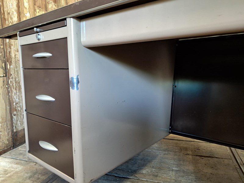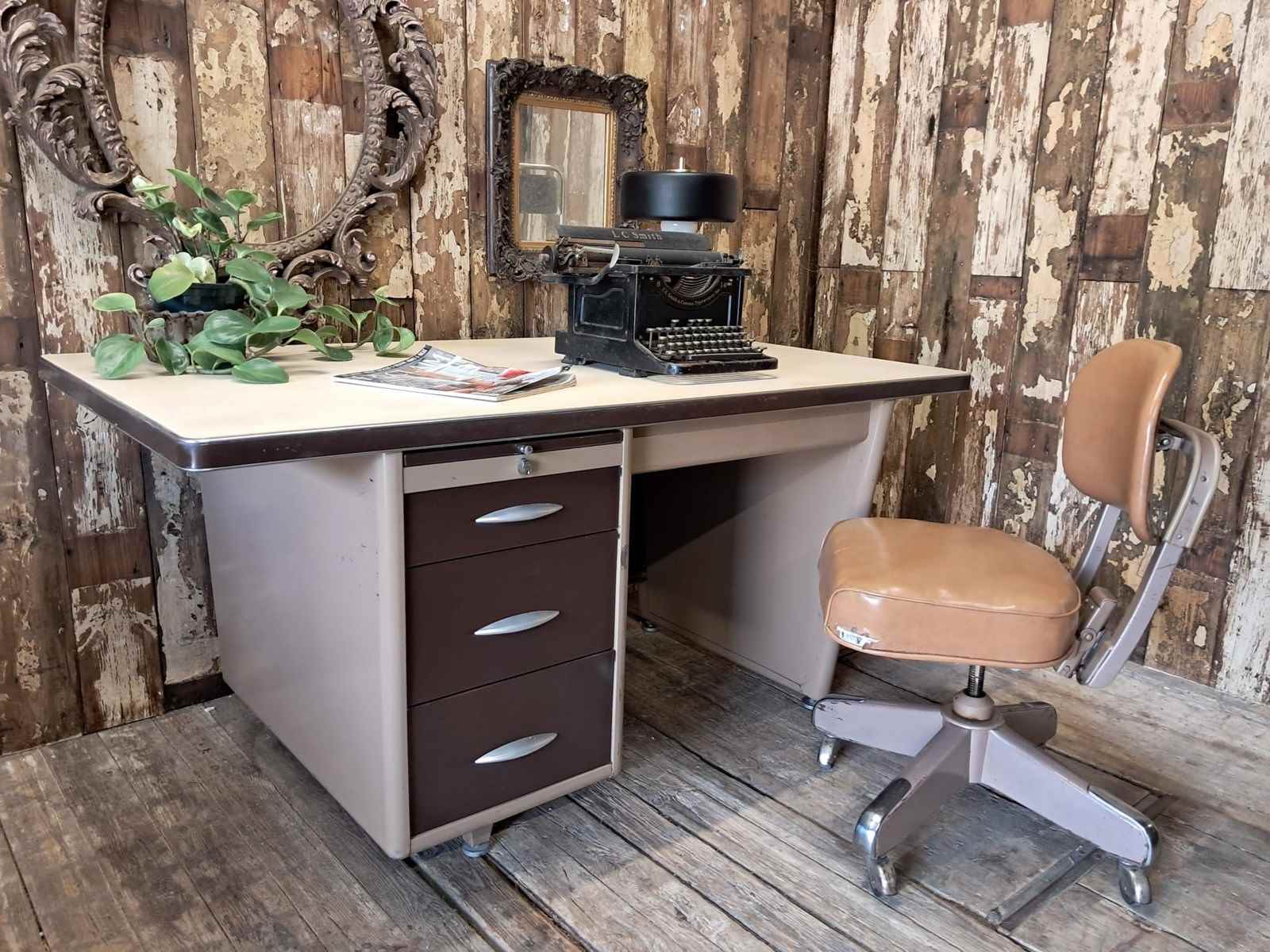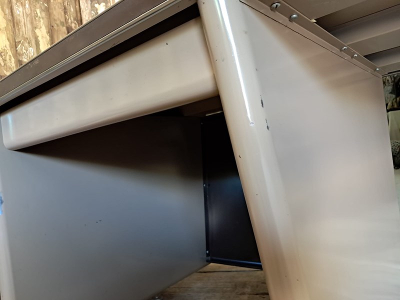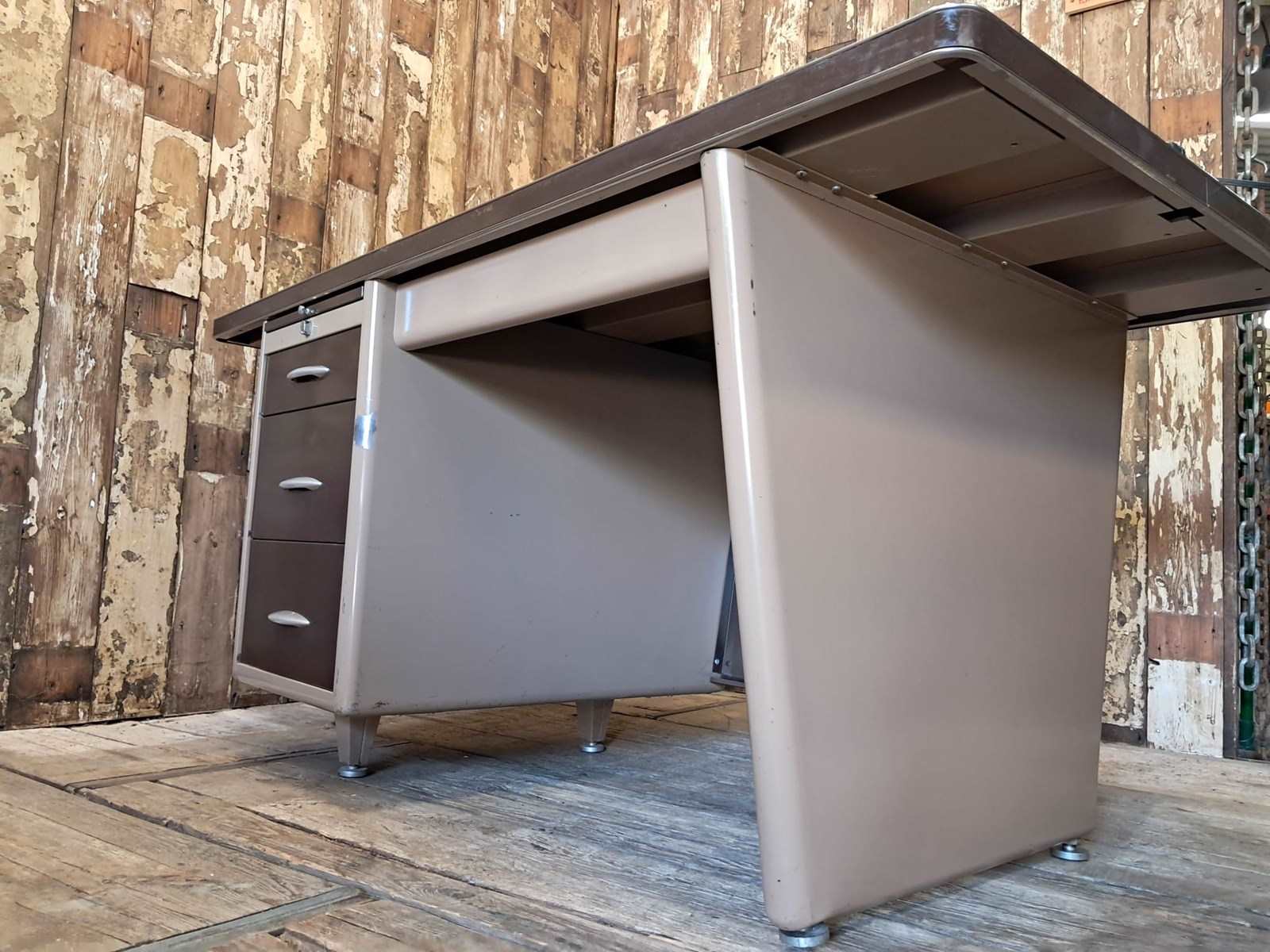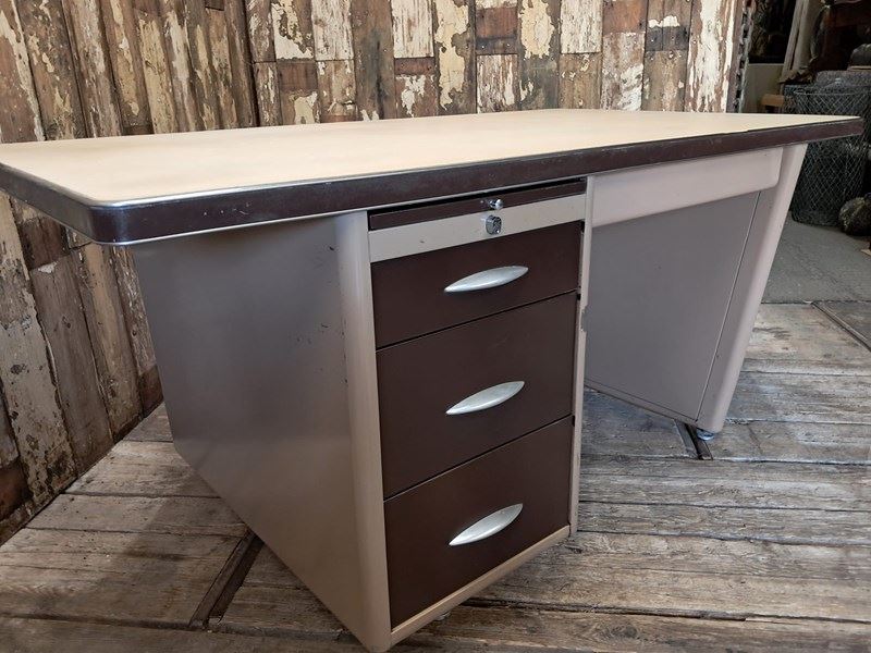 With steel frame and drawers in dark brown and beige and a vinyl inlay top in cream.