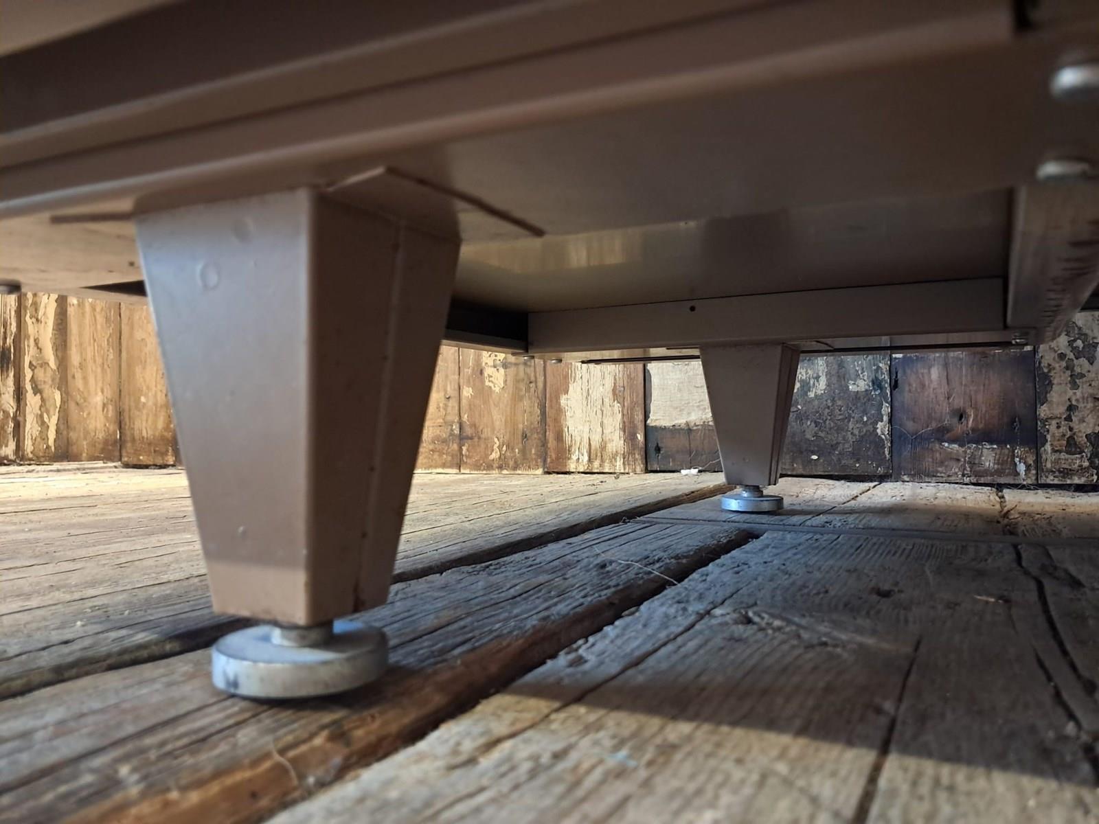 It has a lock but currently no key. Adjustable feet help to level the desk.