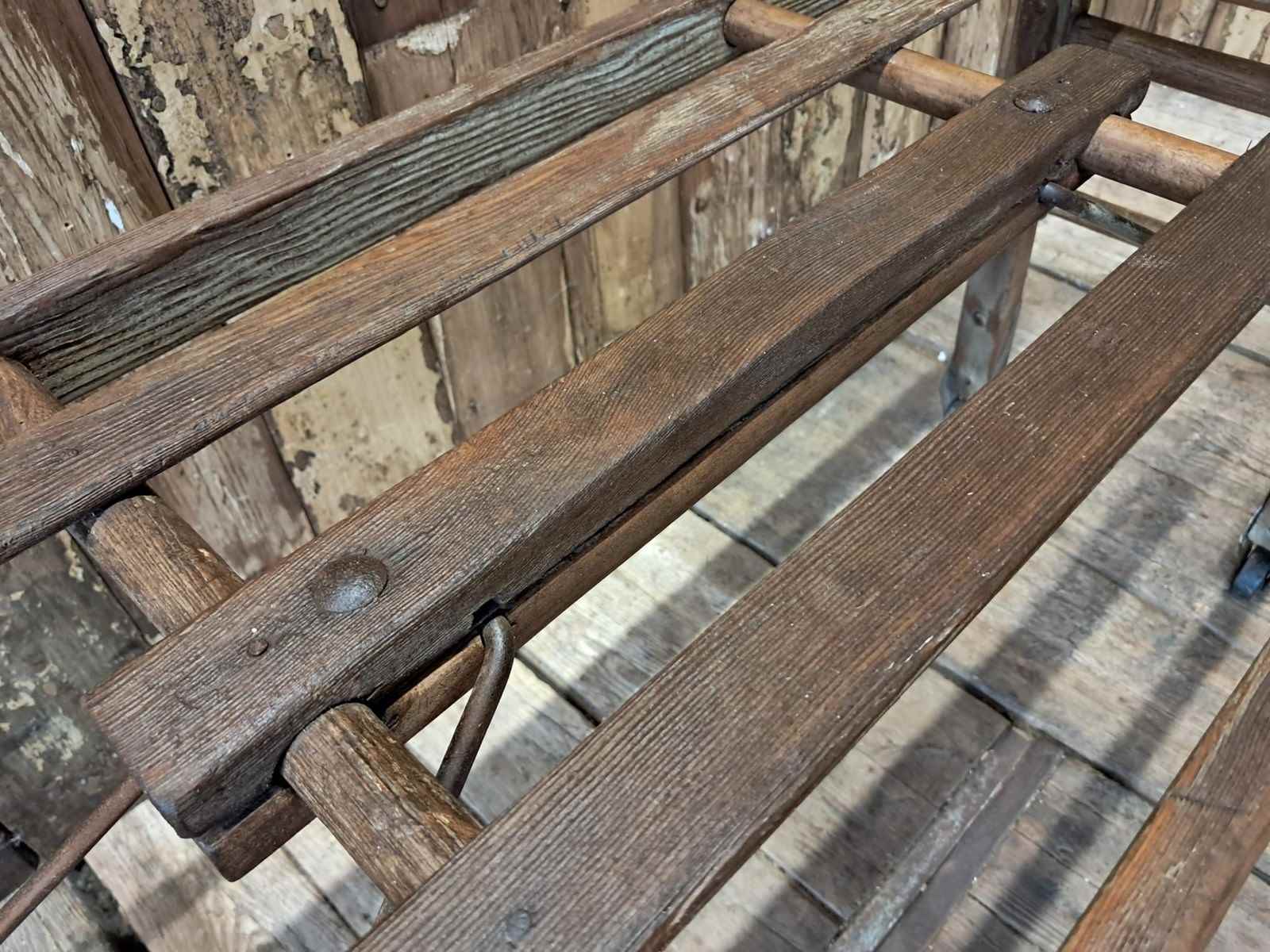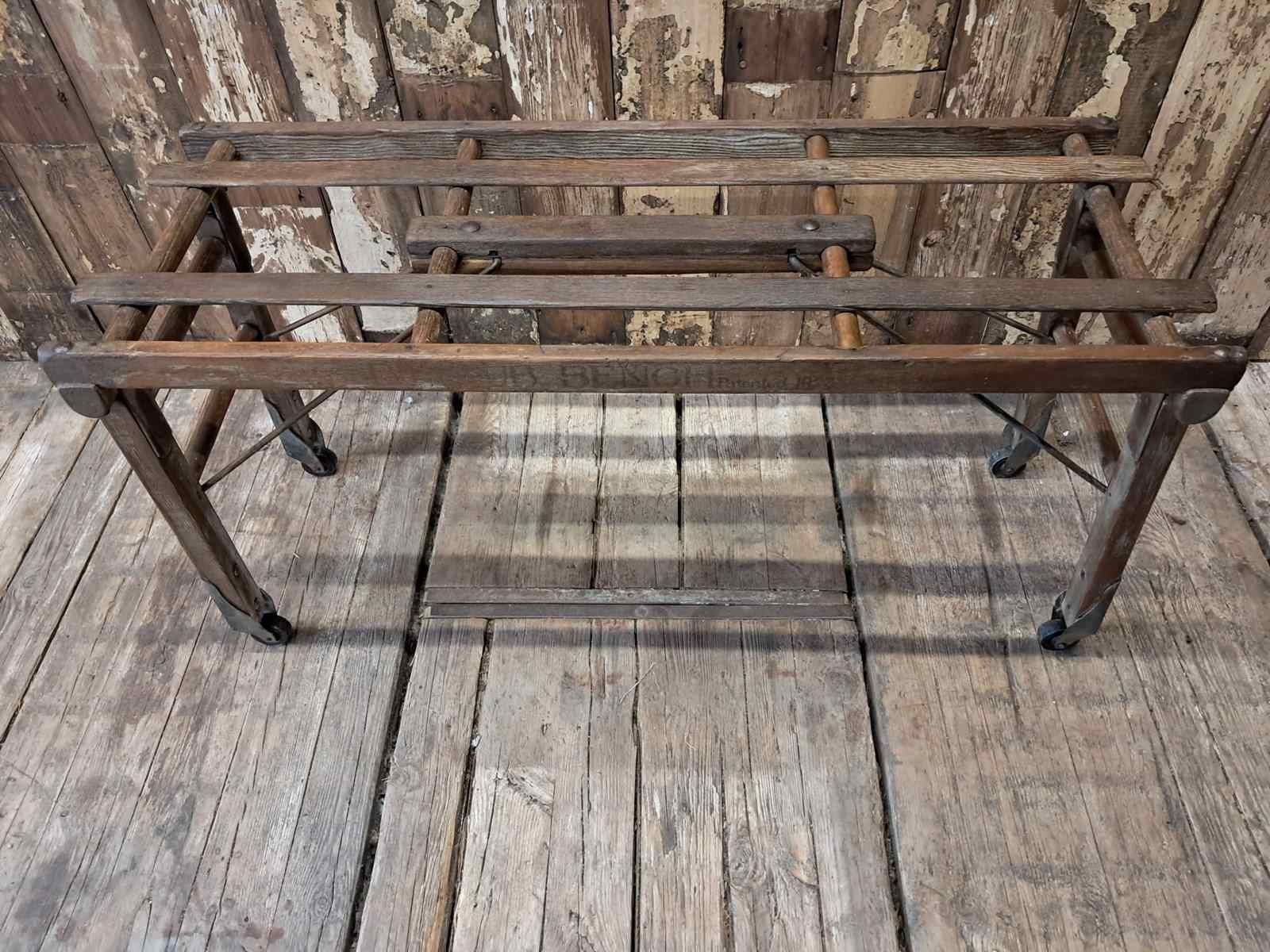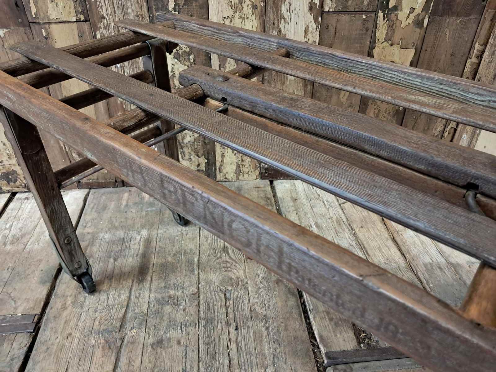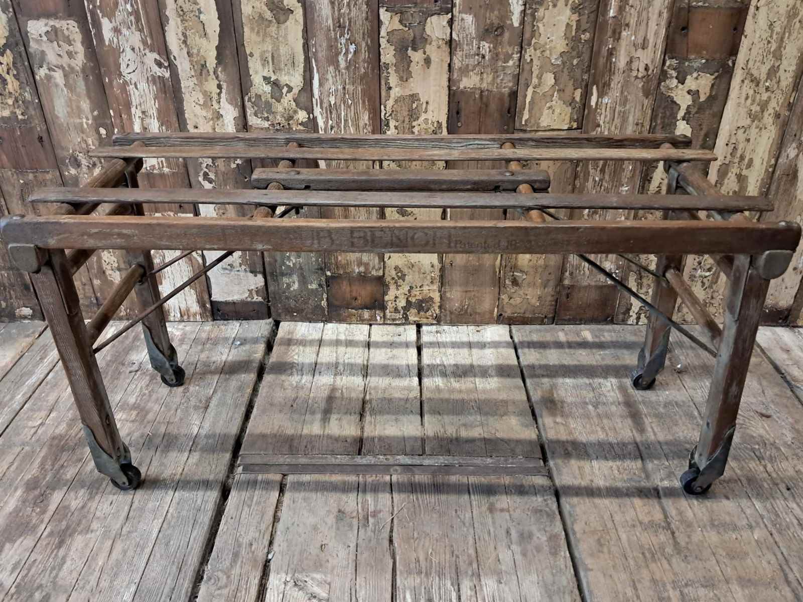 Original castors give ease of movement and storage is made easy as it folds flat – complete with original branding ‘BT Tub Bench patented 1923’.