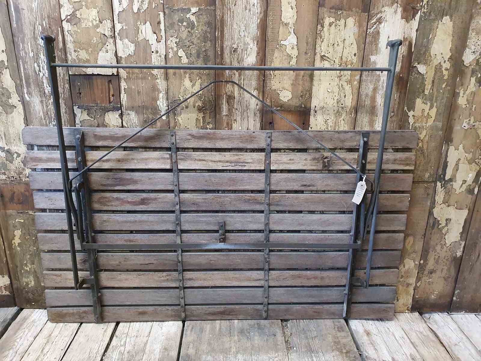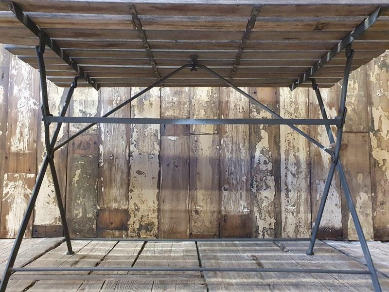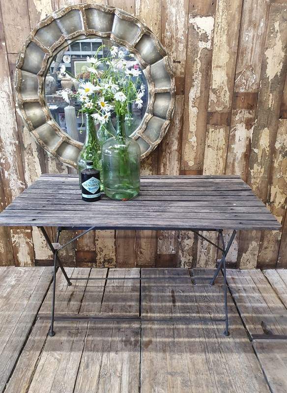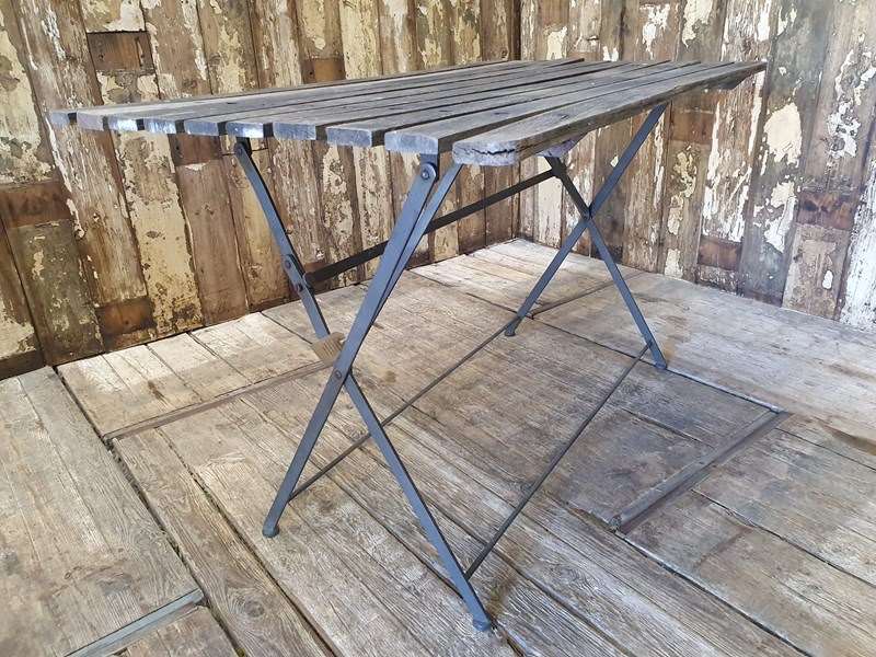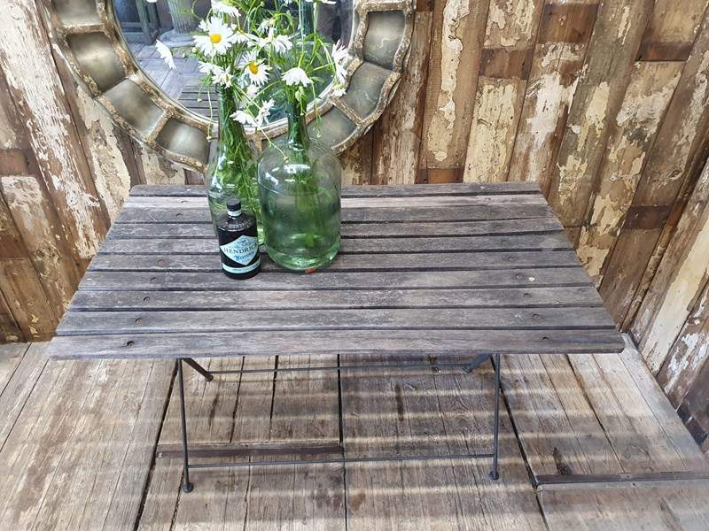 A simple, vintage rectangular wooden slatted table with grey metal frame that folds flat for easy storage.