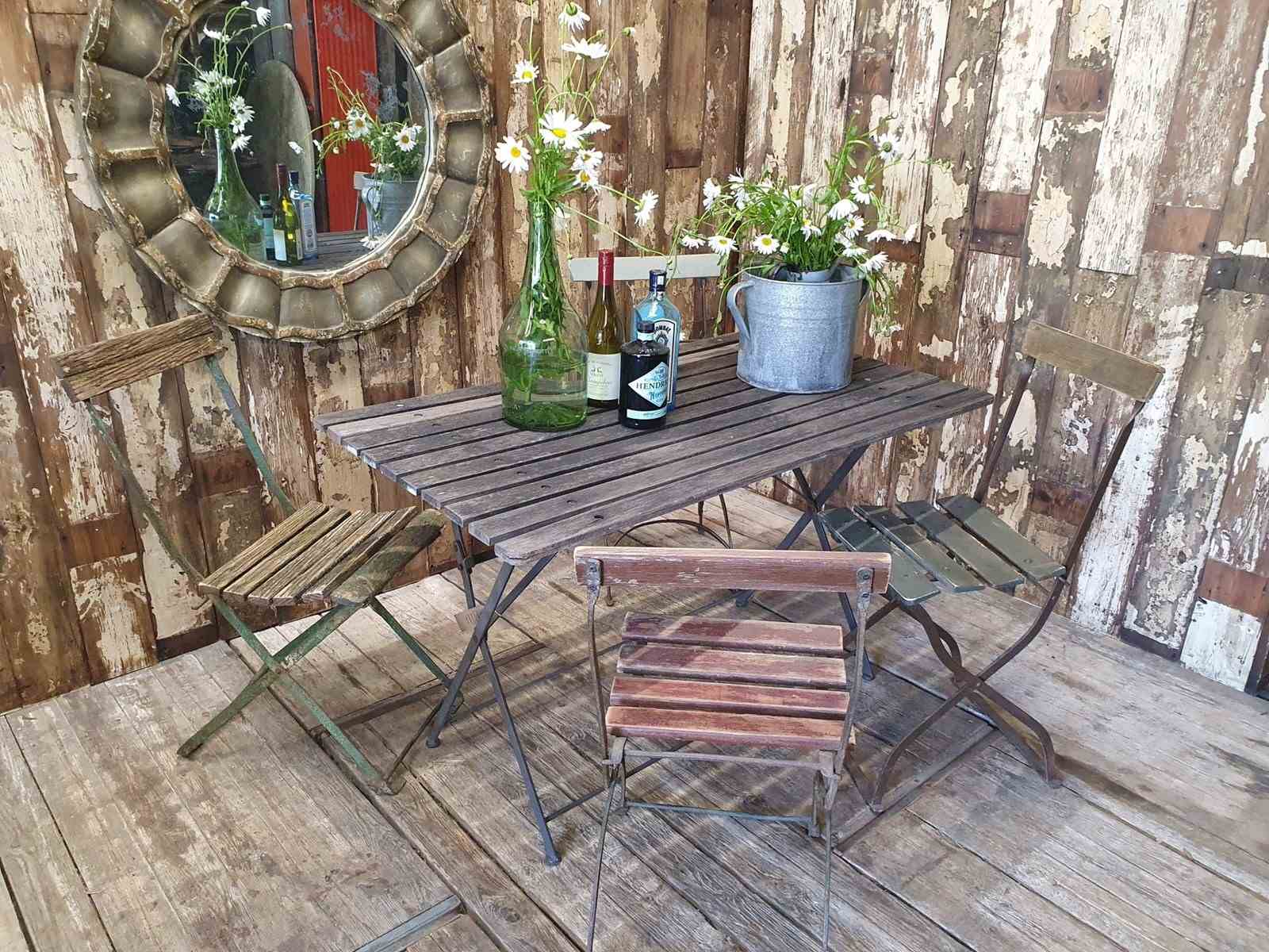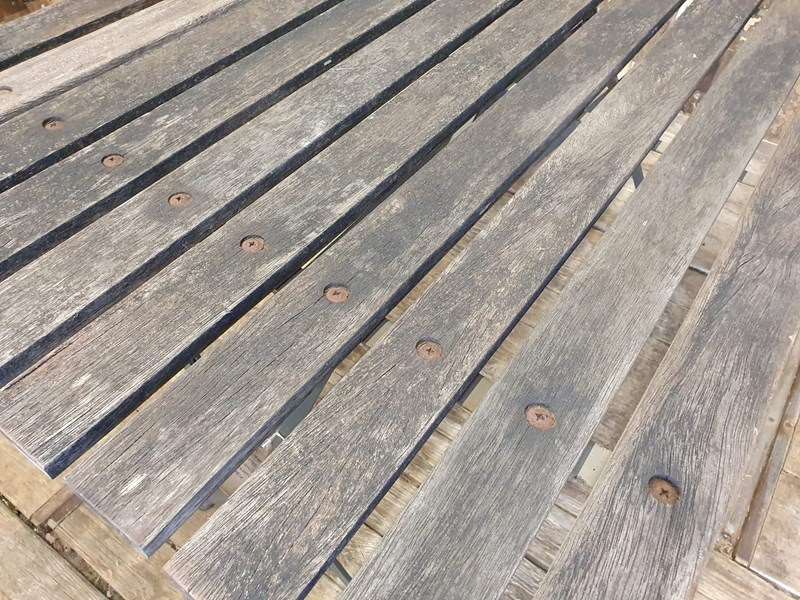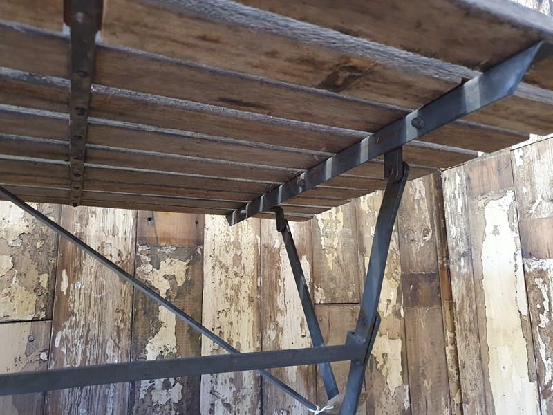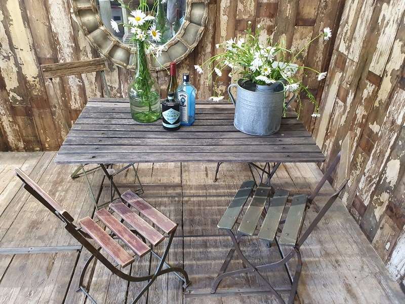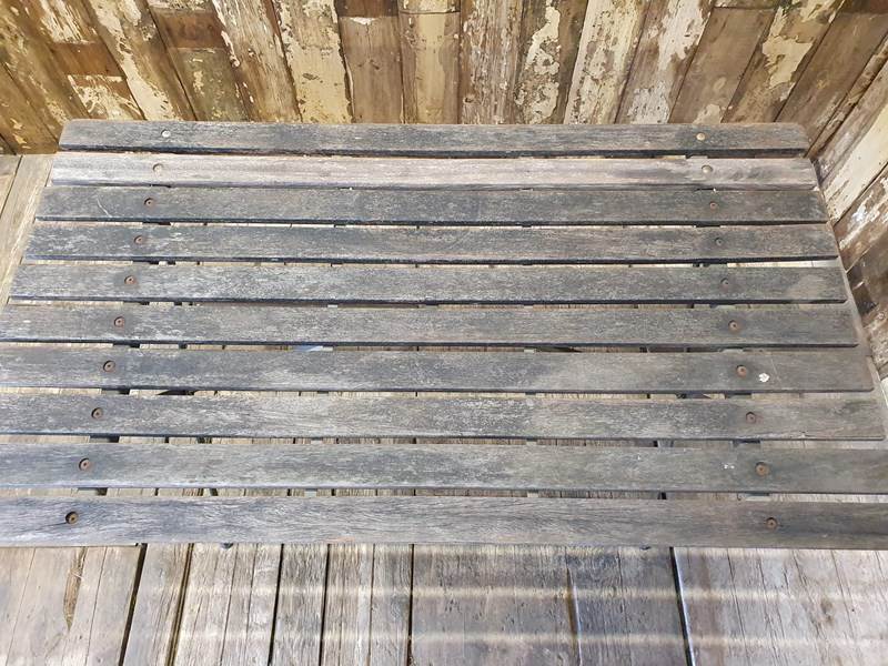 A simple, vintage rectangular wooden slatted table with grey metal frame that folds flat for easy storage.