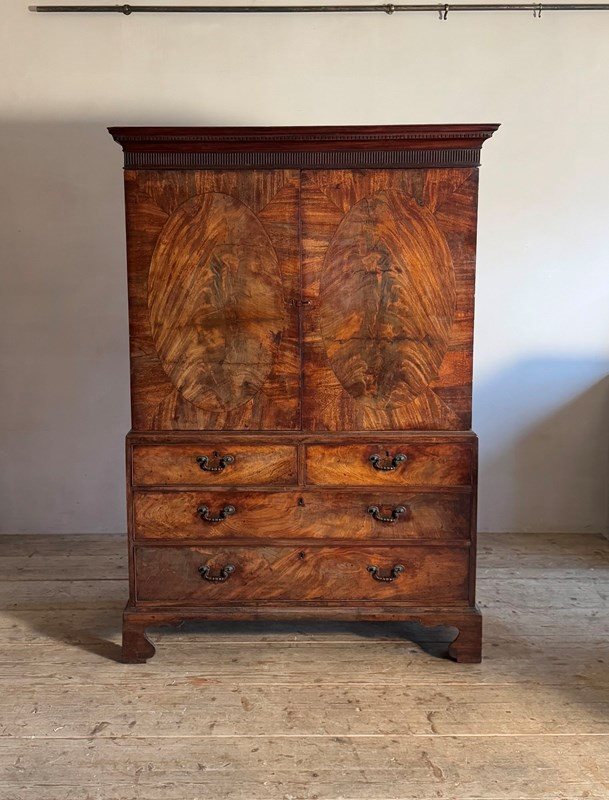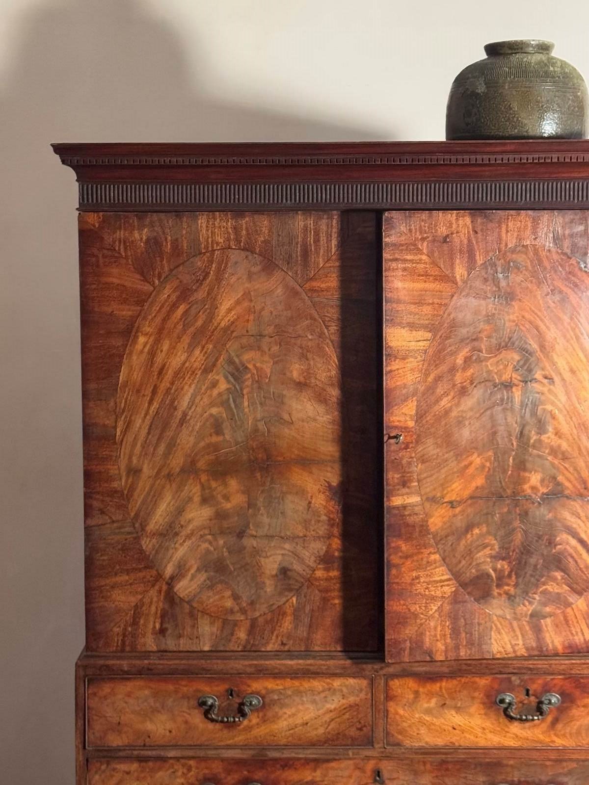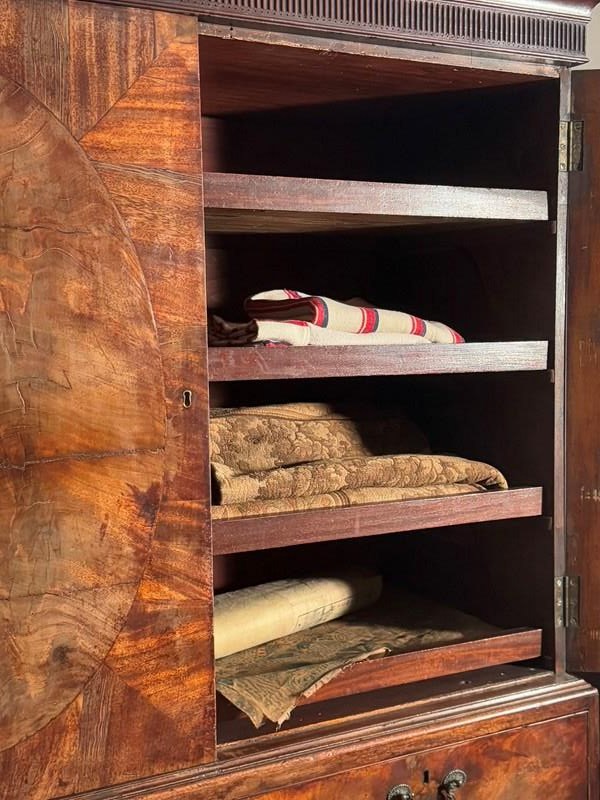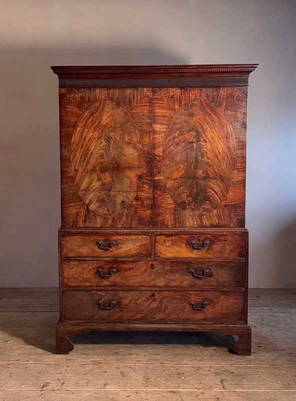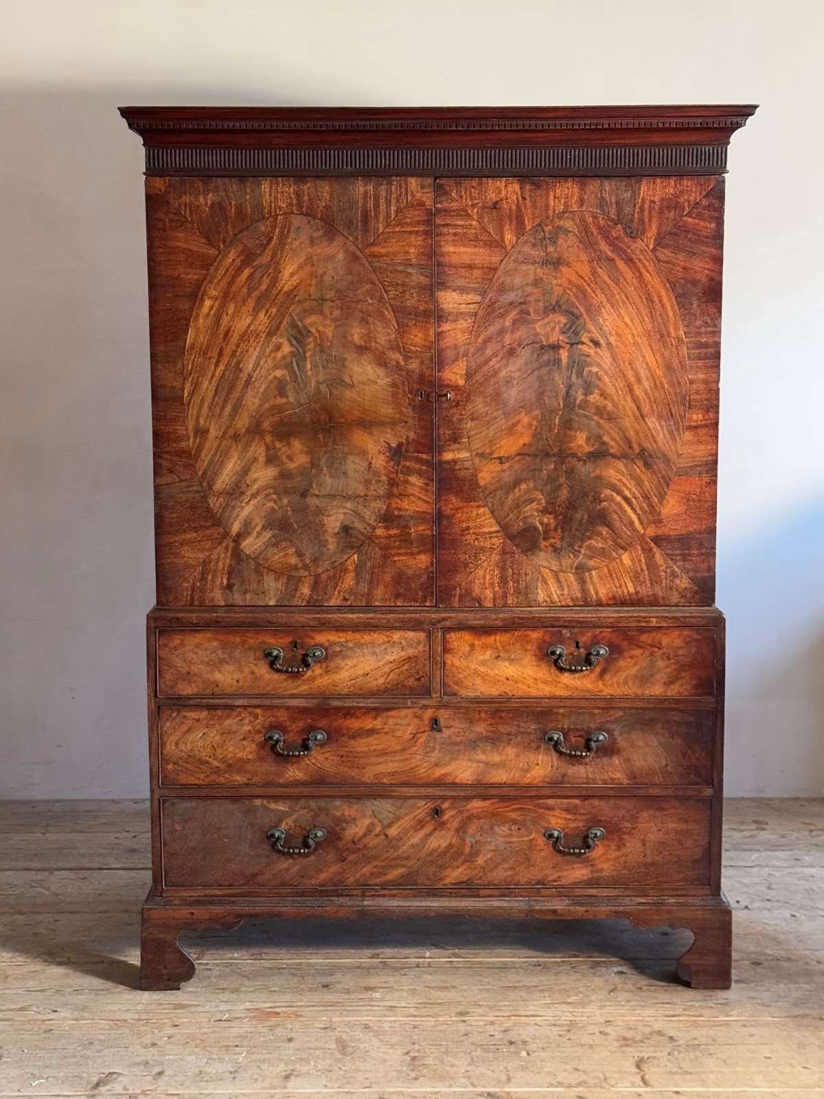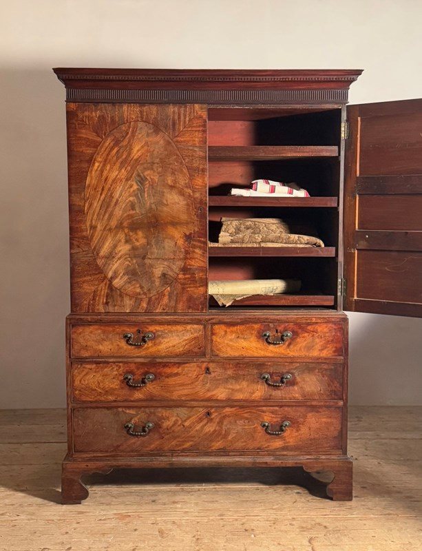 A fine quality George III mahogany linen press in the manner of Thos Chippendale C.1760, the flush fronted door panels with cross banded ovals, a chatting cornice with fluting and dentil moulding. Inside the red washed carcass has four slides for linens, below is an arrangement of two over three drawers, lined in oak and deal, raised on bracket feet. The whole is well figured and a glorious rich colour.