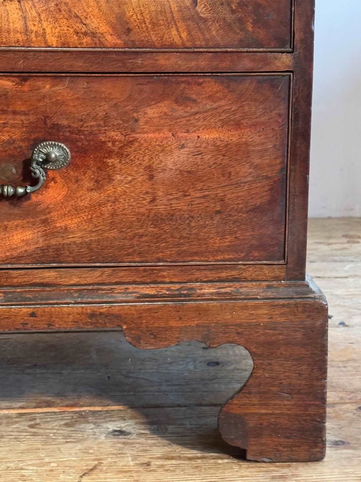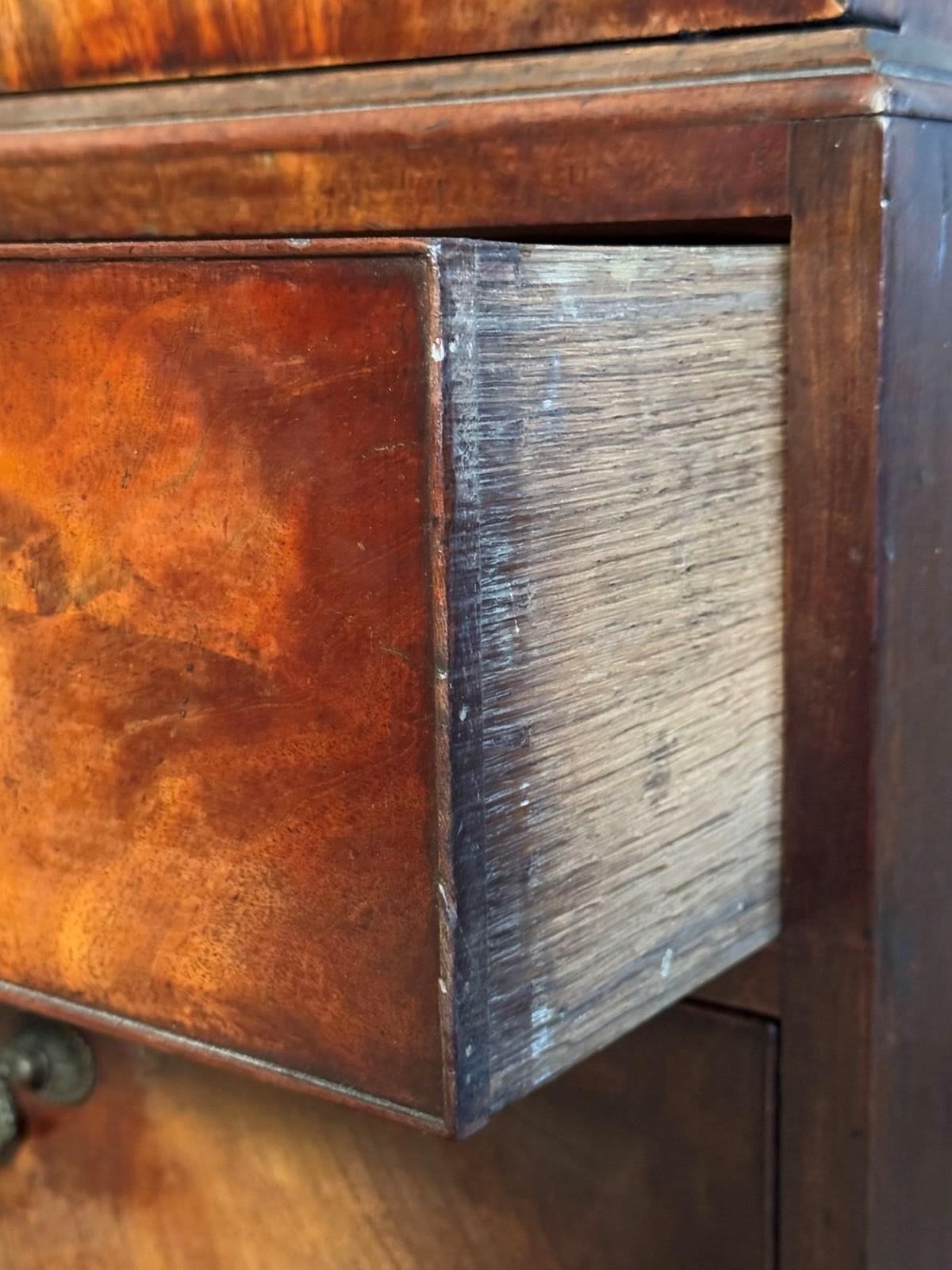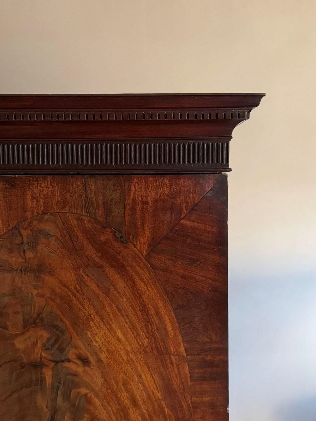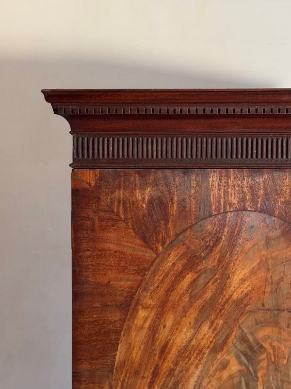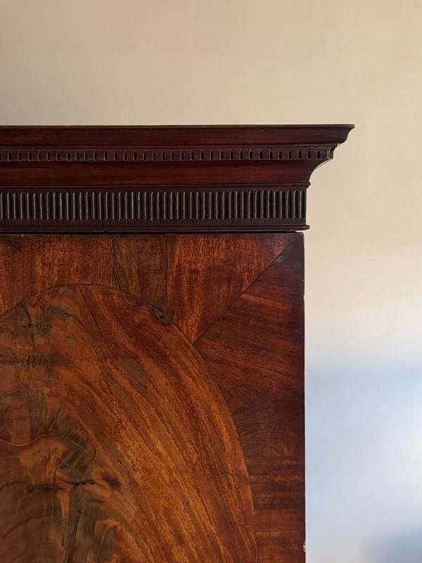 A fine quality George III mahogany linen press in the manner of Thos Chippendale C.1760, the flush fronted door panels with cross banded ovals, a chatting cornice with fluting and dentil moulding. Inside the red washed carcass has four slides for linens, below is an arrangement of two over three drawers, lined in oak and deal, raised on bracket feet. The whole is well figured and a glorious rich colour.