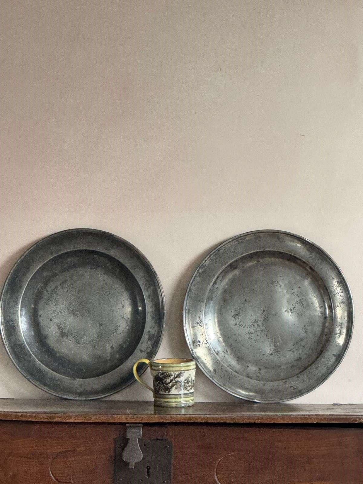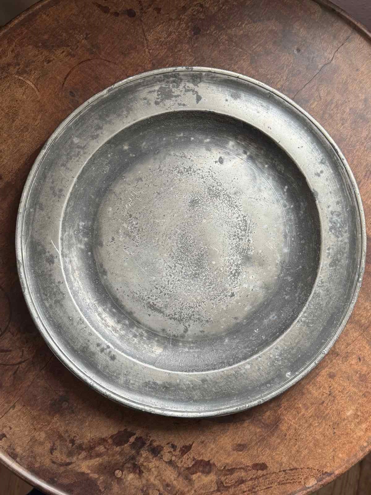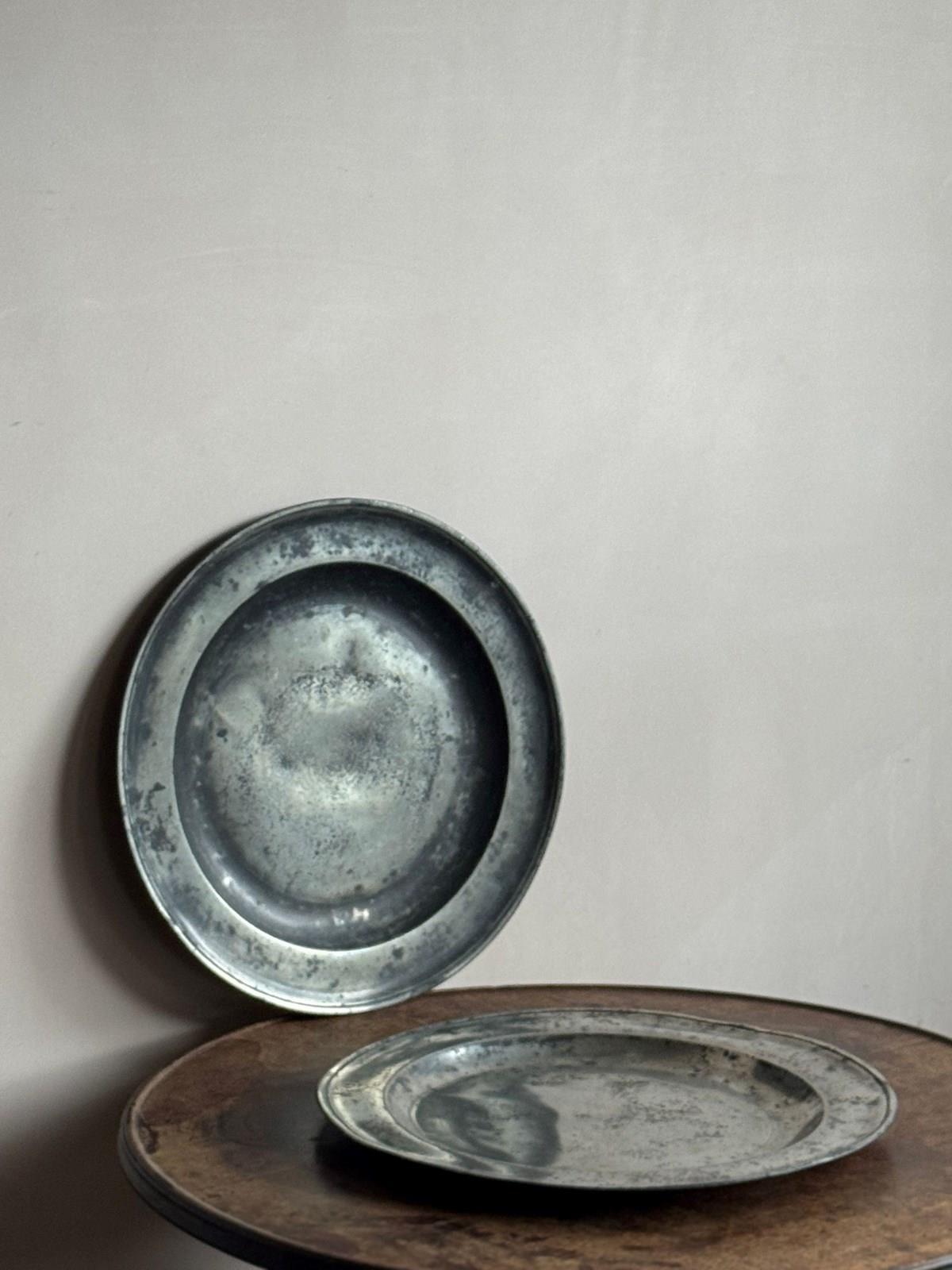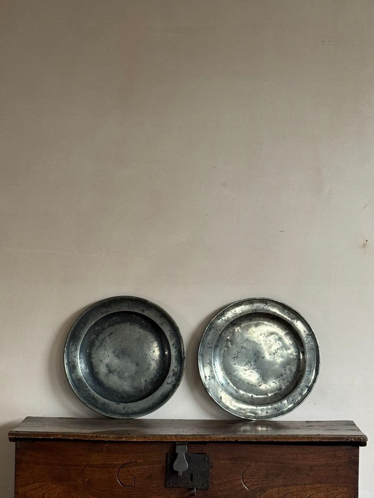 Two 15” pewter chargers, one with a London touch mark C.1700