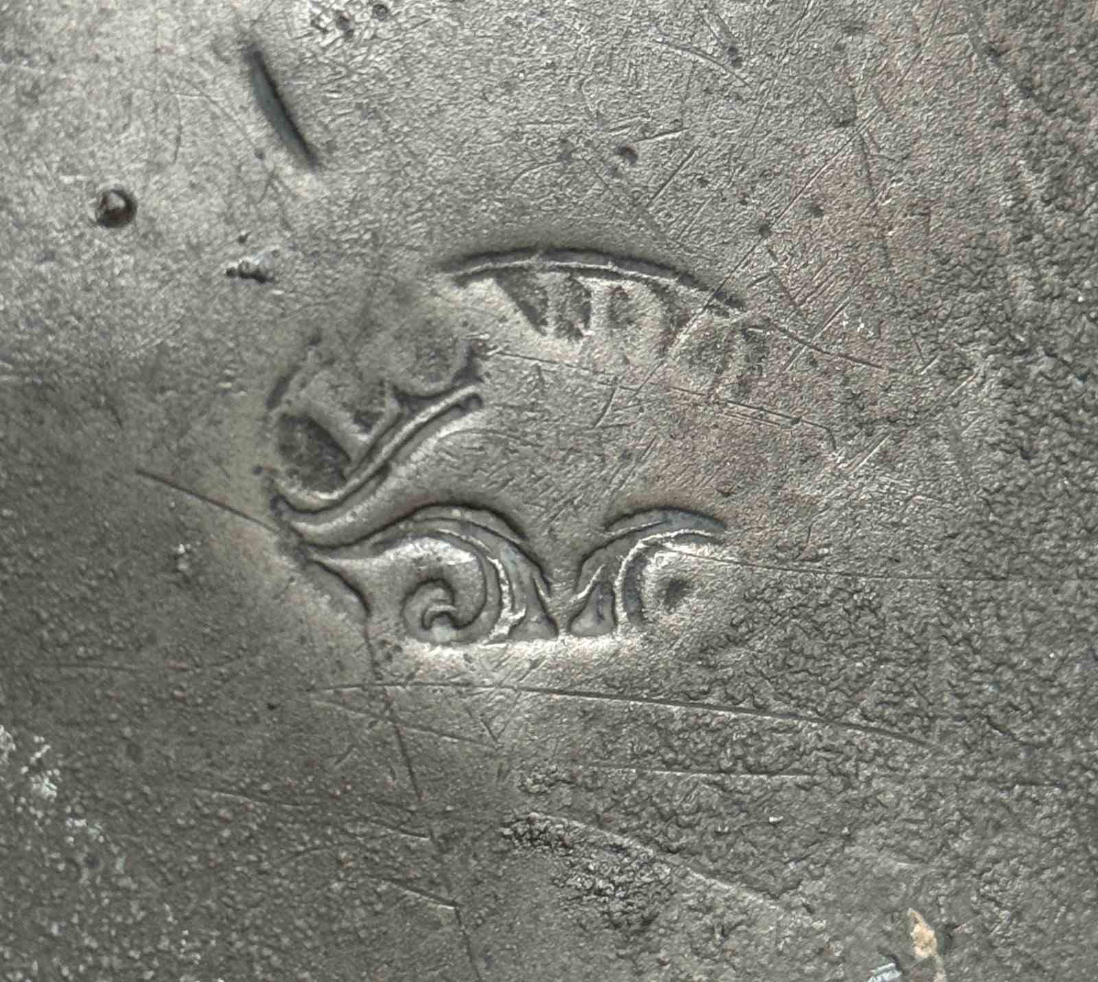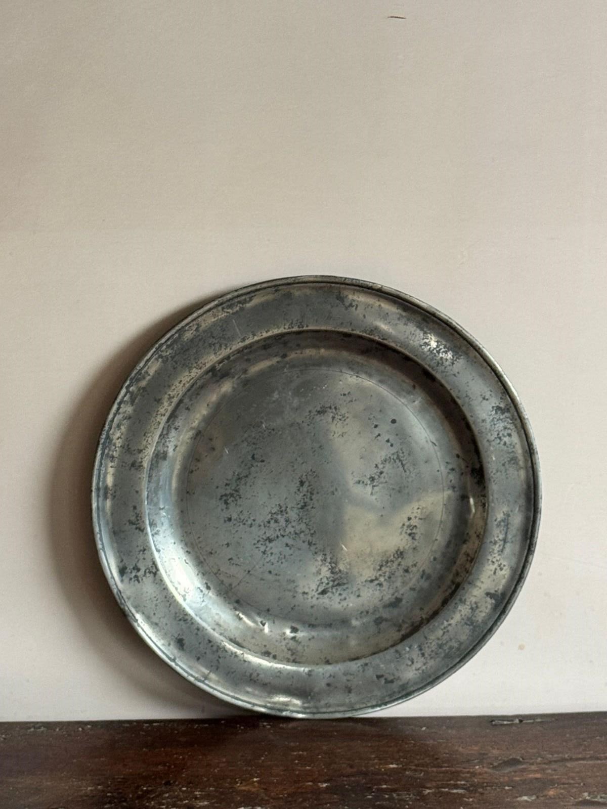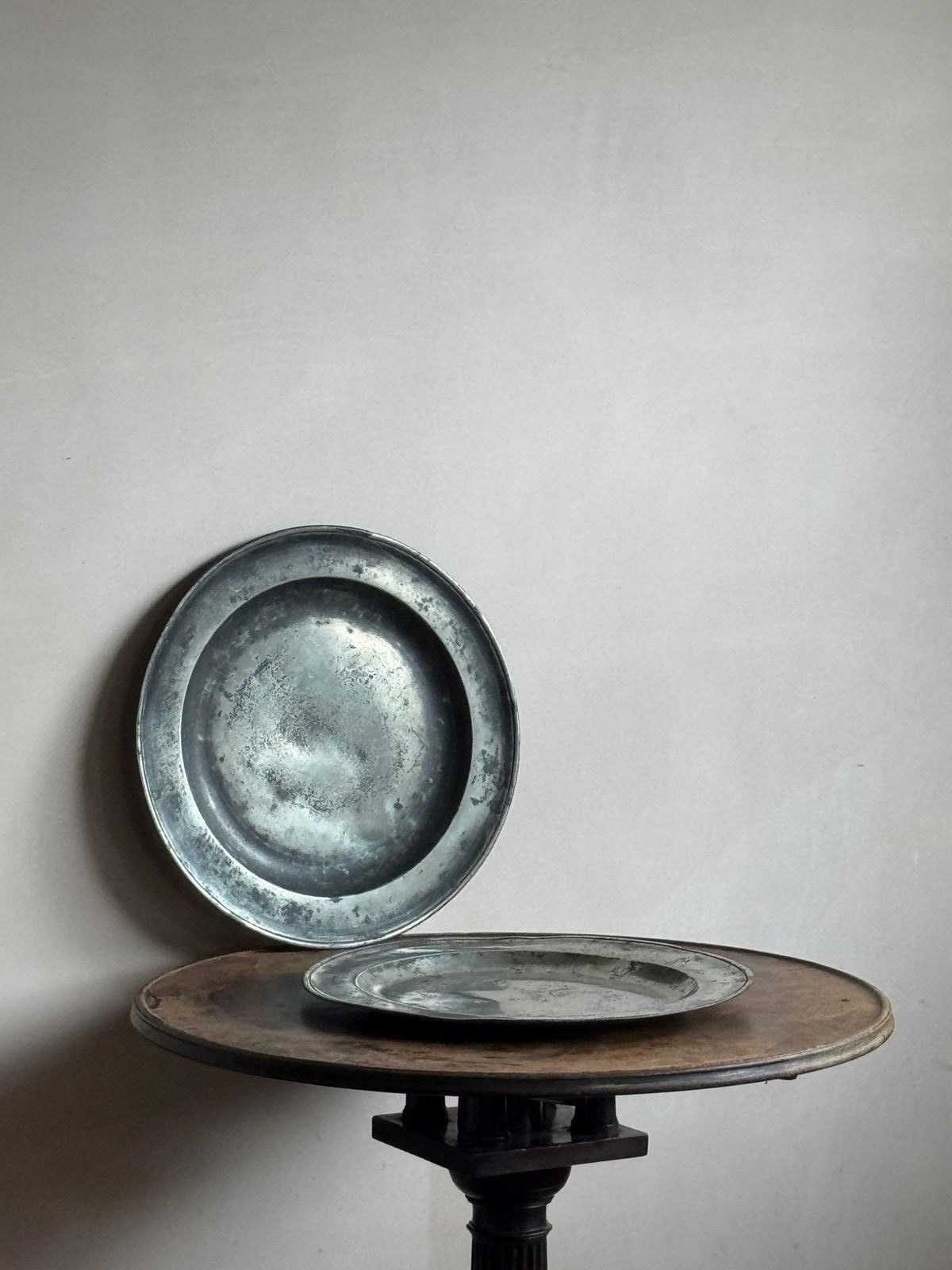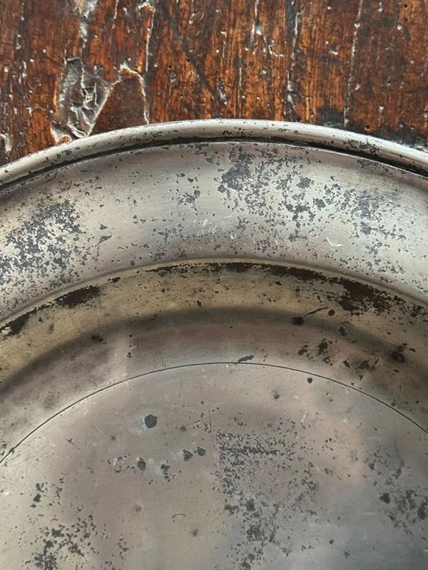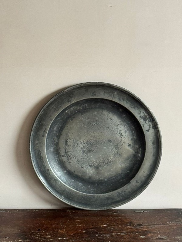 Two 15” pewter chargers, one with a London touch mark C.1700