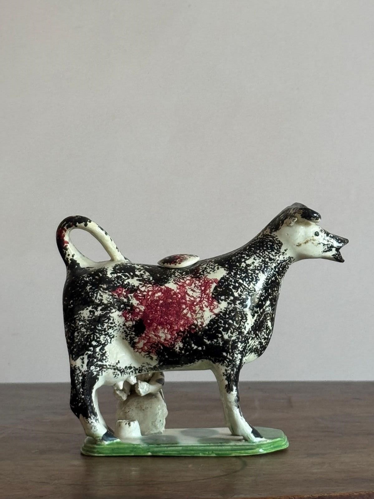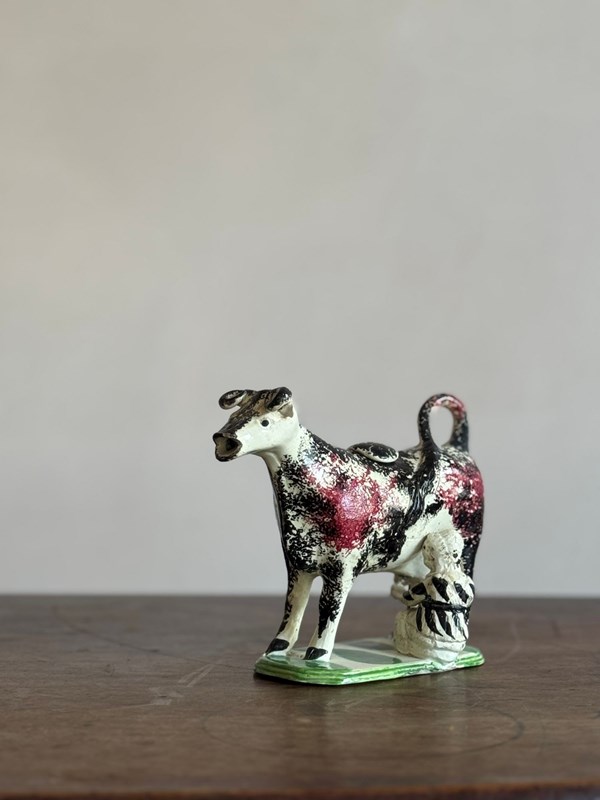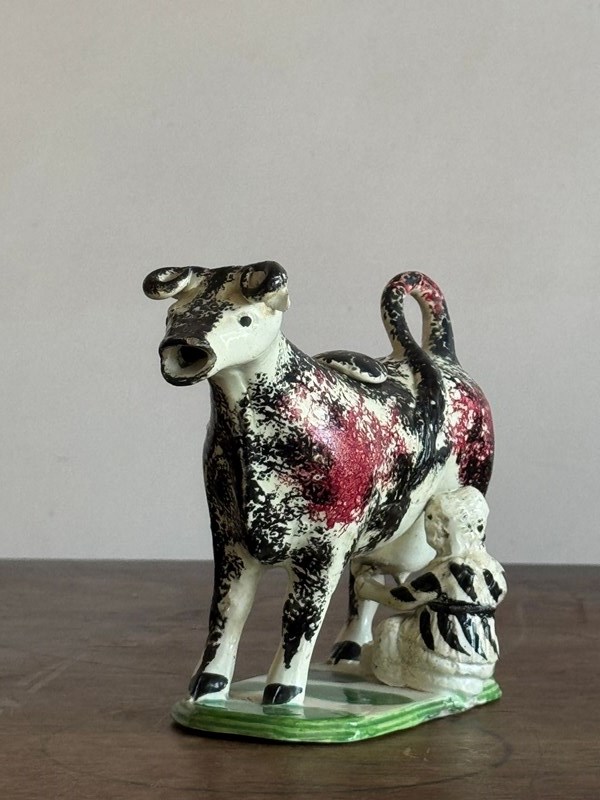 An English (probably Staffordshire) pottery prattware cow creamer with milk maid, sponge decorated in black and red. Dimensions: H 11cm W 18cm D 6cm