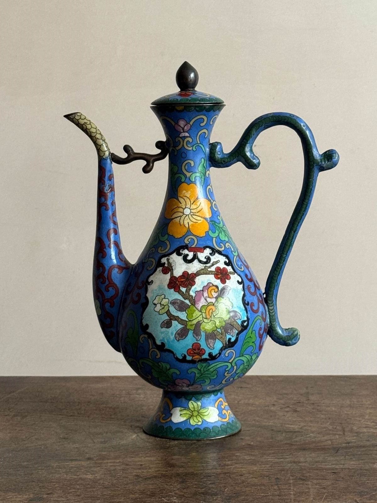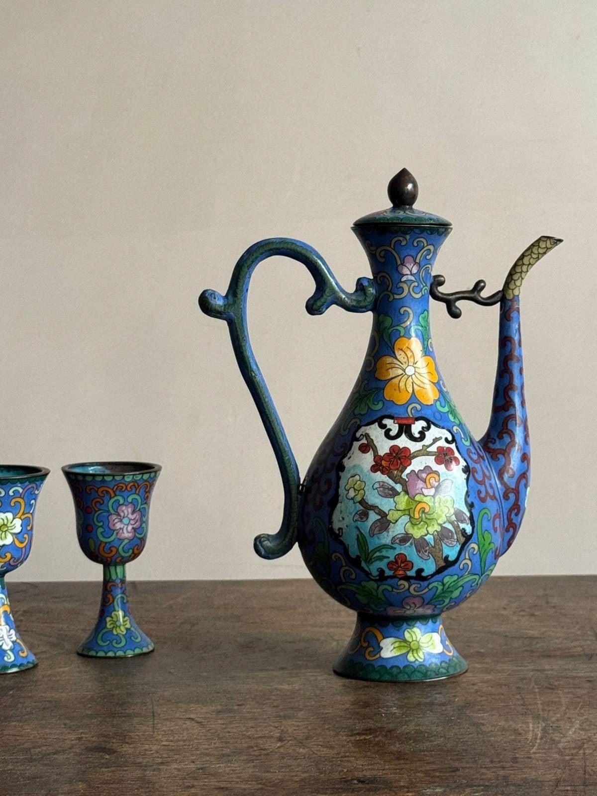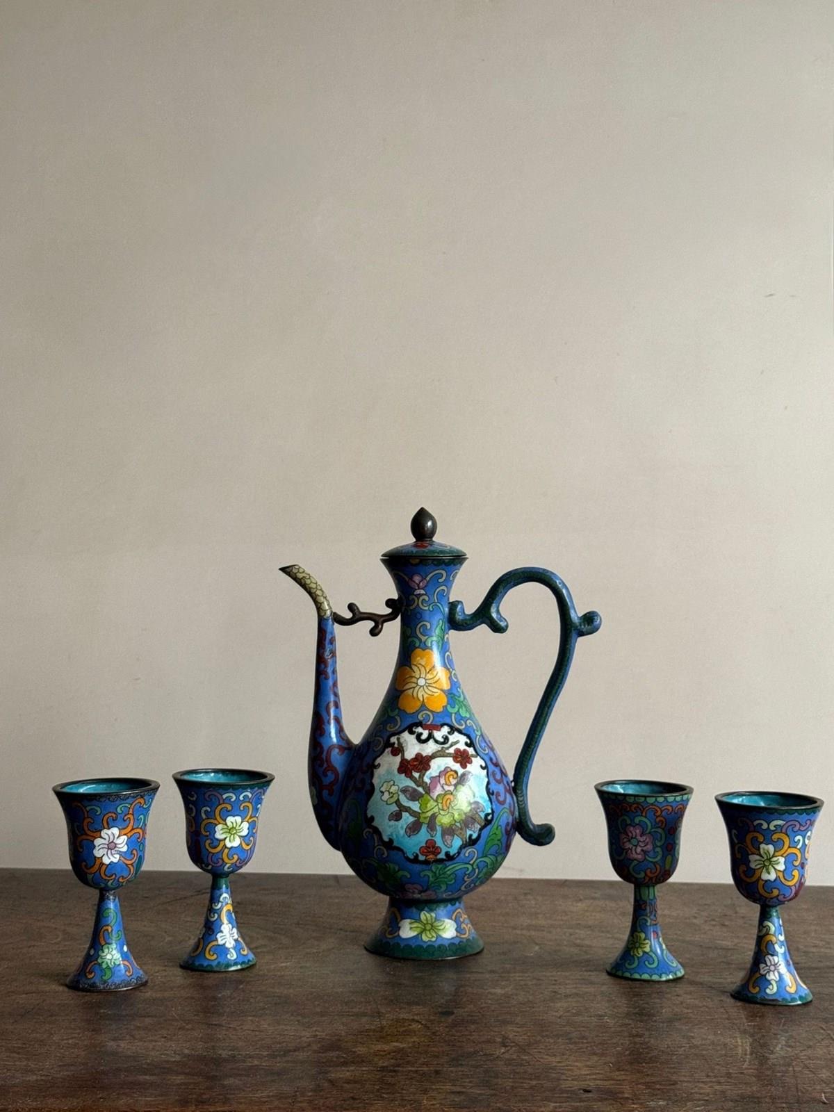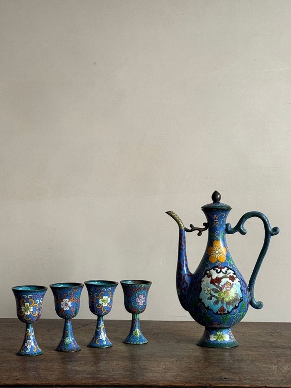 A 20thC Chinese cloisonné enamel ewer with four stem cups in the Ming style.