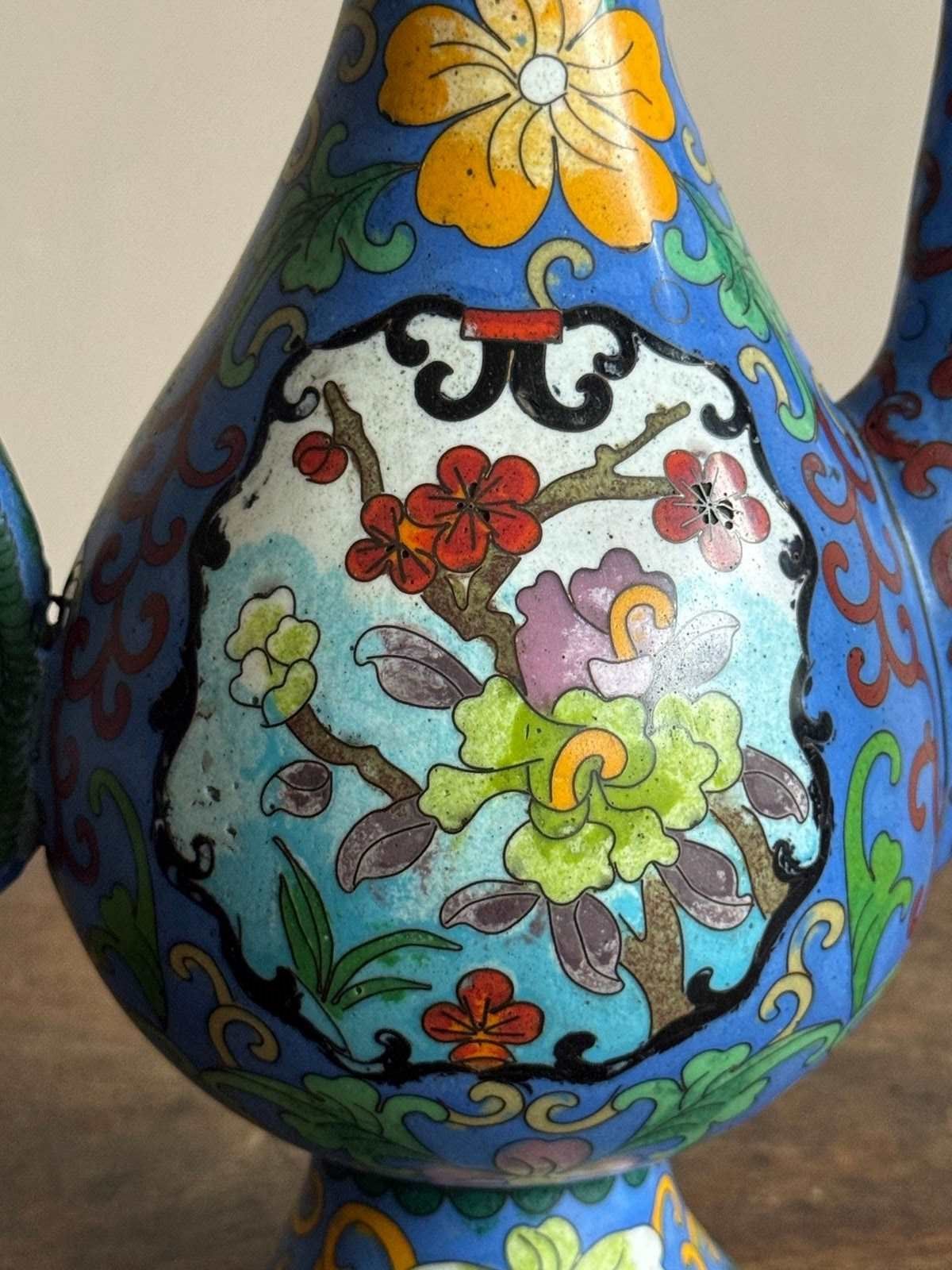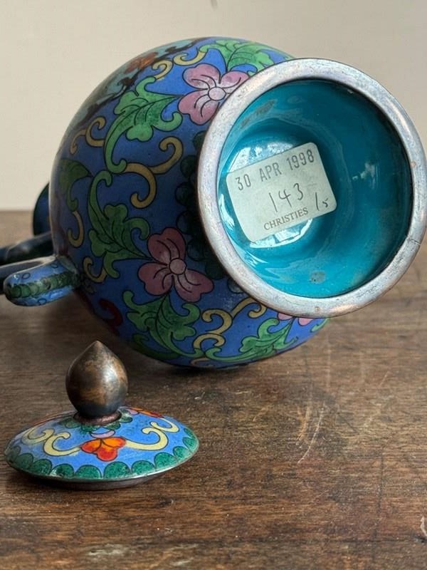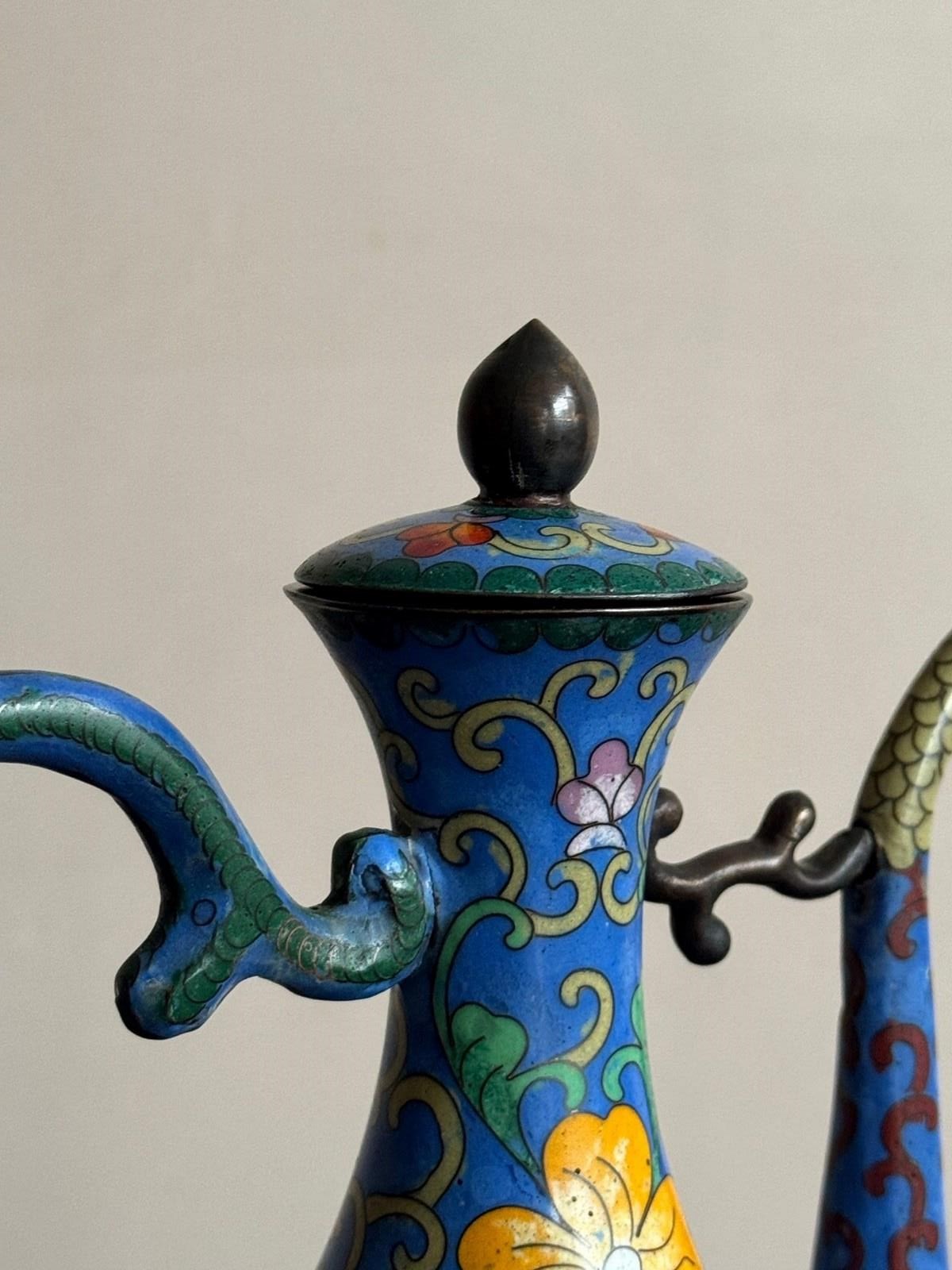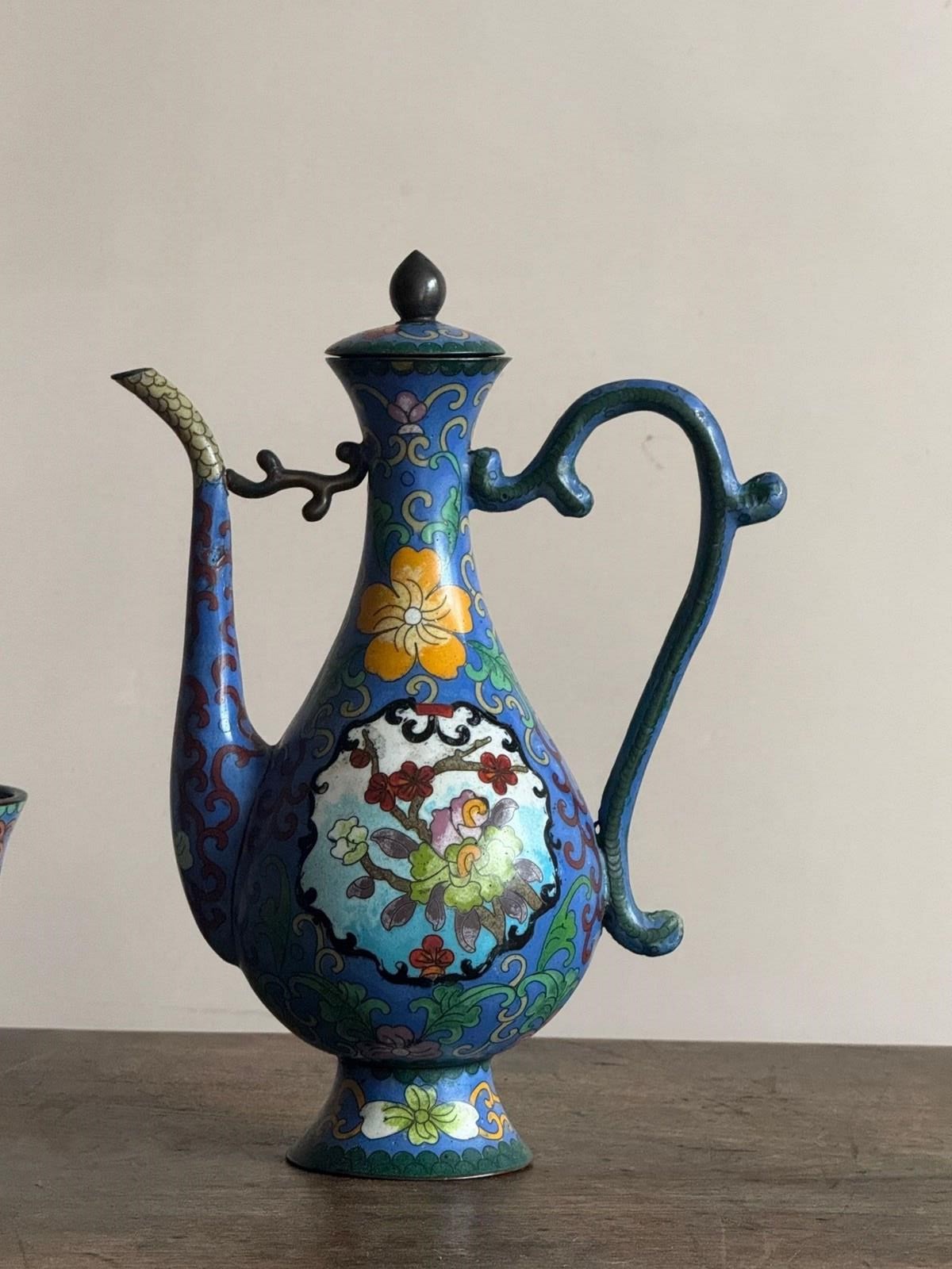A 20thC Chinese cloisonné enamel ewer with four stem cups in the Ming style.