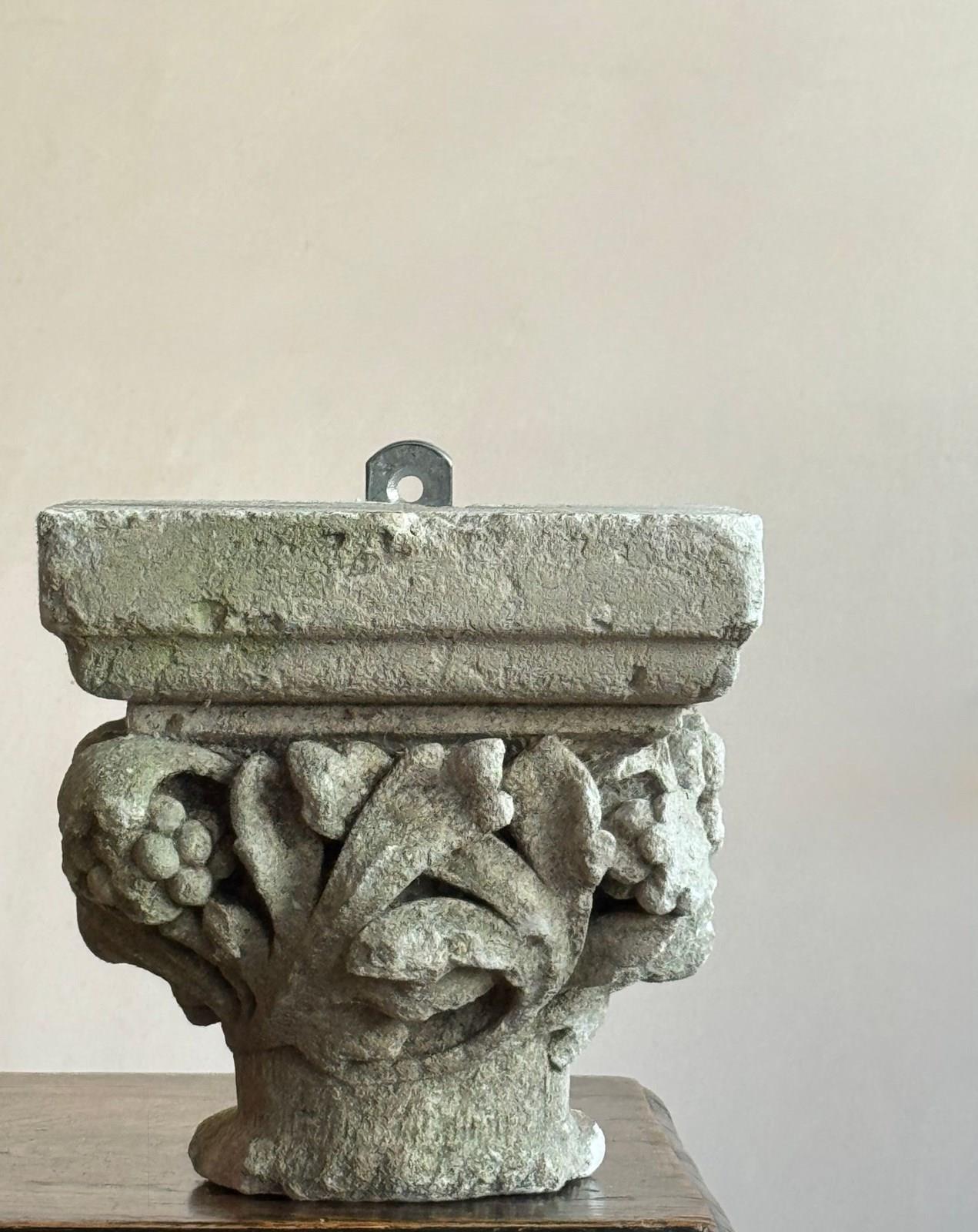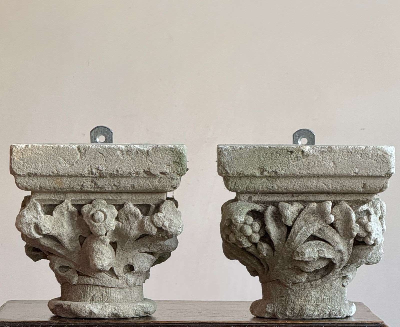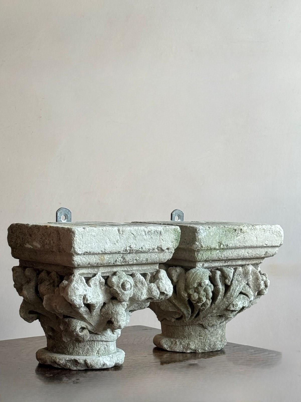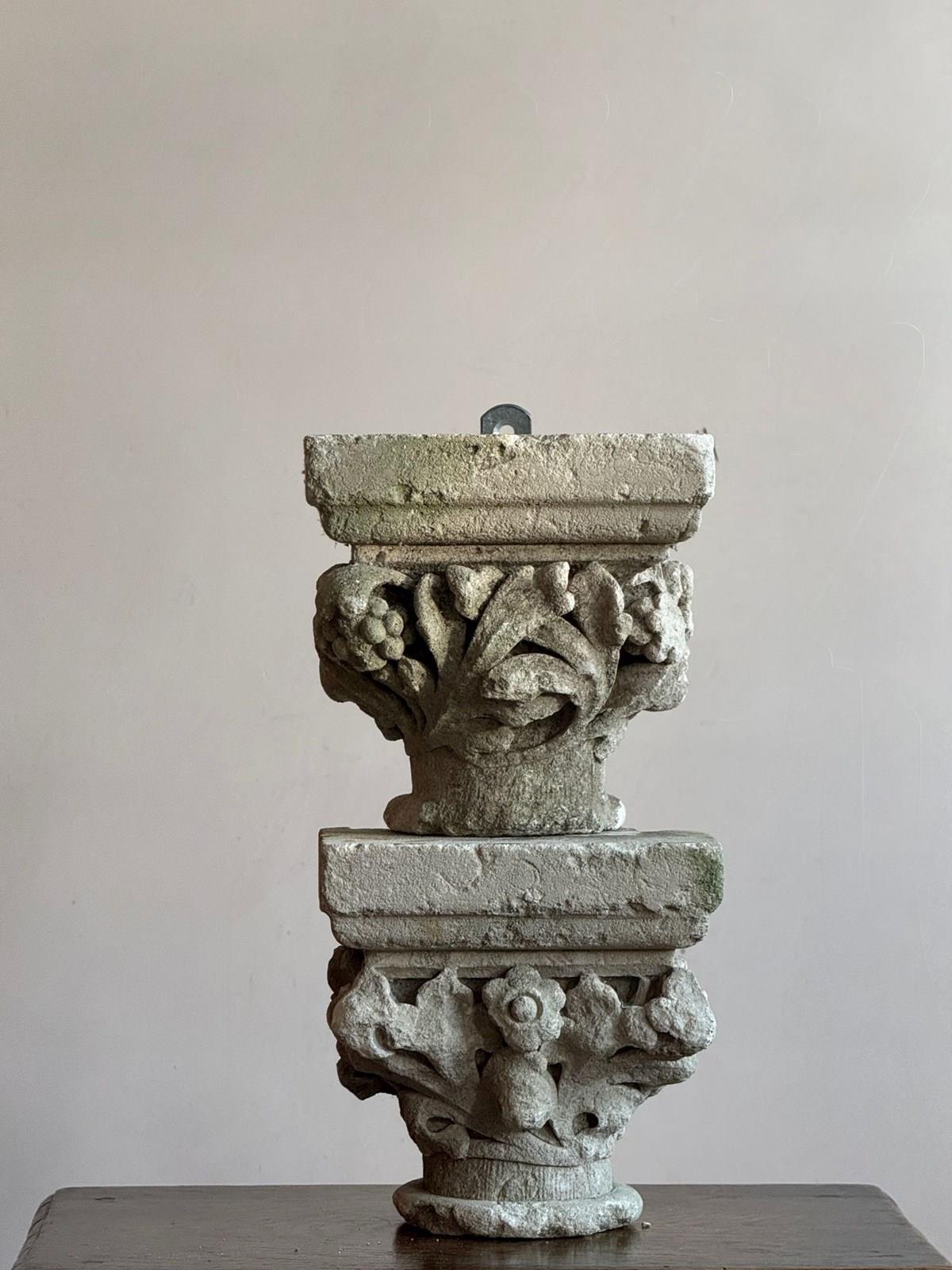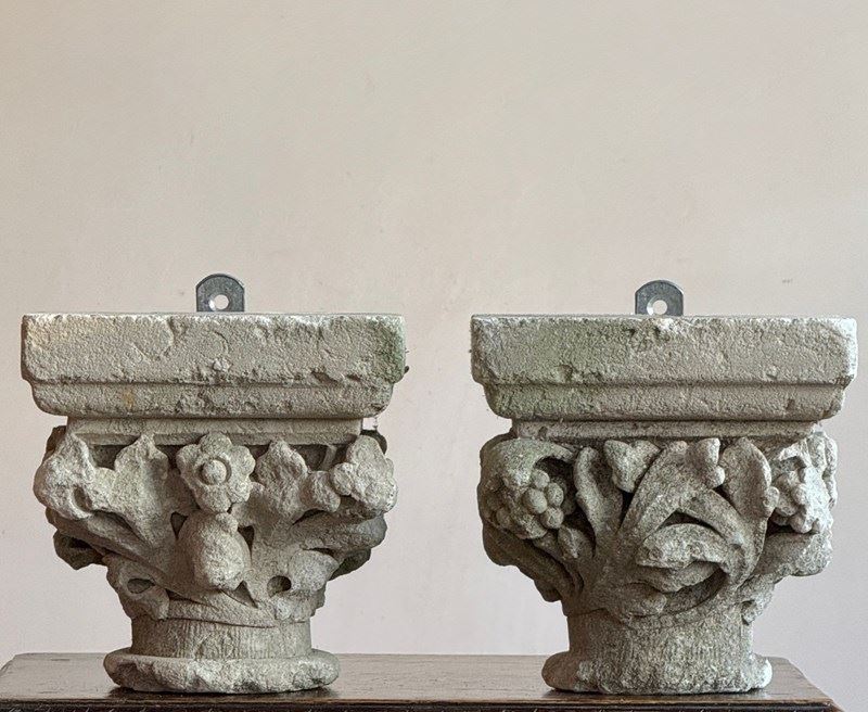 A pair of early carved limestone capitals, the Calathus and Helices formed by foliage, berries and flowers. Likely from an ecclesiastical setting.