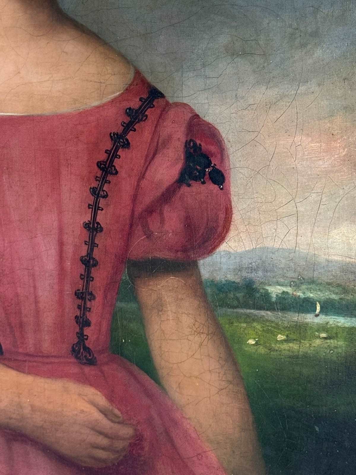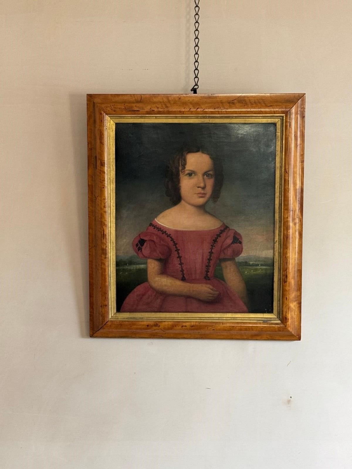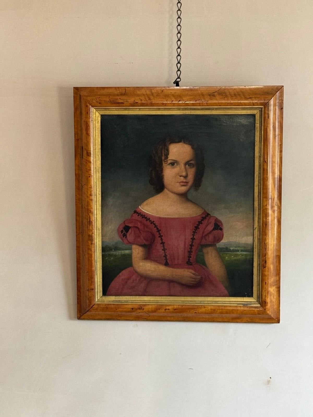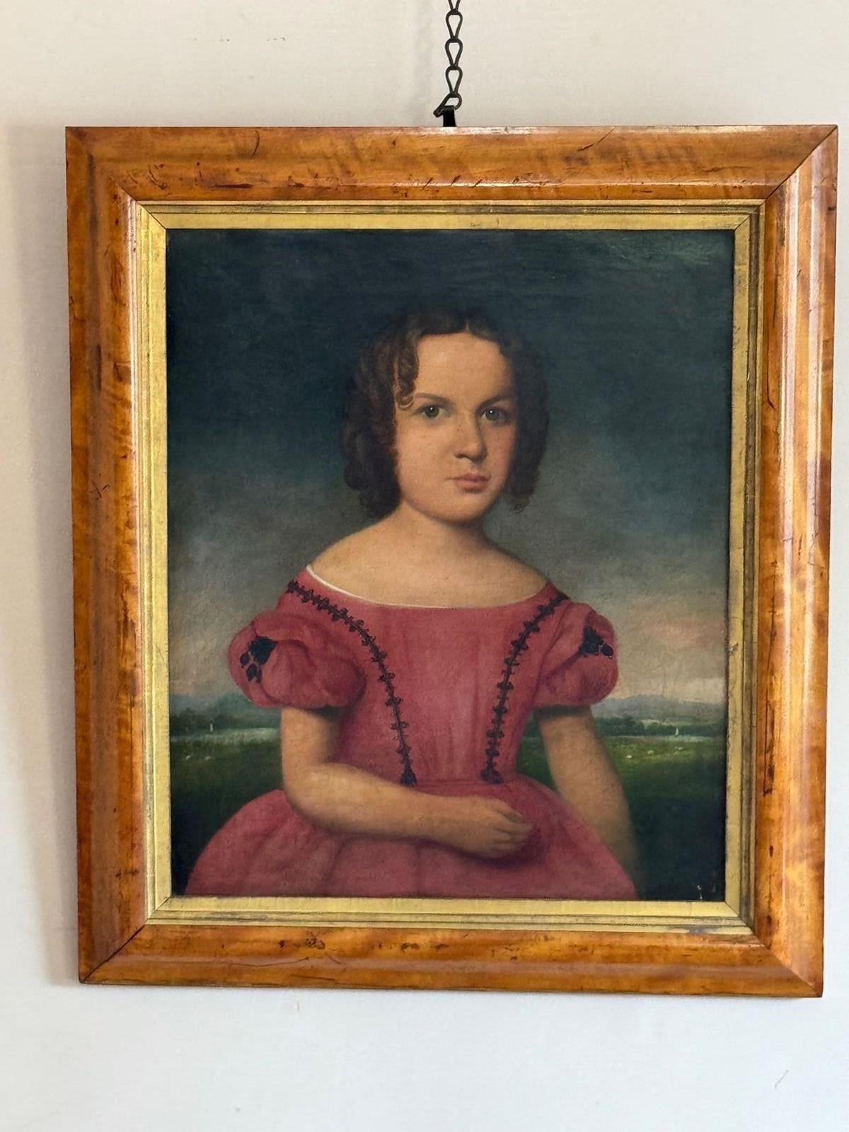 English naive school portrait - A young girl in a pastoral landscape in a cushioned maple frame. C.1835-40 Dimensions; H 76.5cm