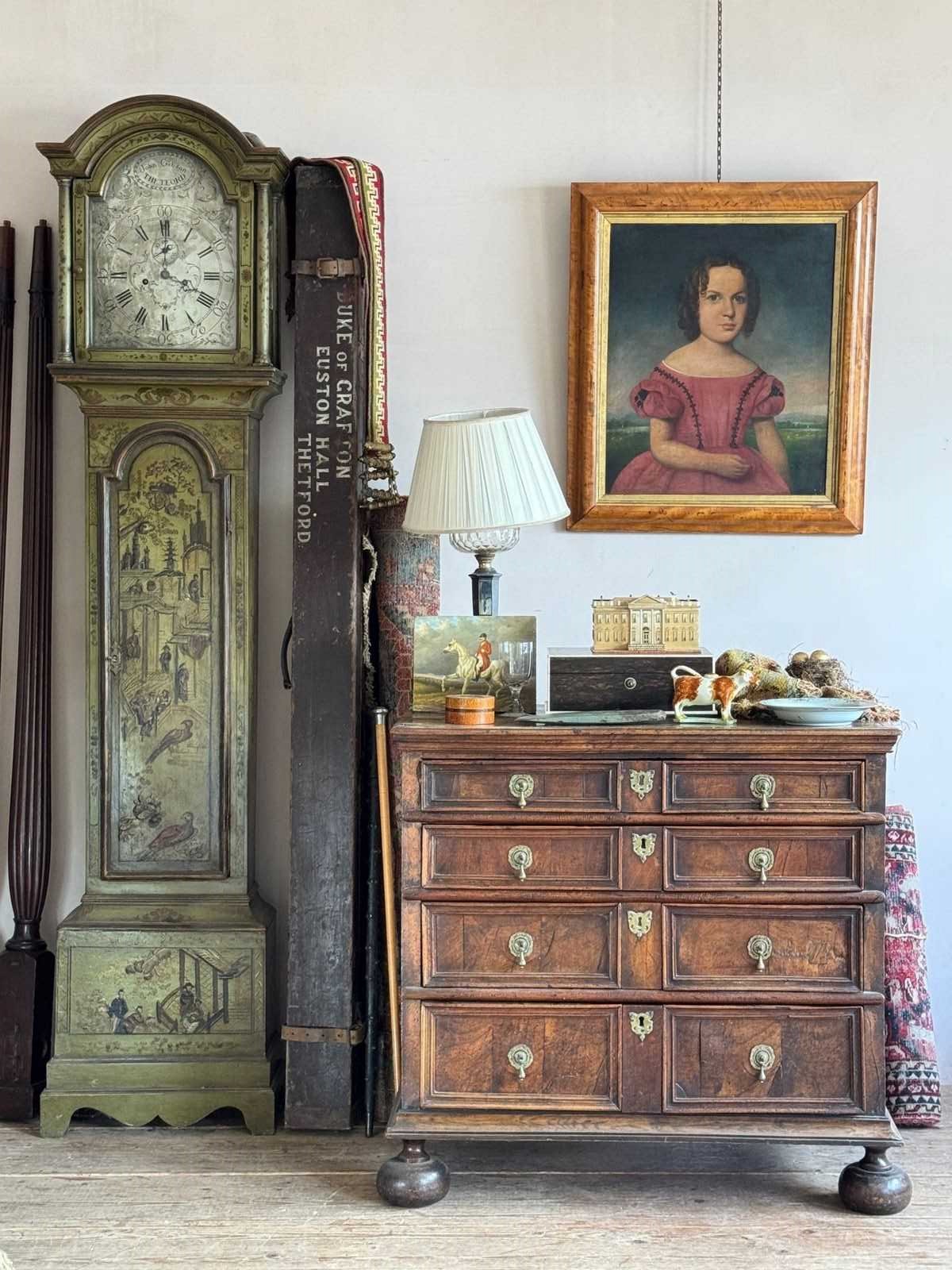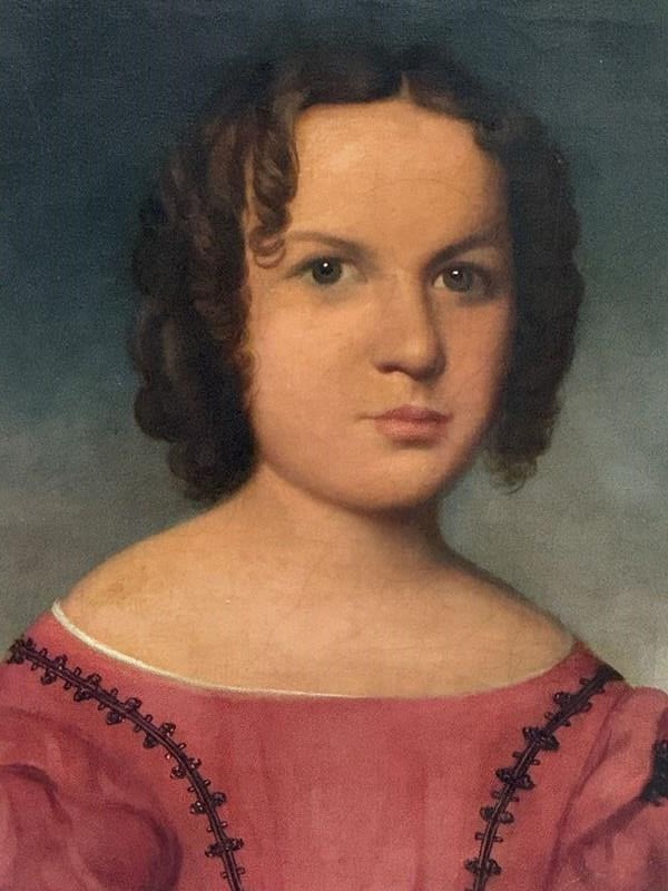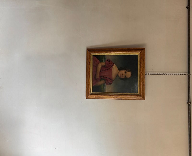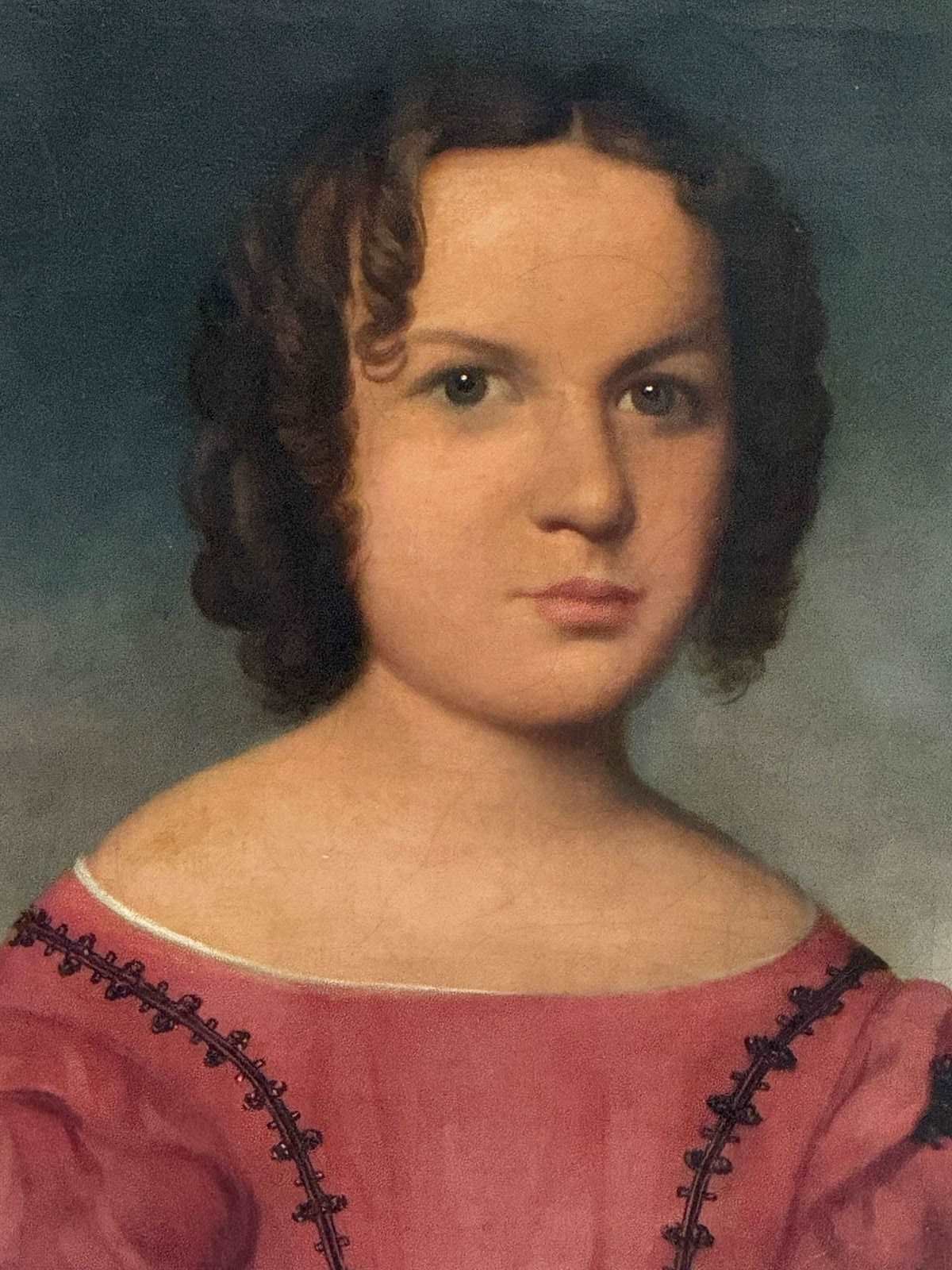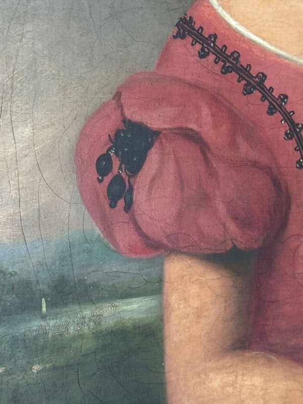 English naive school portrait - A young girl in a pastoral landscape in a cushioned maple frame. C.1835-40 Dimensions; H 76.5cm