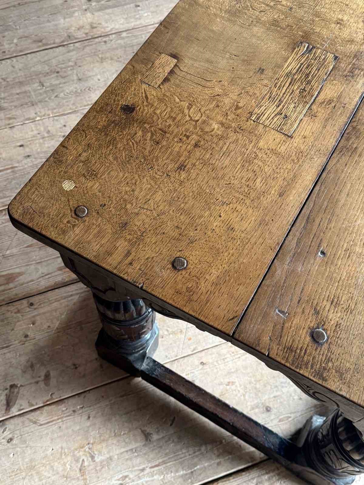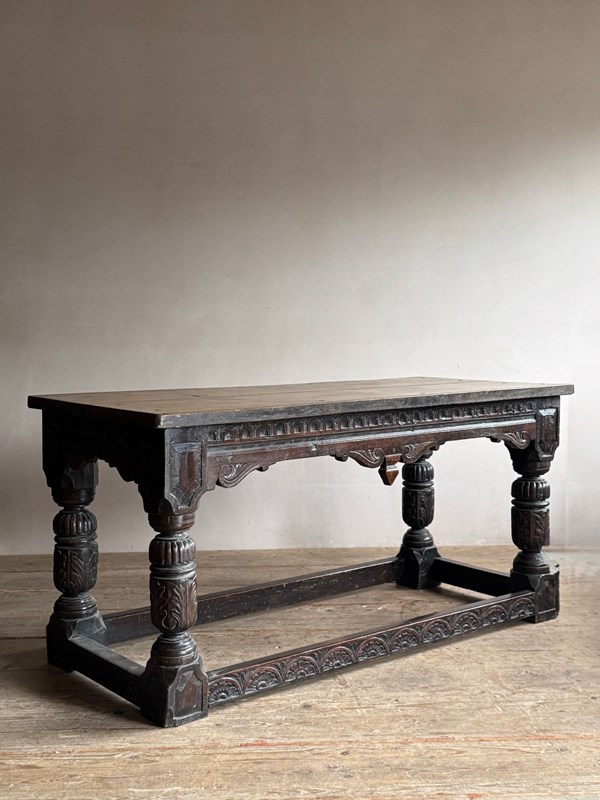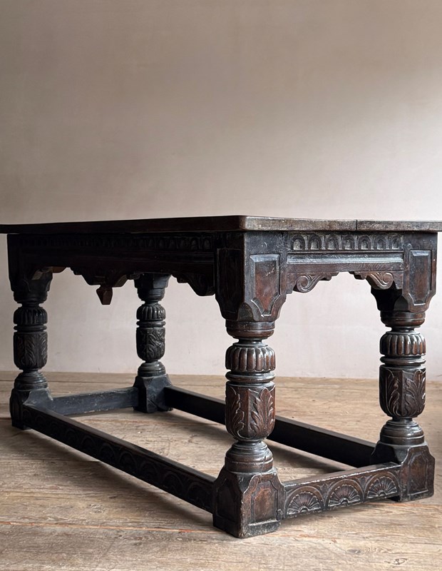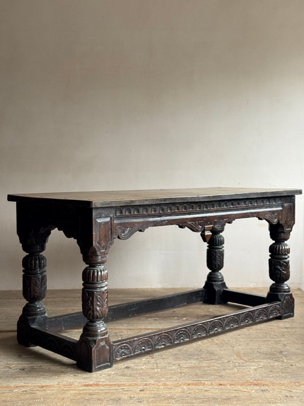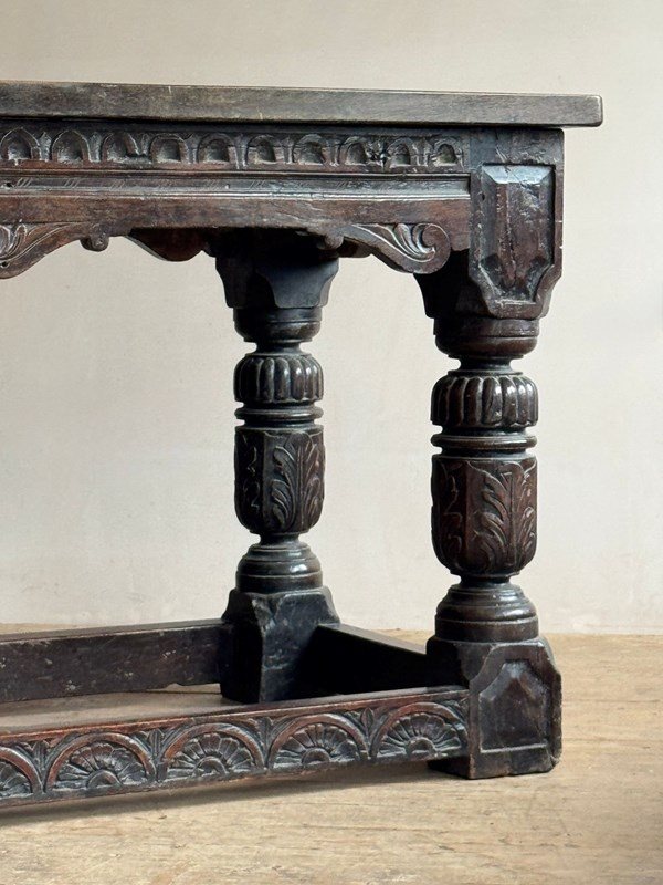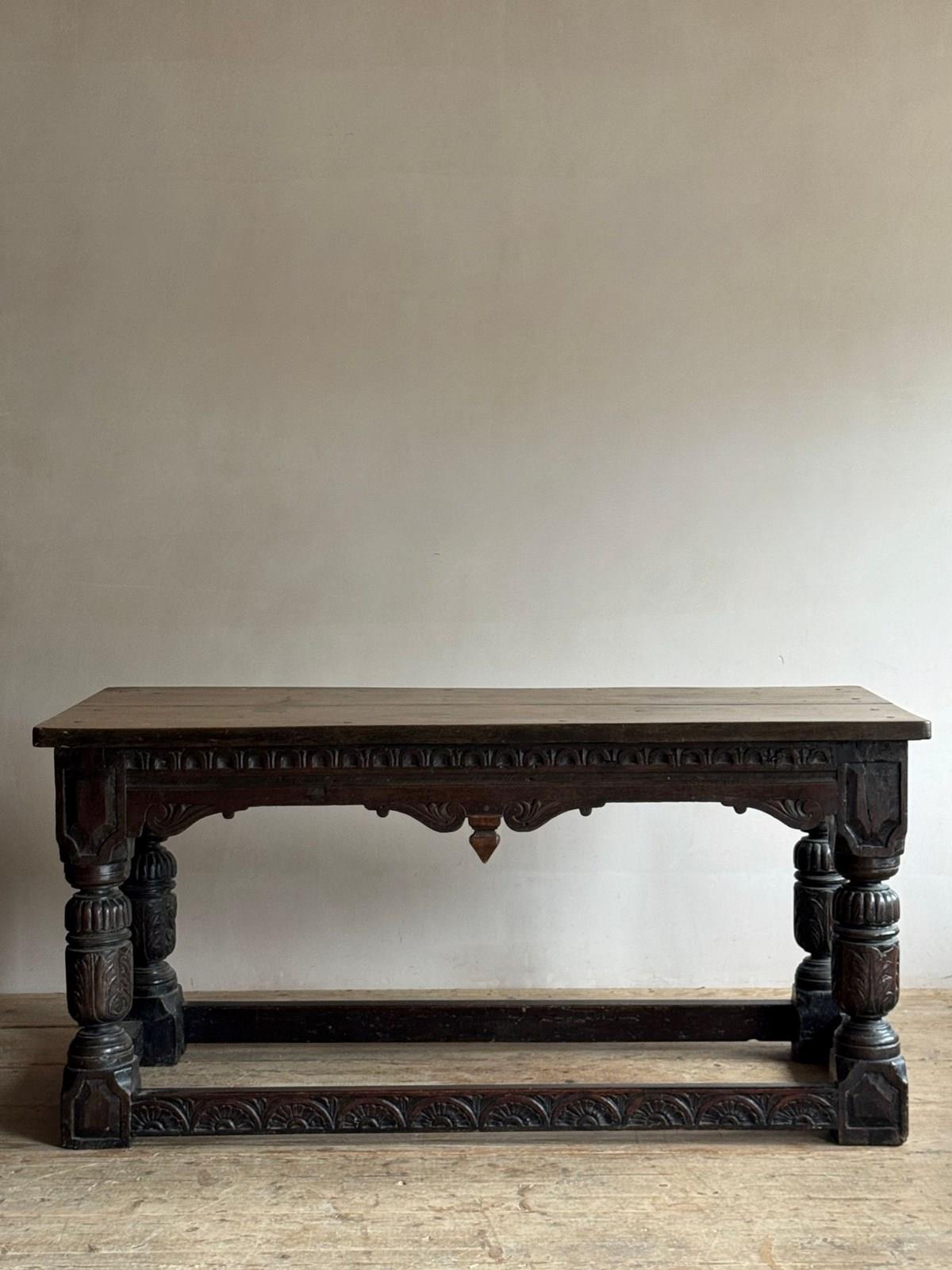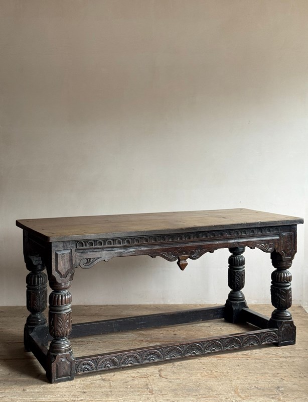 A carved oak table with a full stretcher and nulled frieze. Very heavy and solid with a good thick top. This likely dates from the 19thC incorporating earlier 18thC elements.