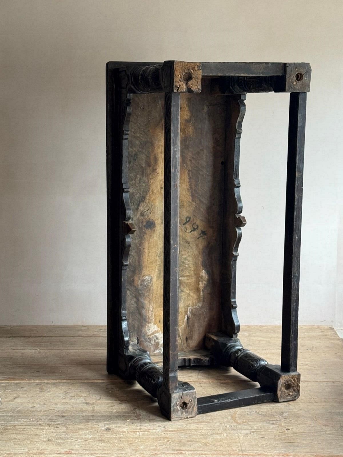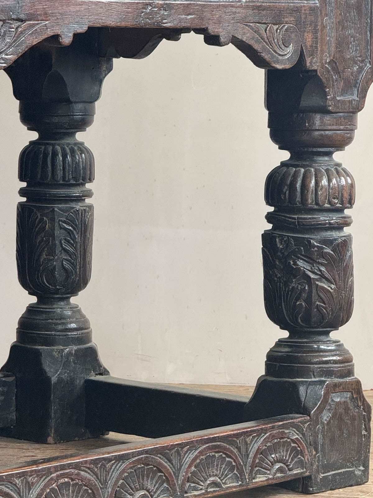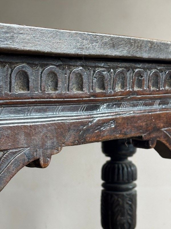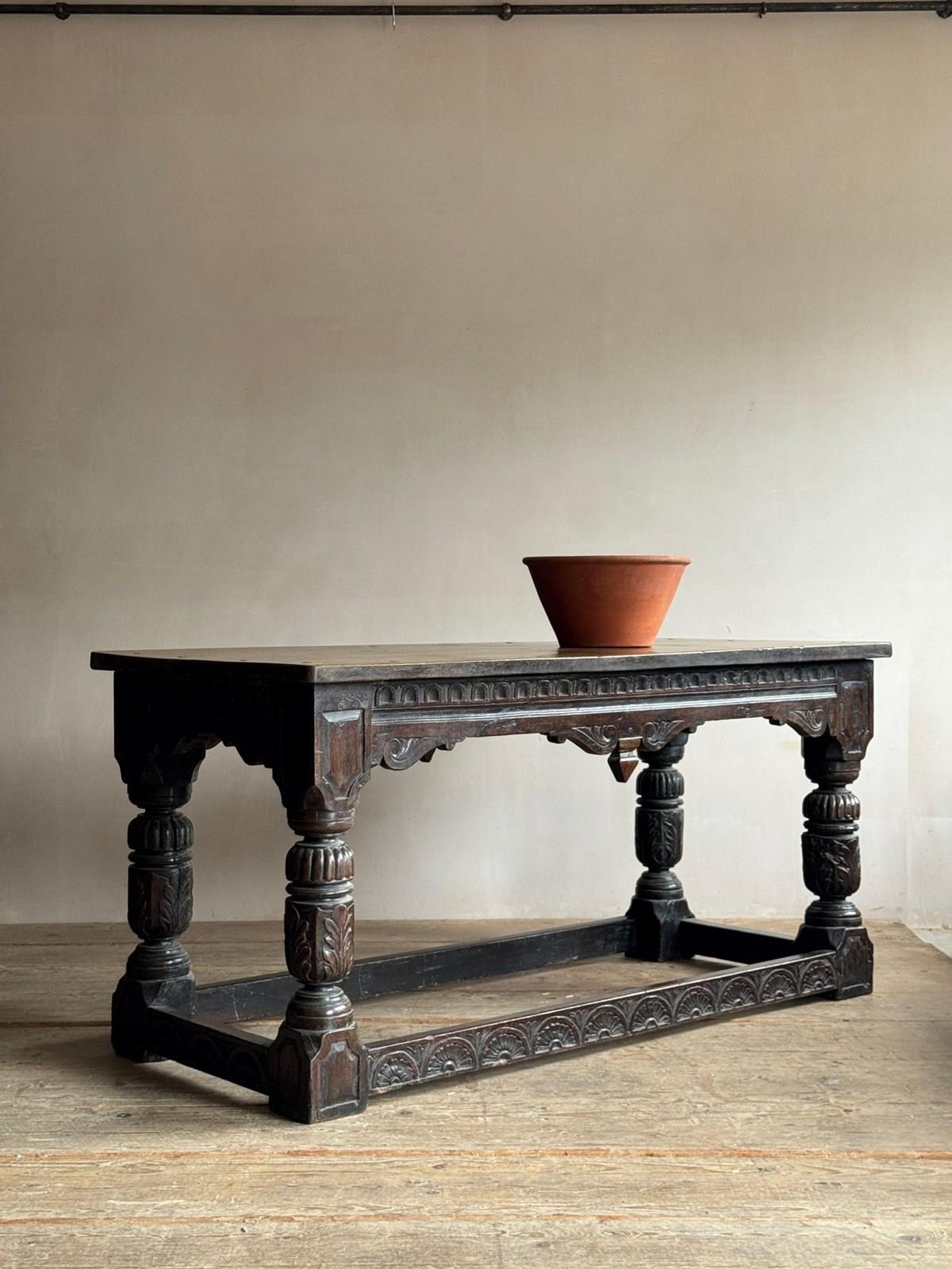 A carved oak table with a full stretcher and nulled frieze. Very heavy and solid with a good thick top. This likely dates from the 19thC incorporating earlier 18thC elements.