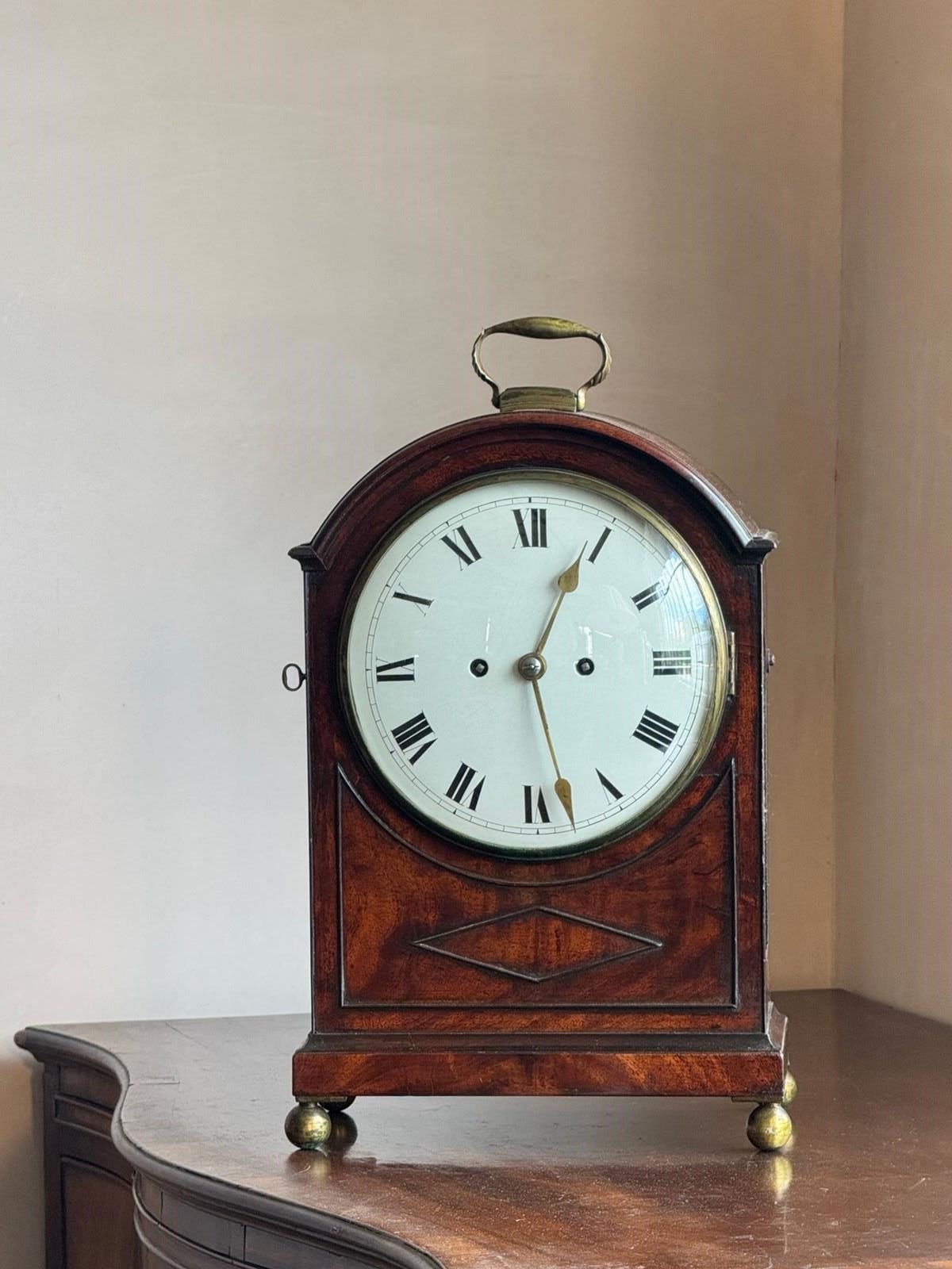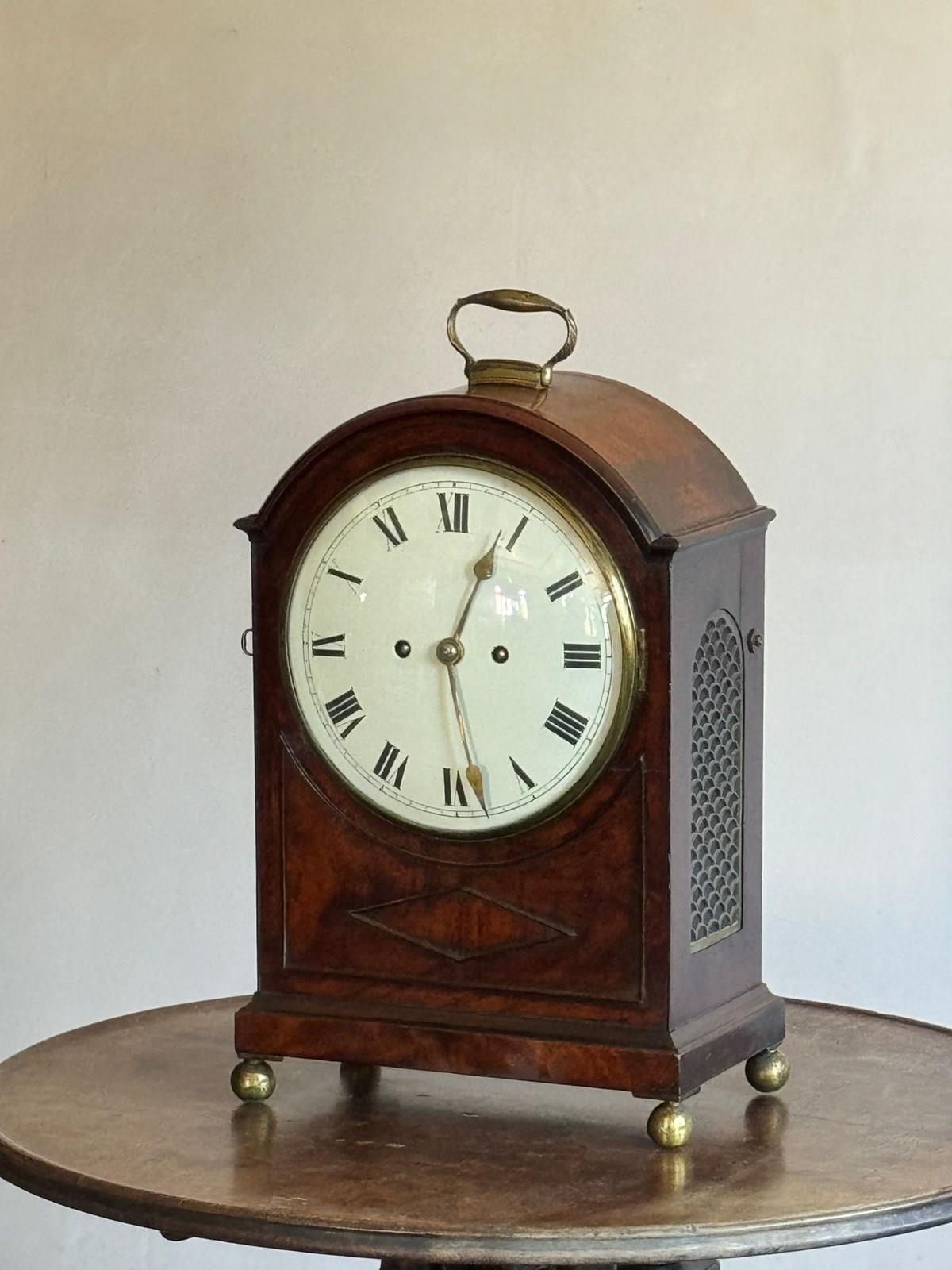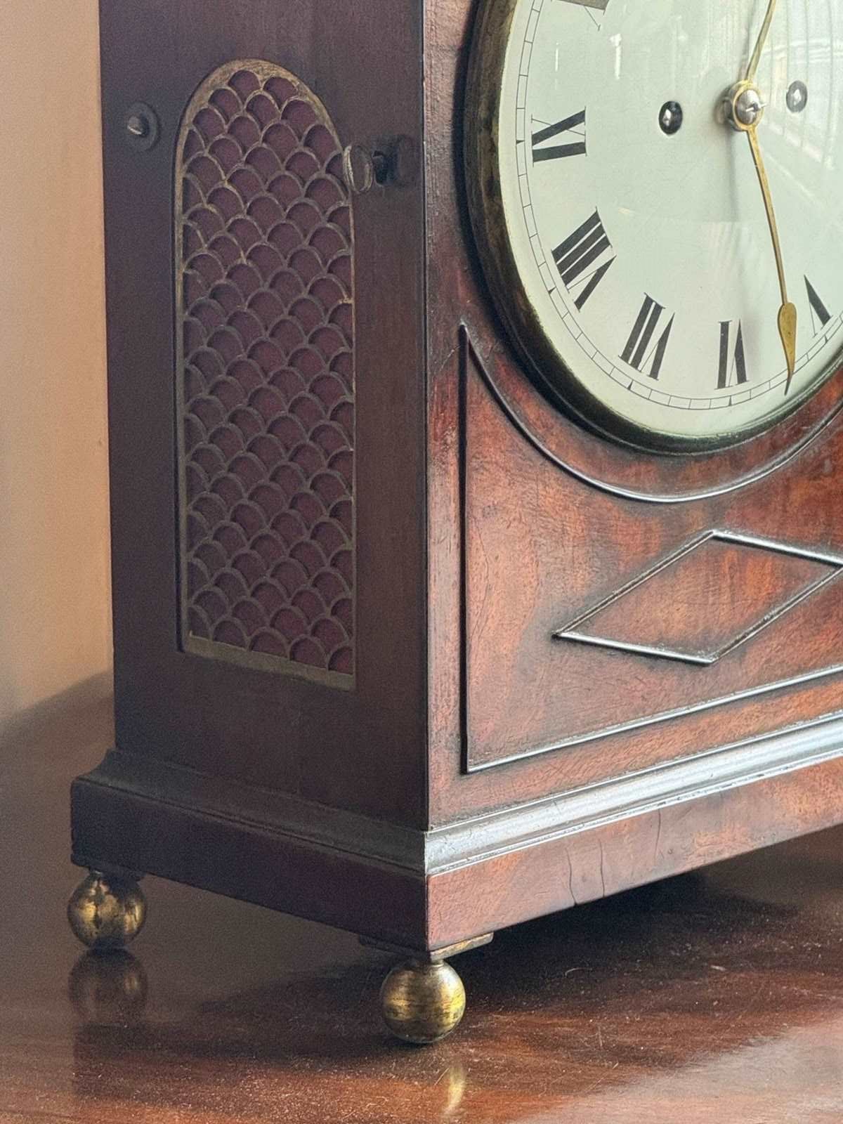 An early 19thC bracket / table clock with 8 day double fusee movement. The mahogany break arch case with with mouldings applied is a lovely deep colour and it is excellent original condition all round. Dimensions: H 47cm W 27cm D 17cm Dial 21cm