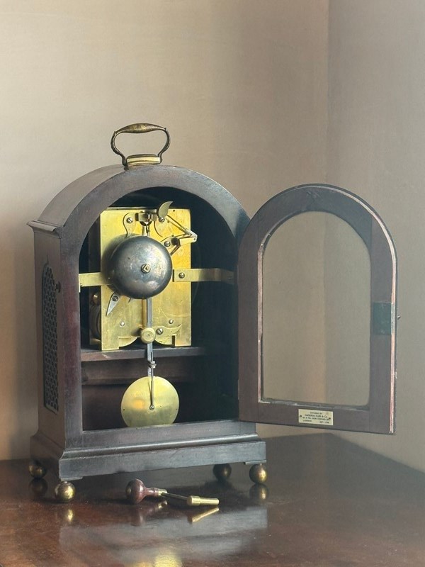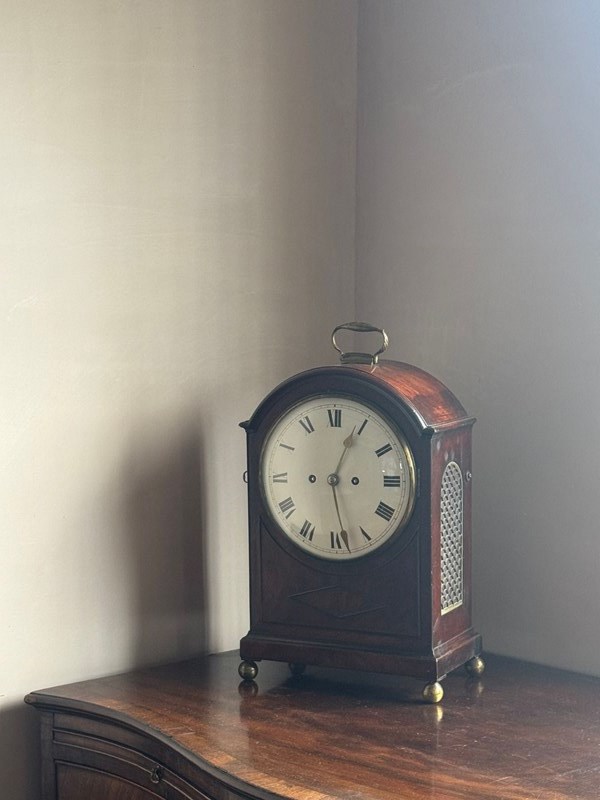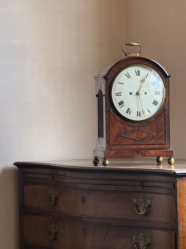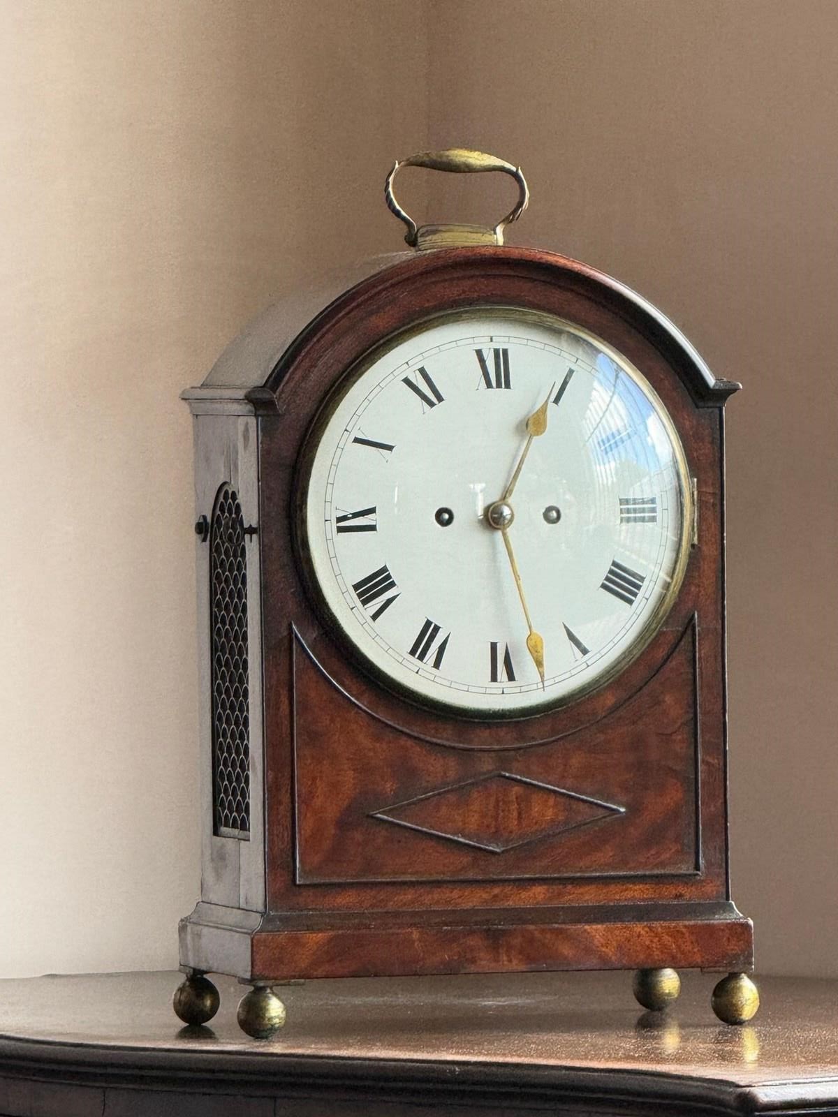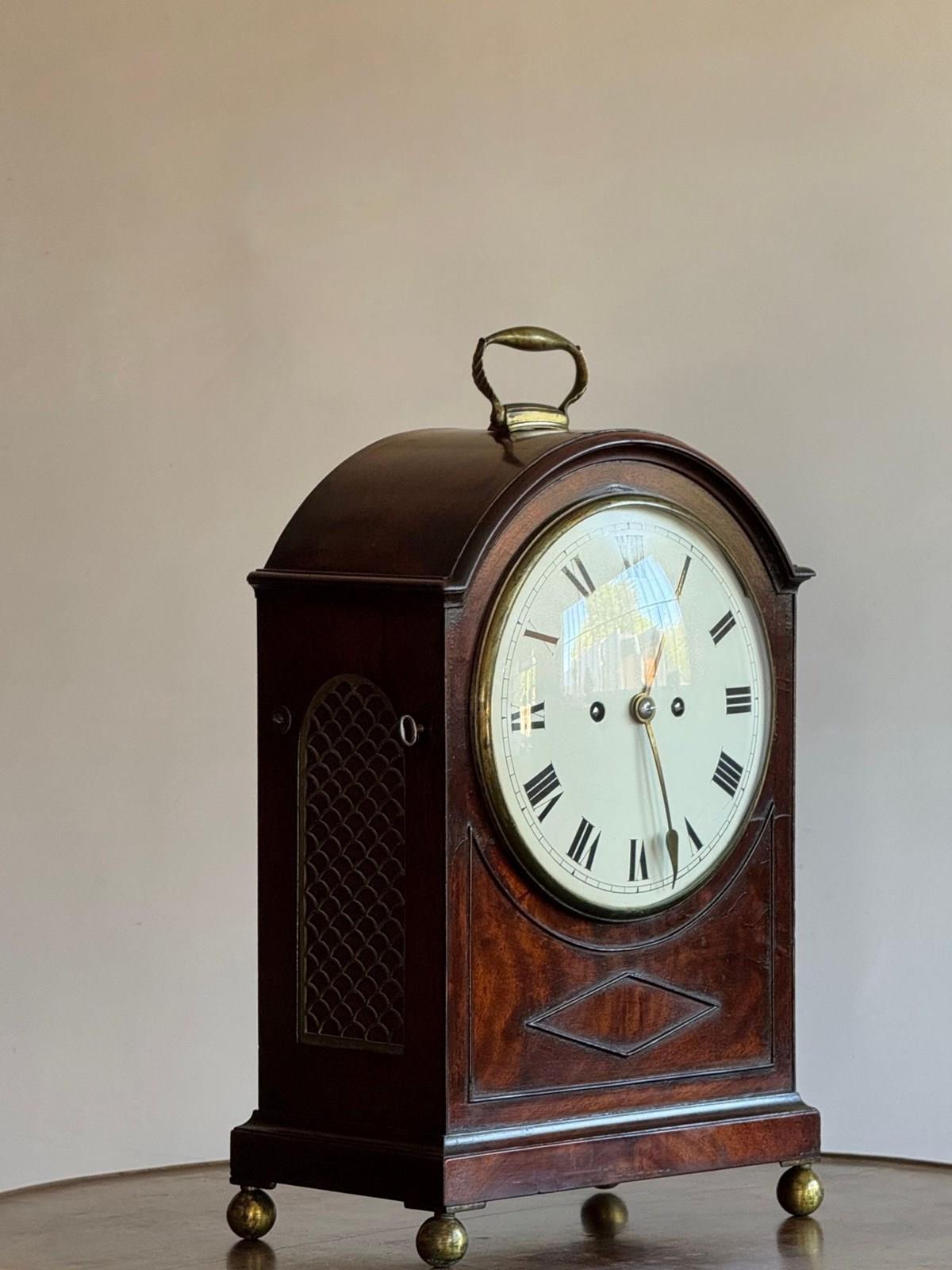 An early 19thC bracket / table clock with 8 day double fusee movement. The mahogany break arch case with with mouldings applied is a lovely deep colour and it is excellent original condition all round. Dimensions: H 47cm W 27cm D 17cm Dial 21cm