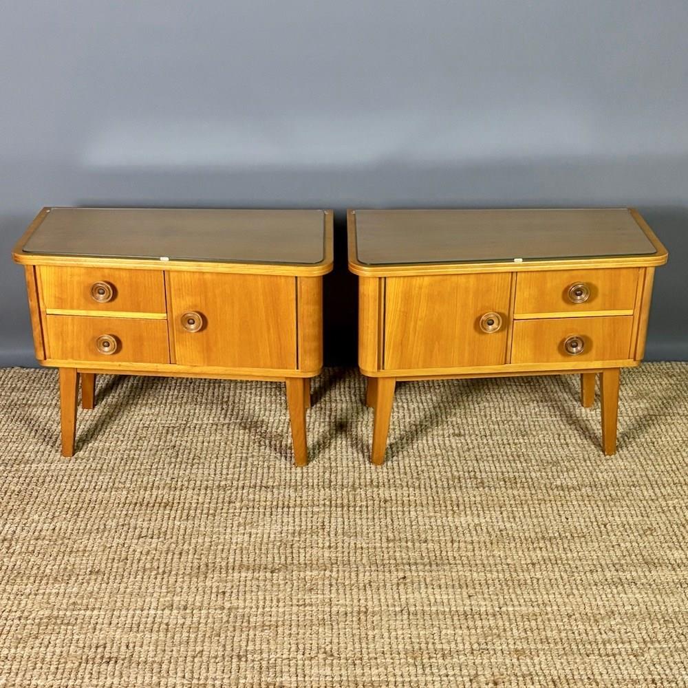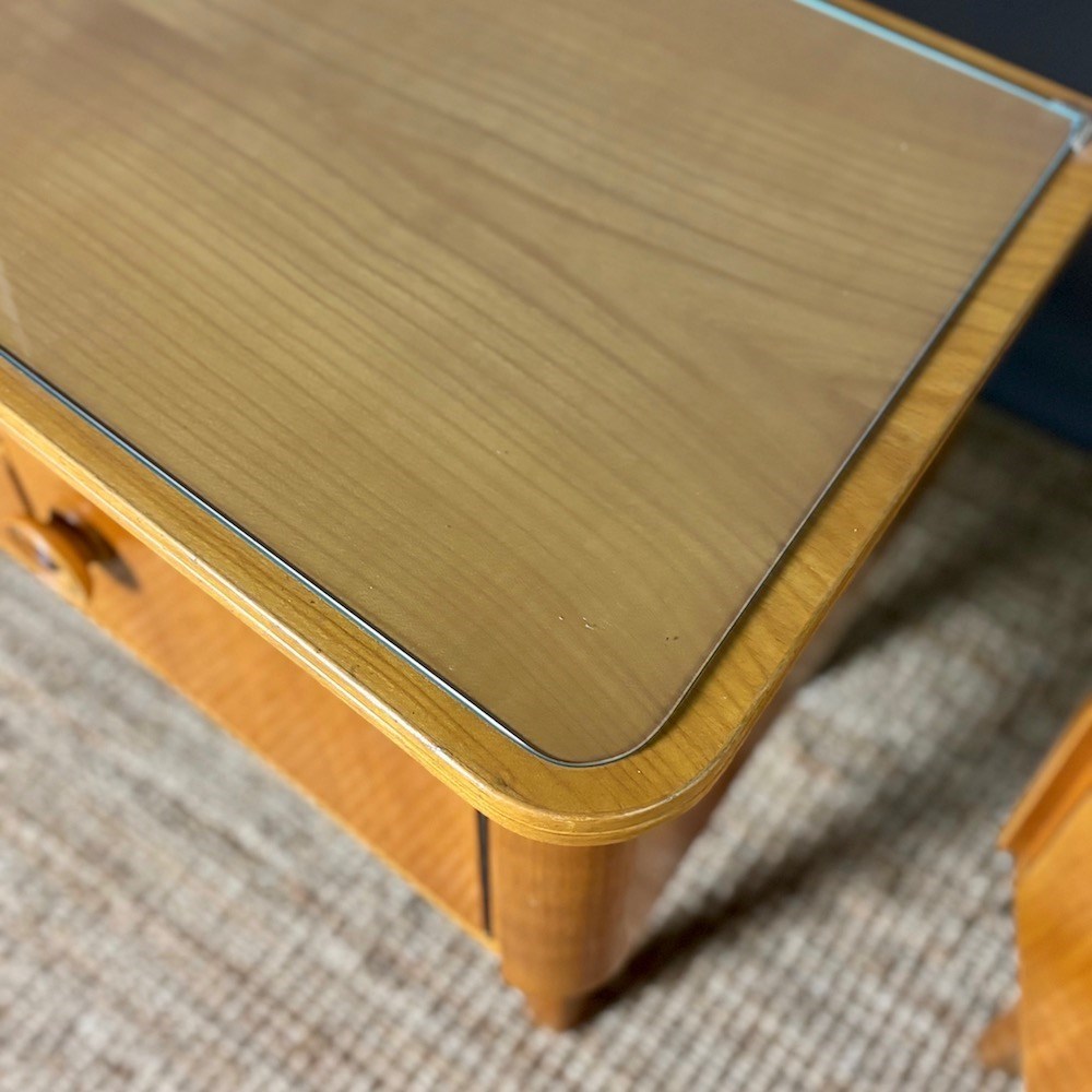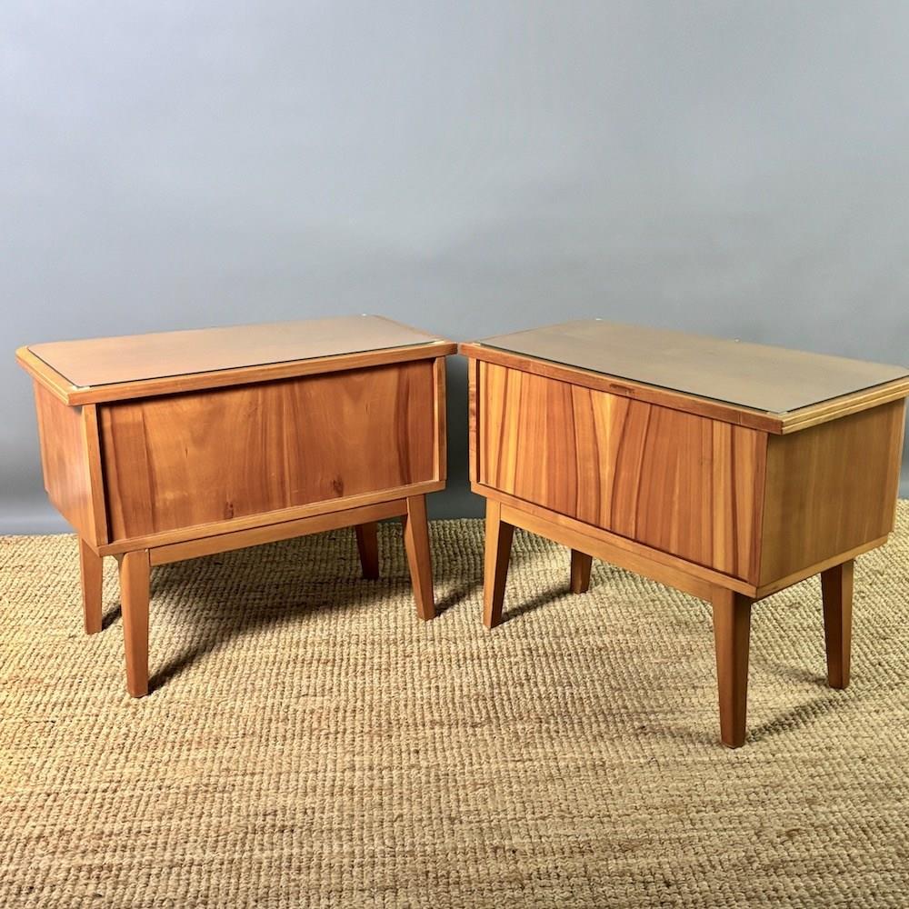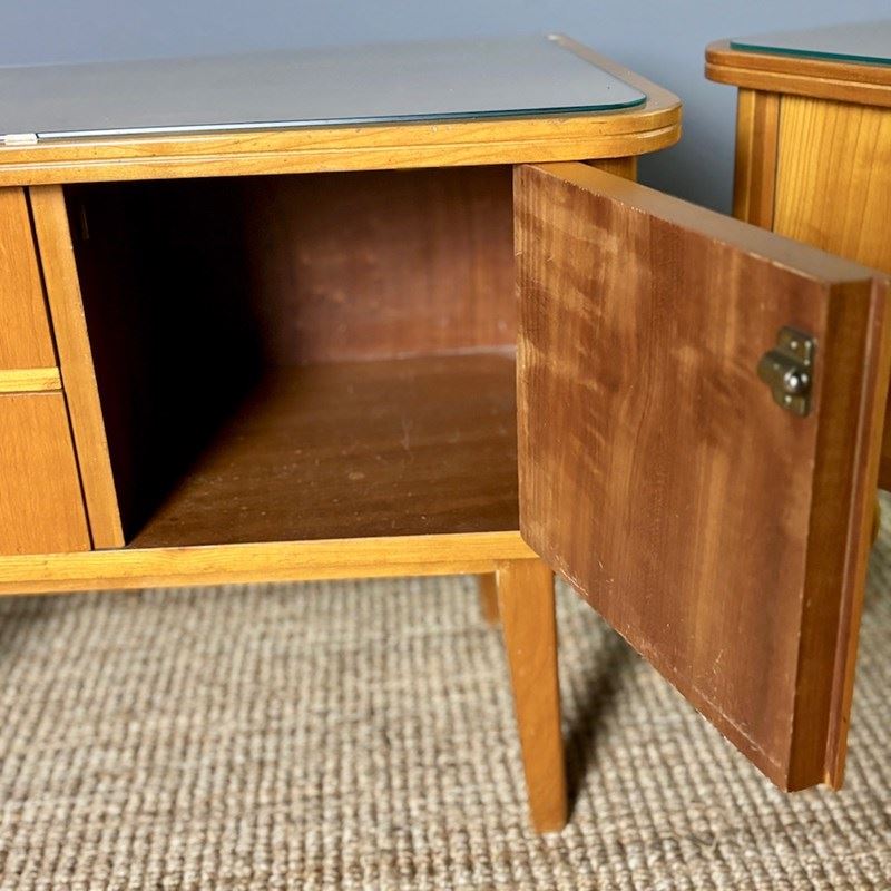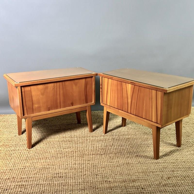 A stunning pair of vintage mid-century modern nightstands in cherrywood , showcasing the clean lines and functionality popular in the 1960s. The design is characteristic of the sought-after Scandinavian and European aesthetic of the period. Each table is designed with a practical layout : two smooth gliding drawers and a side cabinet. The elegantly tapered legs are a hallmark of the era's design.The original knobs have inlaid round brass rings and a brass centre stud. The top surface has a protective glass sheet held in place by small brasscorners.