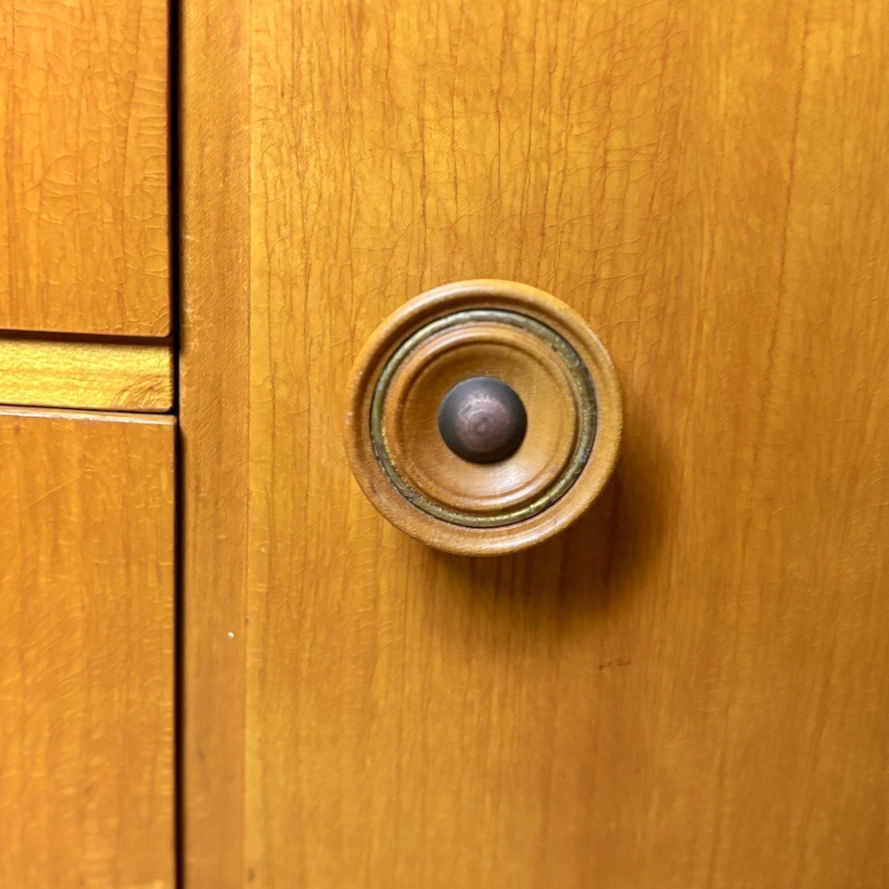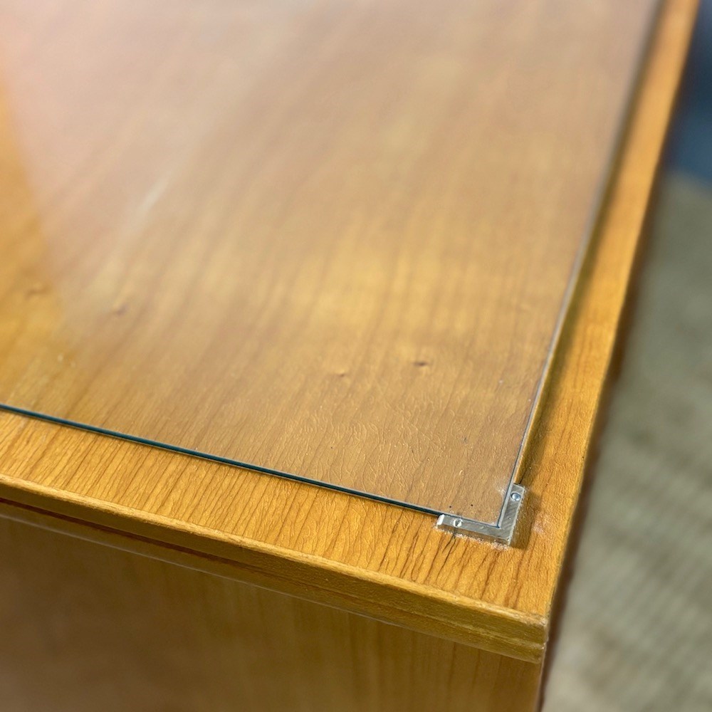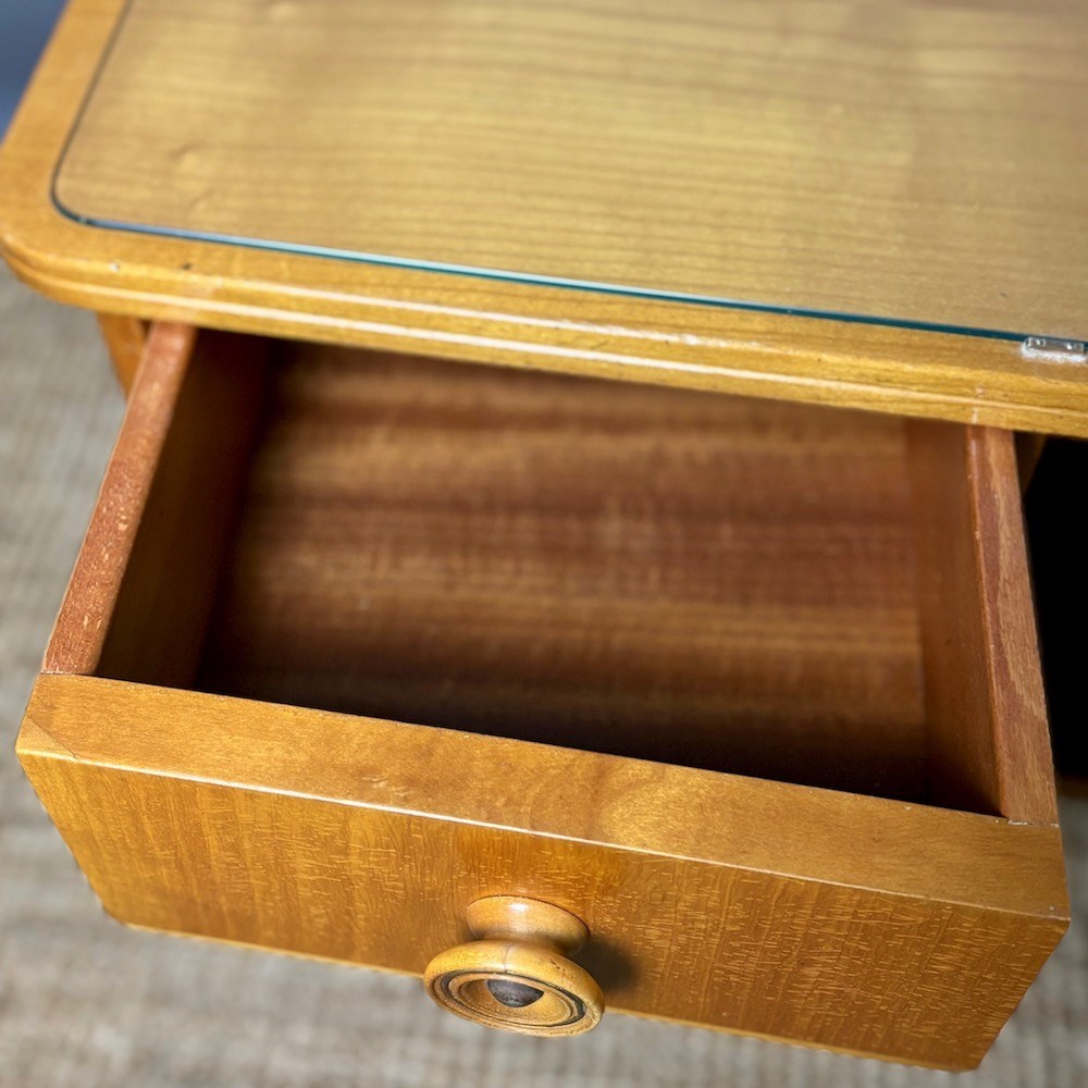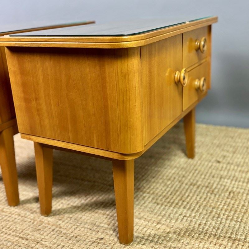 A stunning pair of vintage mid-century modern nightstands in cherrywood , showcasing the clean lines and functionality popular in the 1960s. The design is characteristic of the sought-after Scandinavian and European aesthetic of the period. Each table is designed with a practical layout : two smooth gliding drawers and a side cabinet. The elegantly tapered legs are a hallmark of the era's design.The original knobs have inlaid round brass rings and a brass centre stud. The top surface has a protective glass sheet held in place by small brasscorners.