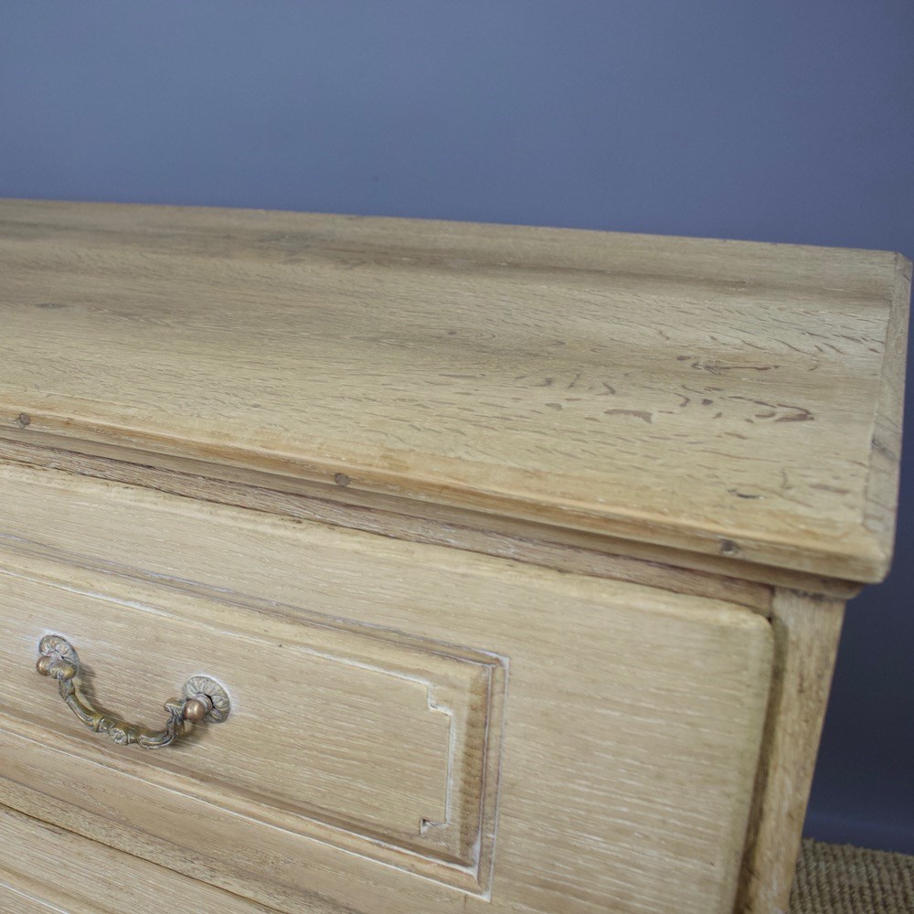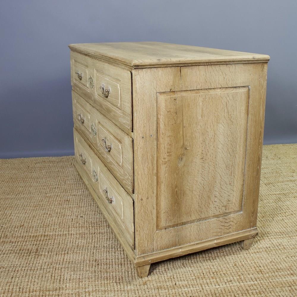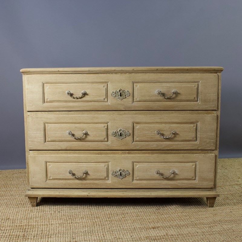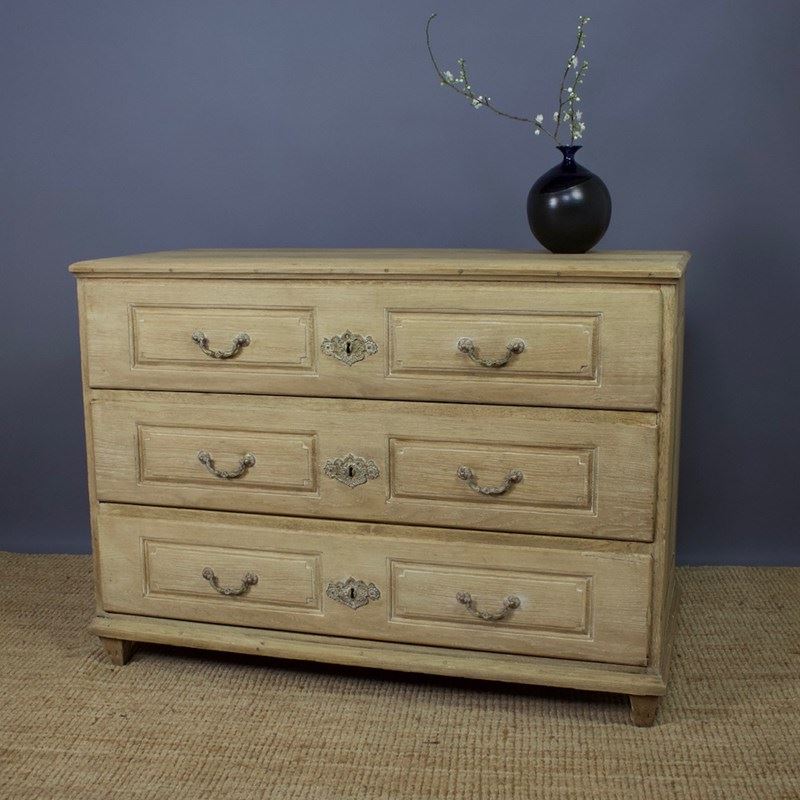This spacious Antique French bleached oak chest of drawers has three large drawers which are running very smoothly and still have all their original locks. The antique handles and escutcheons are solid brass.