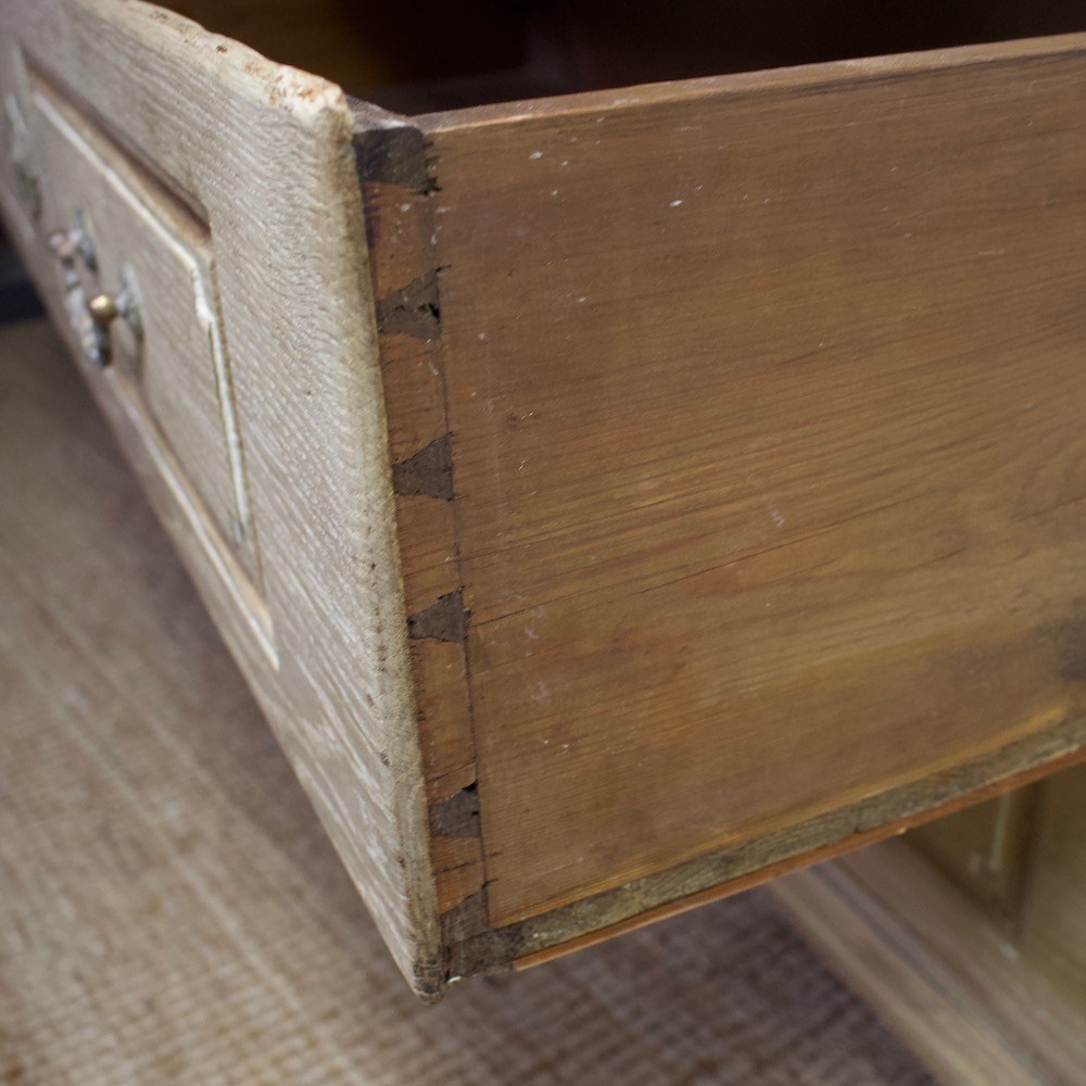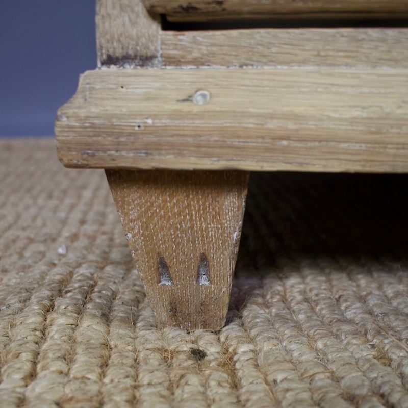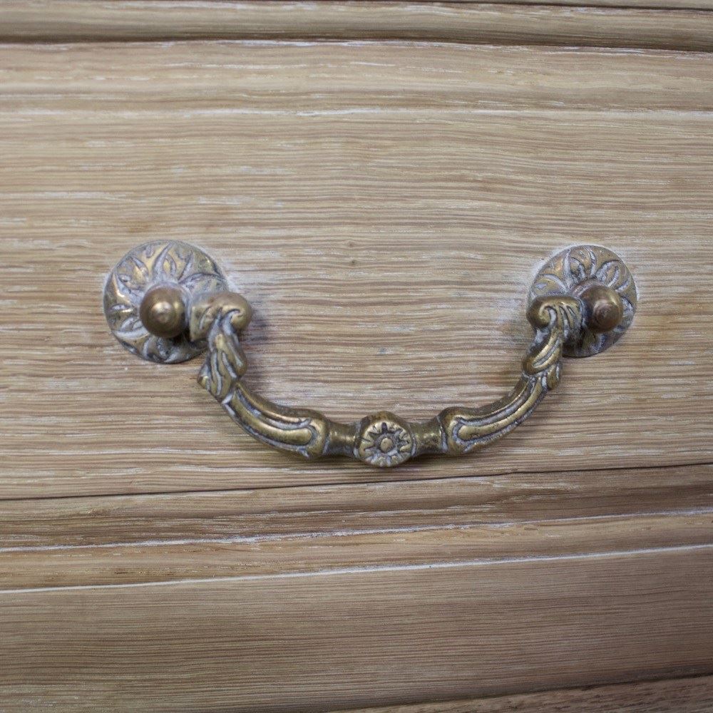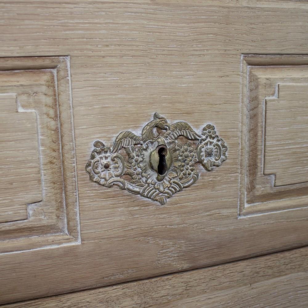 This spacious Antique French bleached oak chest of drawers has three large drawers which are running very smoothly and still have all their original locks. The antique handles and escutcheons are solid brass.