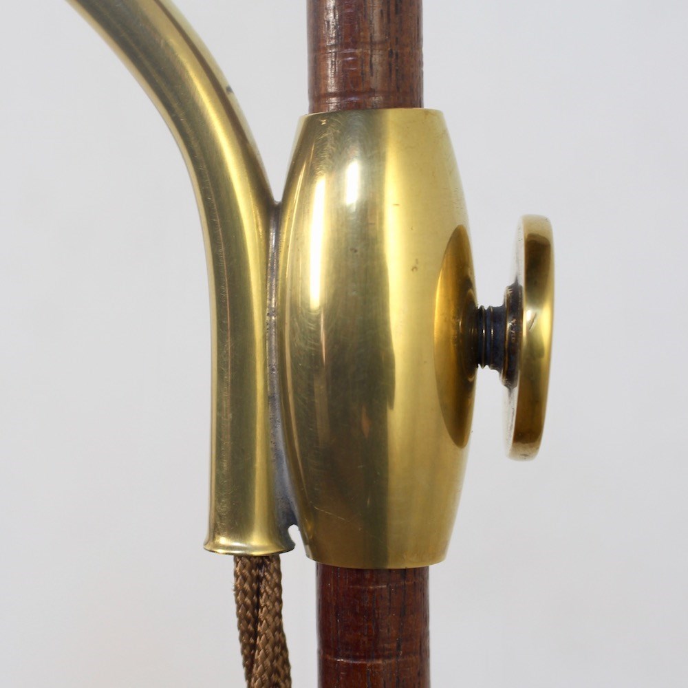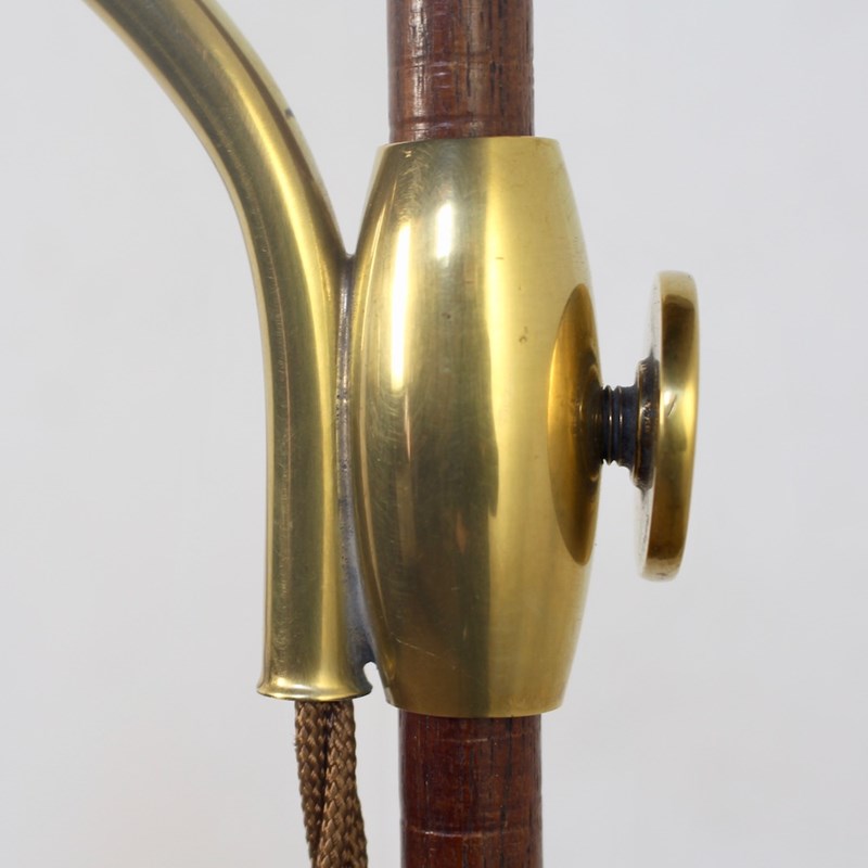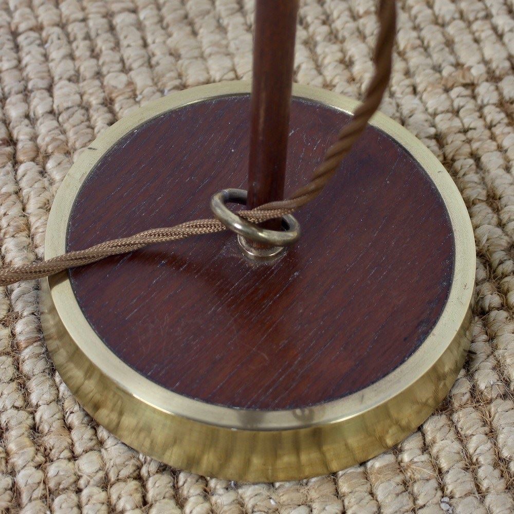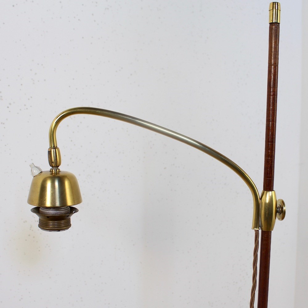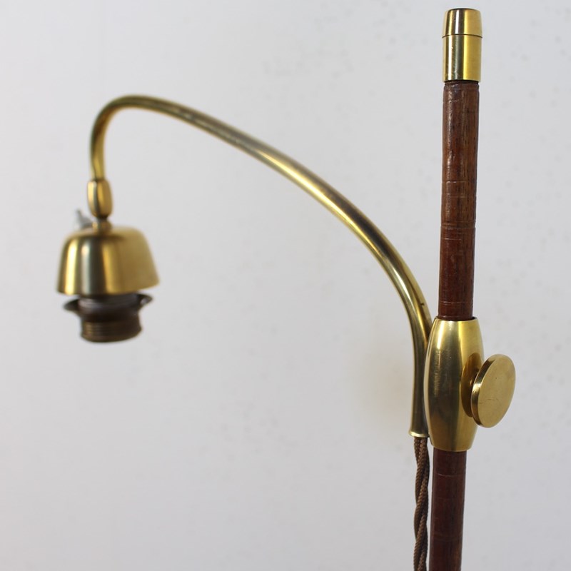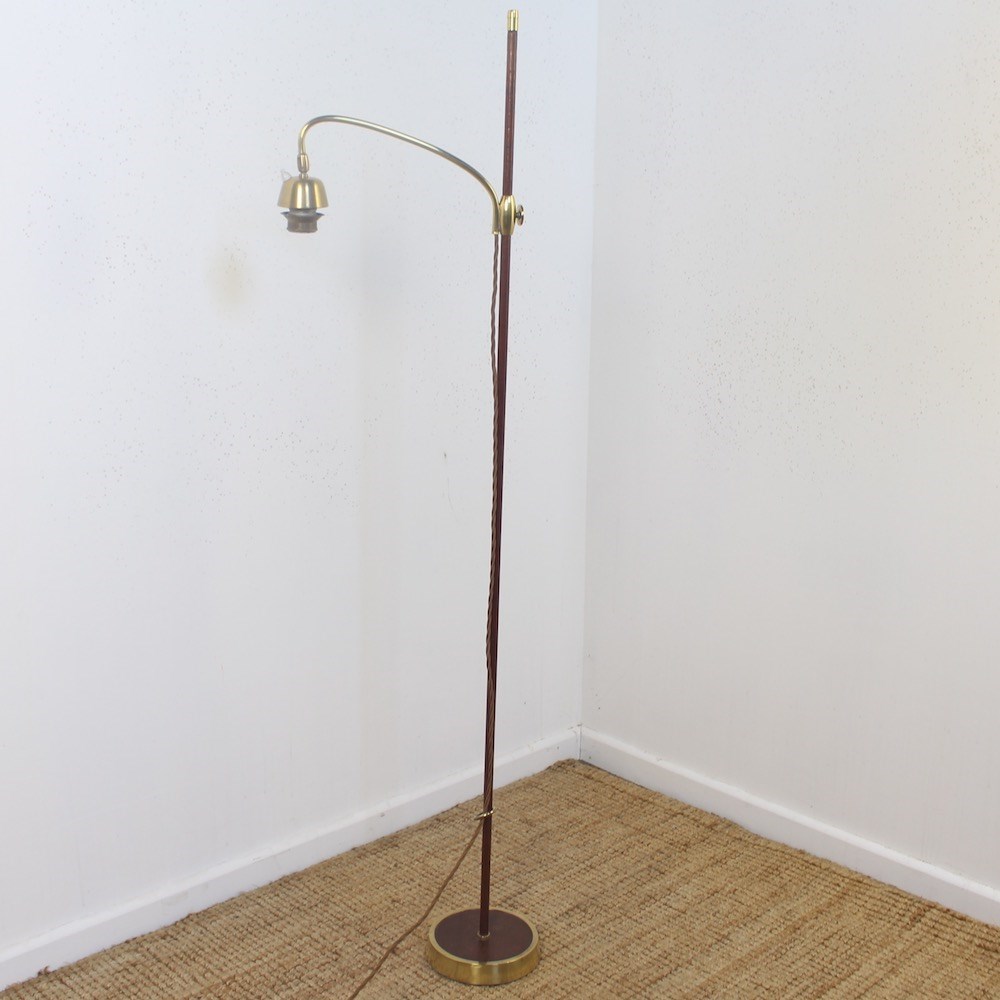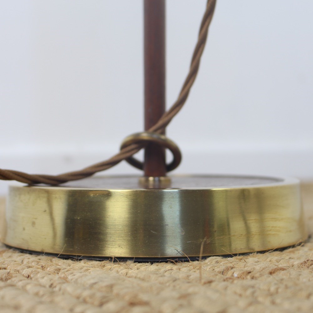 A stylish Danish floor lamp from the 1960s featuring a brass adjustable arm and a weighted circular base. The upright stem is wrapped in teak veneer , adding warmth and character. The swivel arm allows for adjustable lighting, ideal for reading and accent use. The exposed cord , which is subtle integrated into the structure via a brass ring, reinforces the lamp's utilitarian aesthetic without compromising its visual clarity. Classic mid-century modern design with clean lines and functional elegance. The lamp has been rewired and PAT tested.
