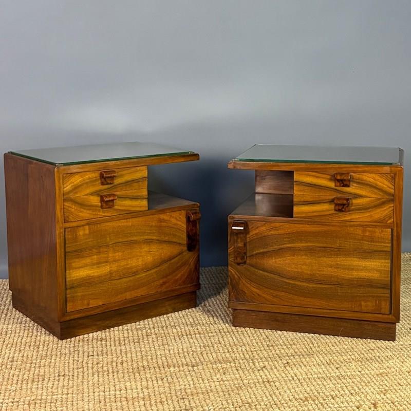 A finely matched pair of Art Deco walnut bedside cabinets, each with a stepped glass top above an open recess and two drawers with sculpted solid burr walnut handles, raised on a plinth base. The book-matched walnut veneers display rich figuring and warm tones.