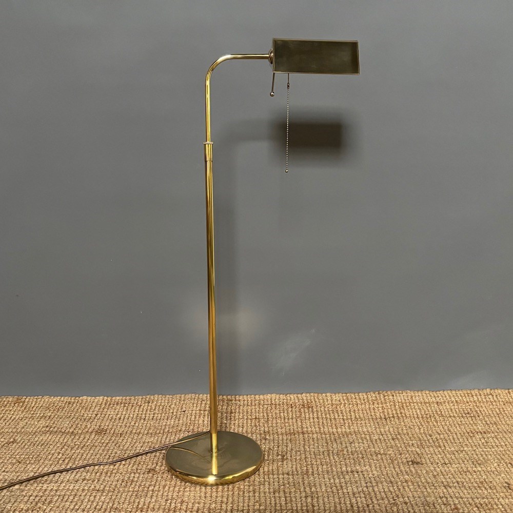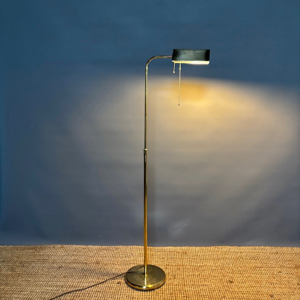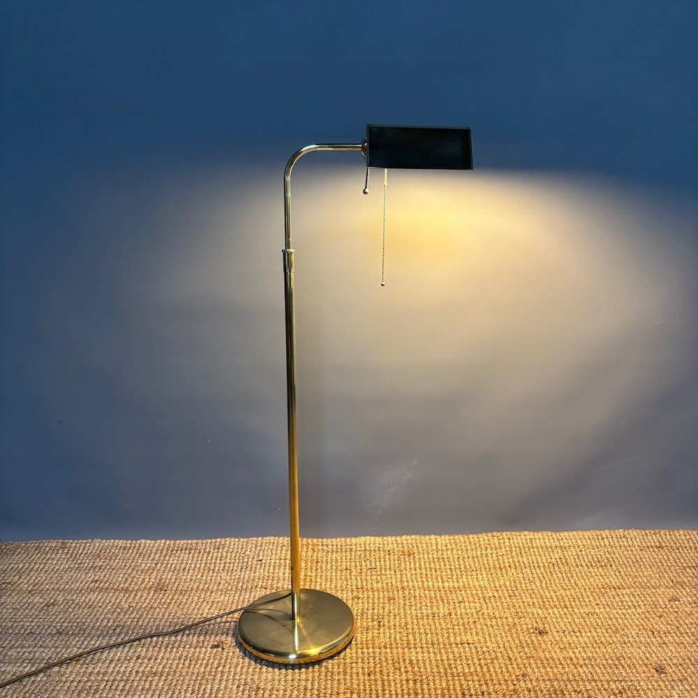 A stylish brass standard lamp by Soelken Leuchten, designed in the classic pharmacy style in the 1970s, the circular weighted base supporting a slender upright column with a curved arm, terminating in a rectangular shade. The lamp is fitted with a pull chain switch beneath the shade , allowing for directional , focused lighting , ideal for reading or task use.The adjustable height of the lamp is from 95 cm to 150 cm . This lamp has been PAT tested.