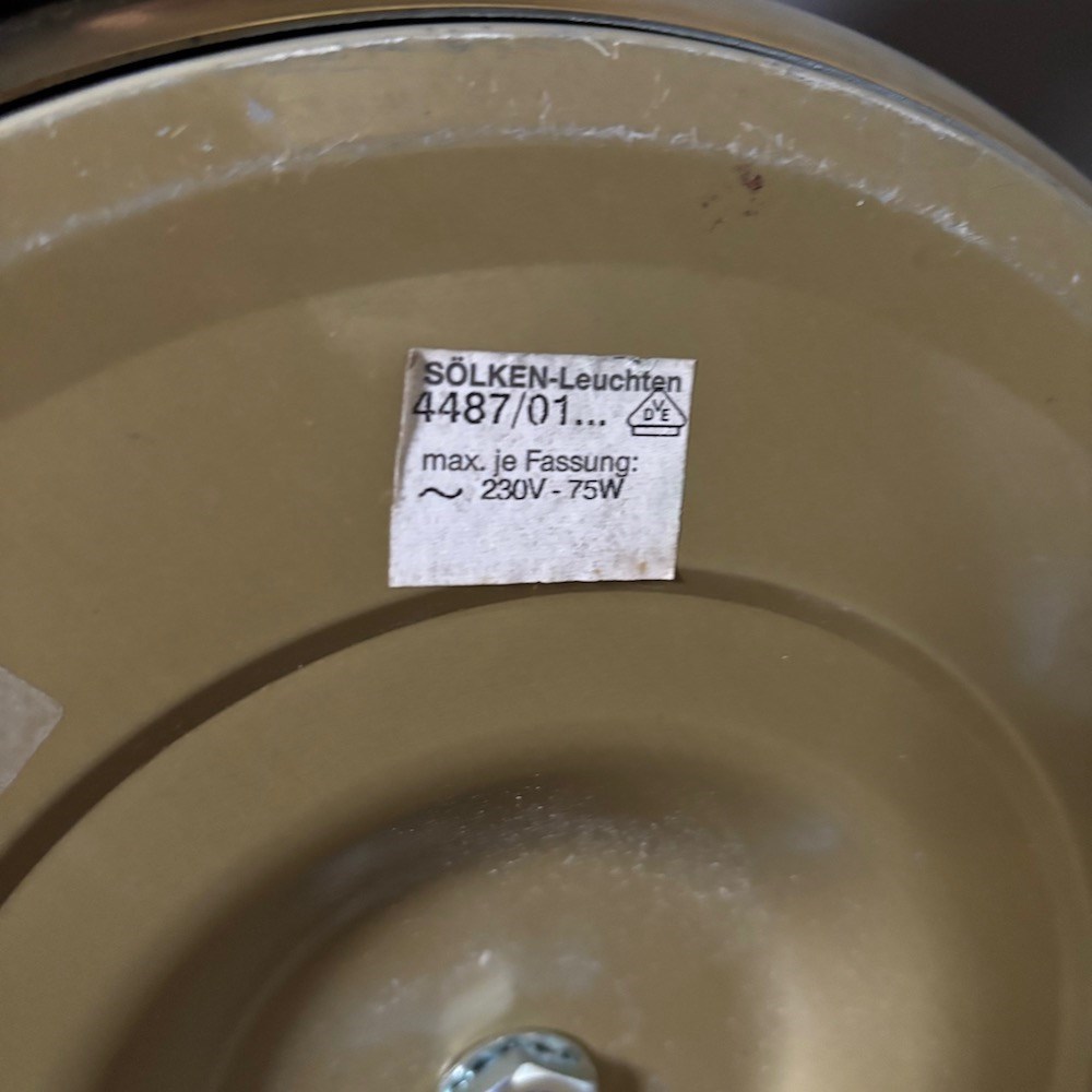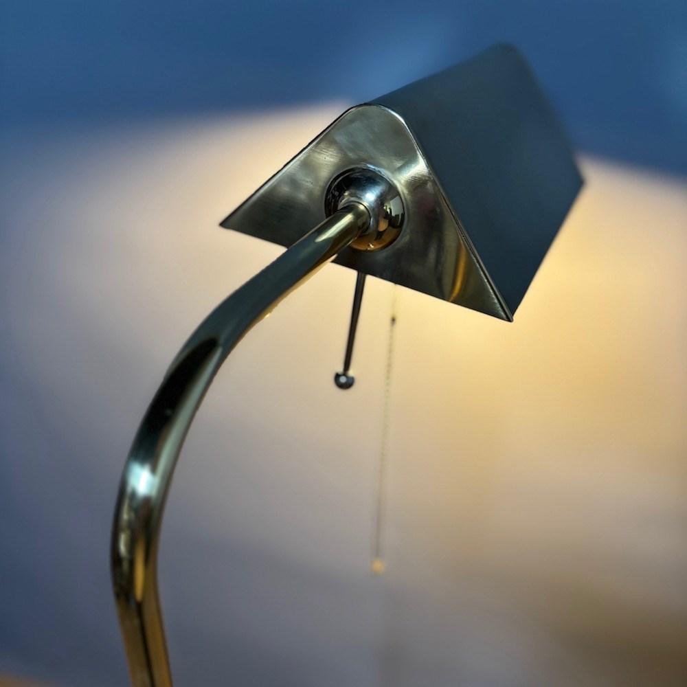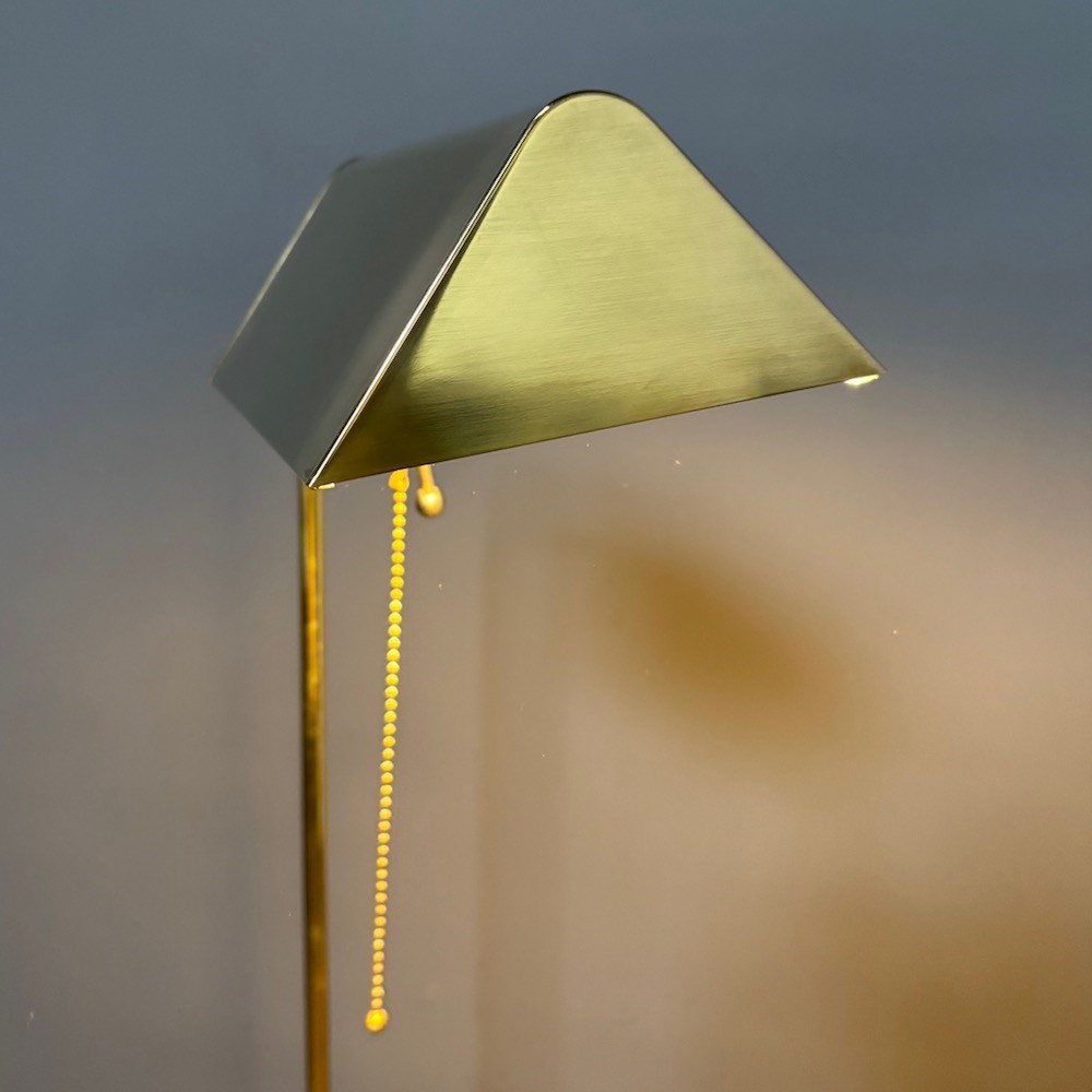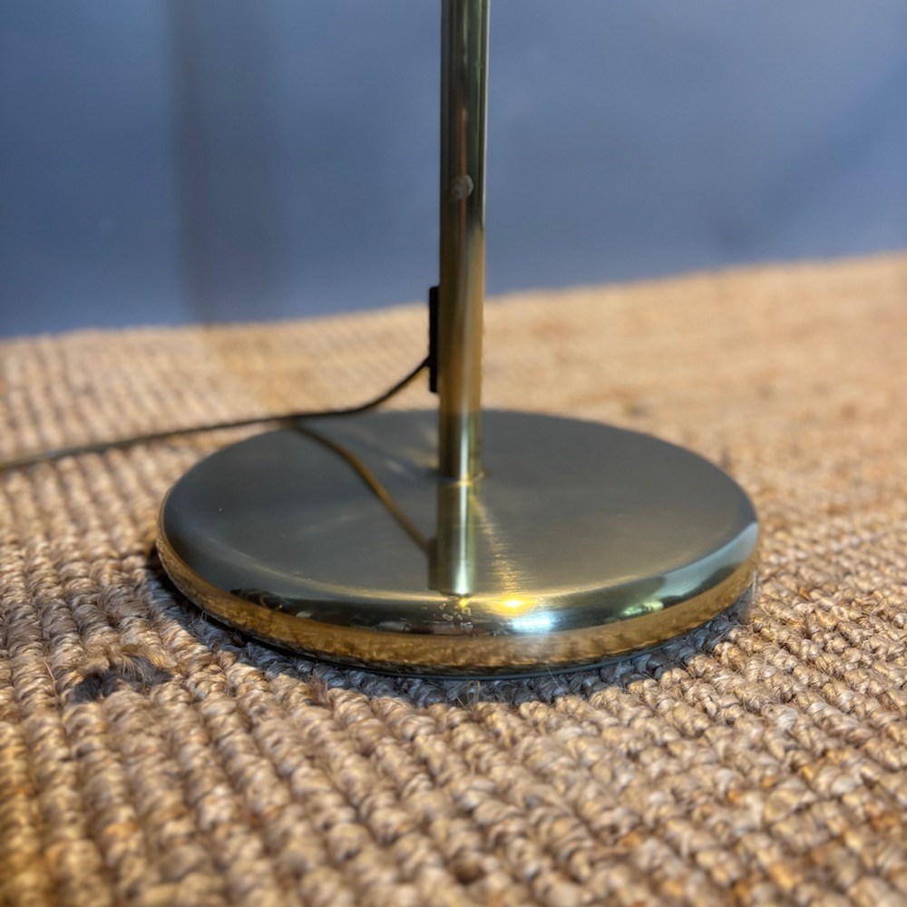 A stylish brass standard lamp by Soelken Leuchten, designed in the classic pharmacy style in the 1970s, the circular weighted base supporting a slender upright column with a curved arm, terminating in a rectangular shade. The lamp is fitted with a pull chain switch beneath the shade , allowing for directional , focused lighting , ideal for reading or task use.The adjustable height of the lamp is from 95 cm to 150 cm . This lamp has been PAT tested.