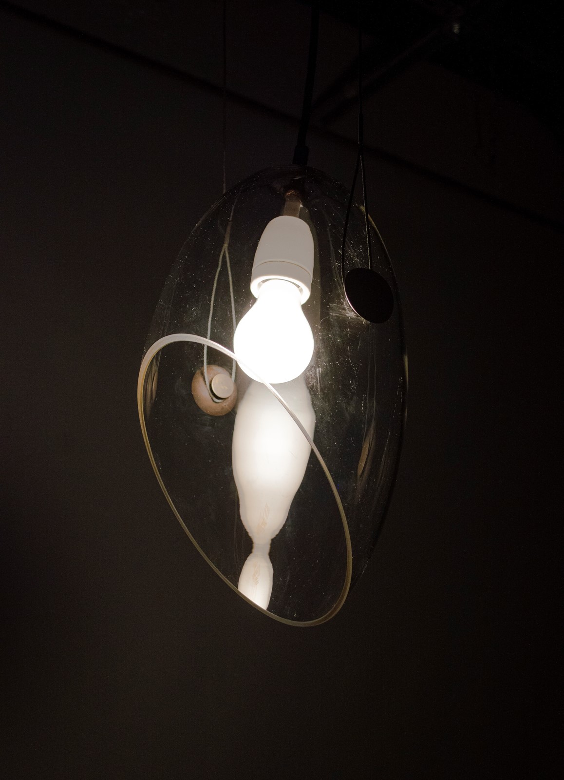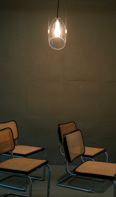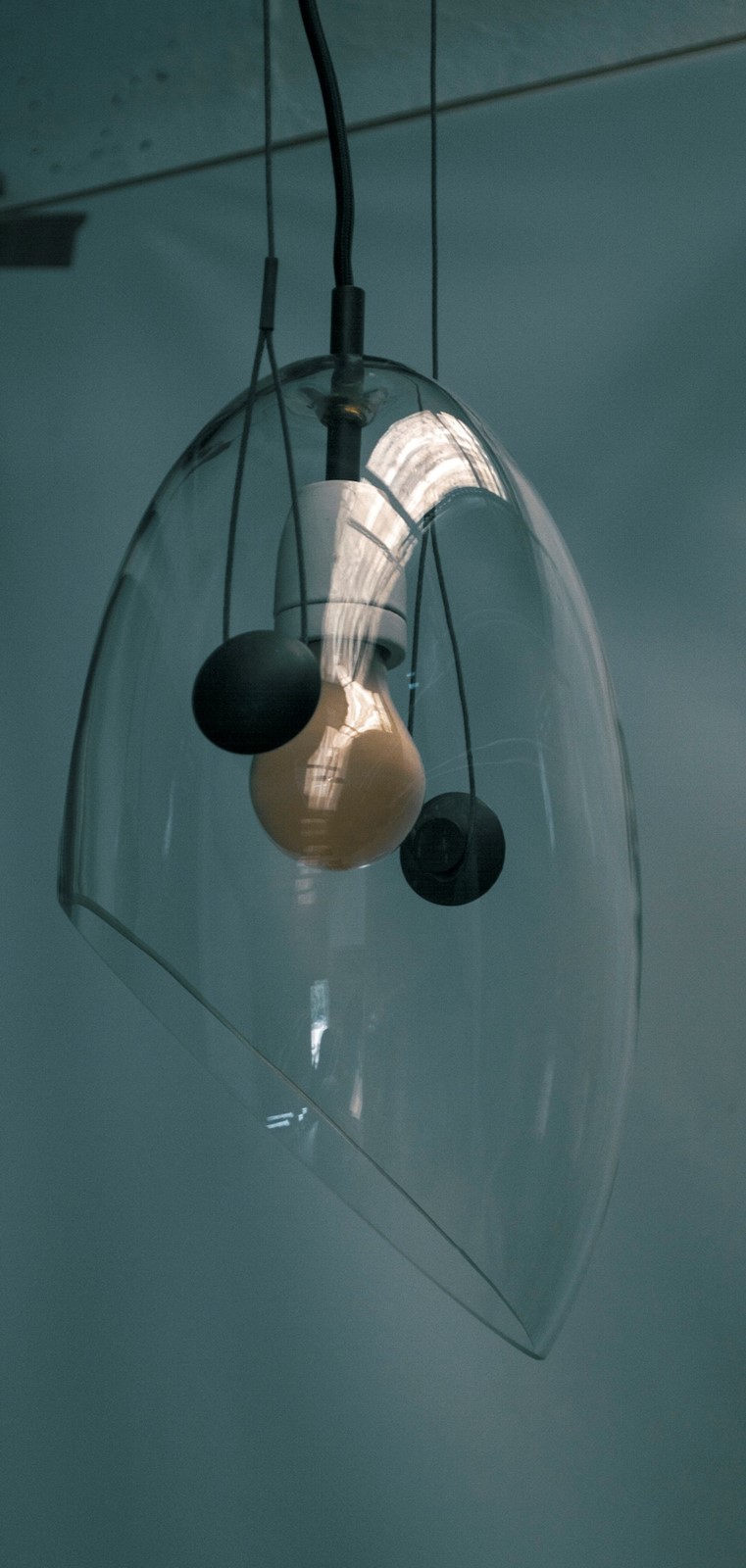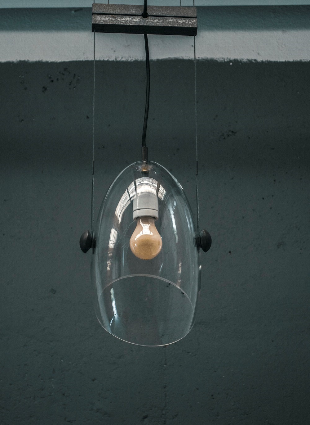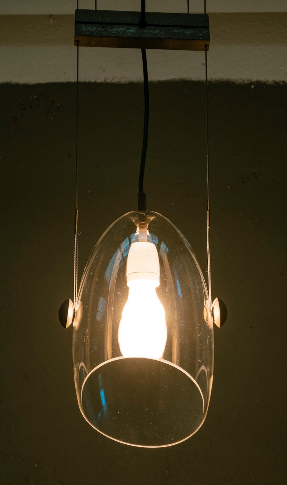 The hand blown glass shade has been cut at an angle that gives it a look of elegance, finished off with two rounded aged brass fittings. The glass shade is hanging from a steel weighted pivoting system which allows the light to move from side to side. This holds the glass shade at the angle of your preference. No designer found yet. We have a feeling the quality of the glass is italian. Similar to Angelo Mangiarotti's ghost lamp.