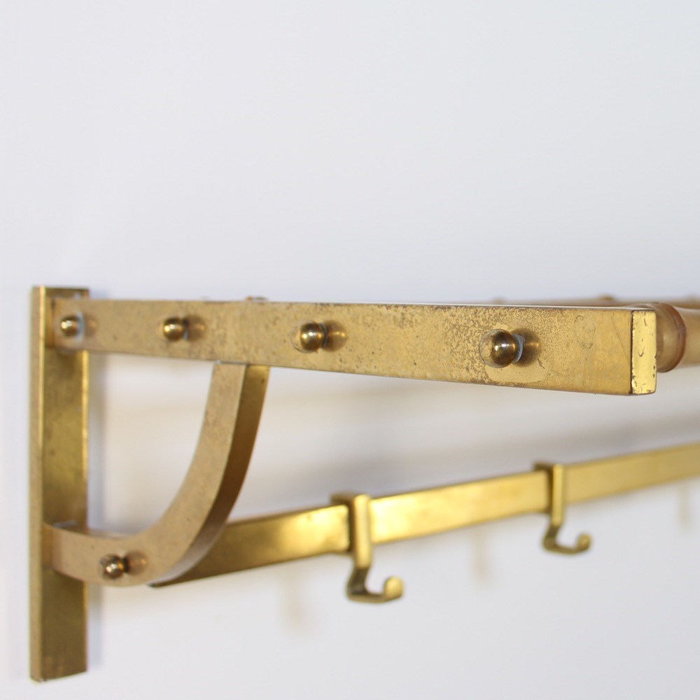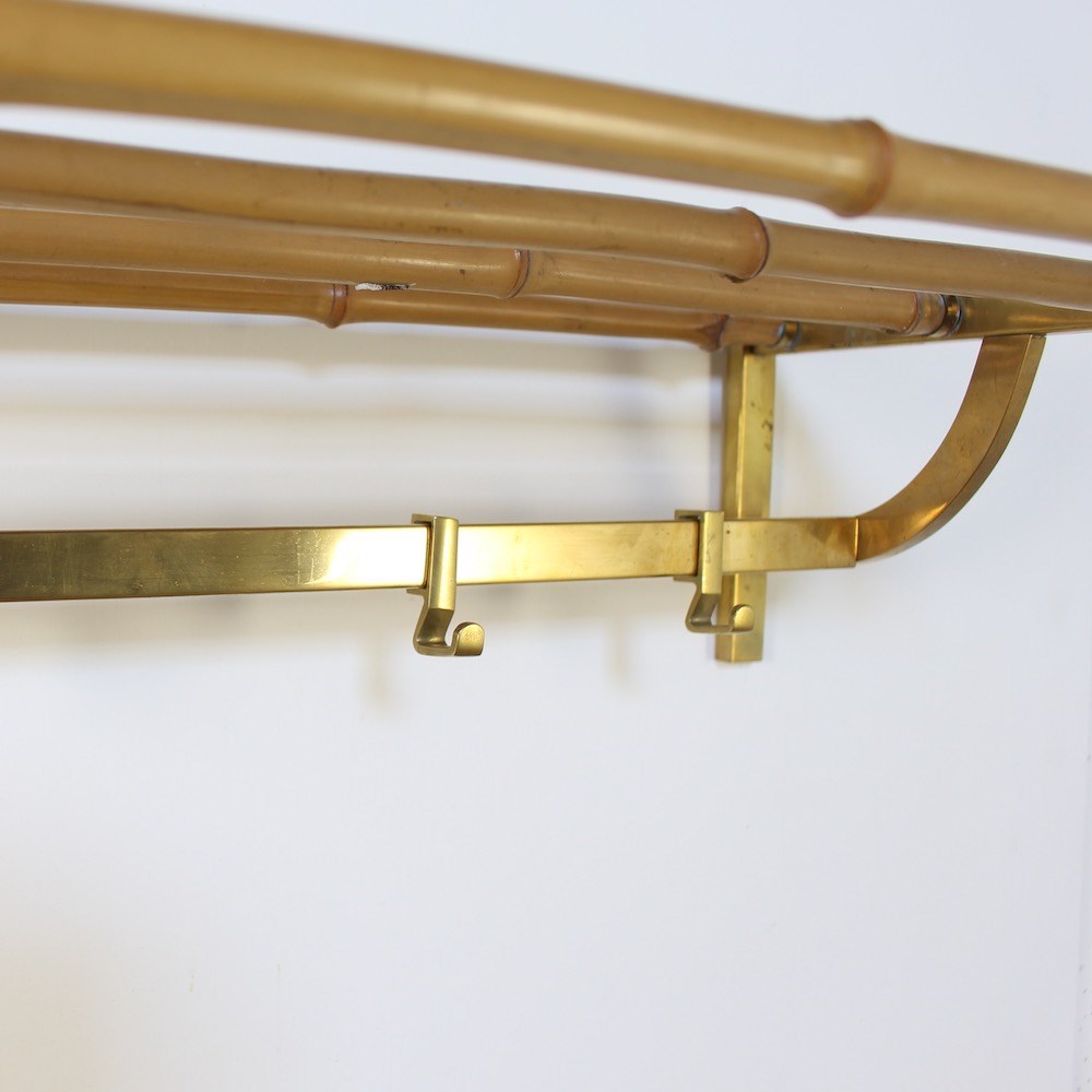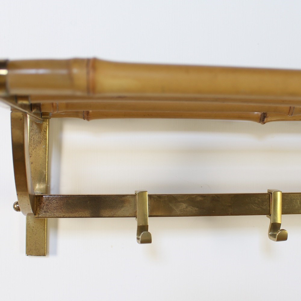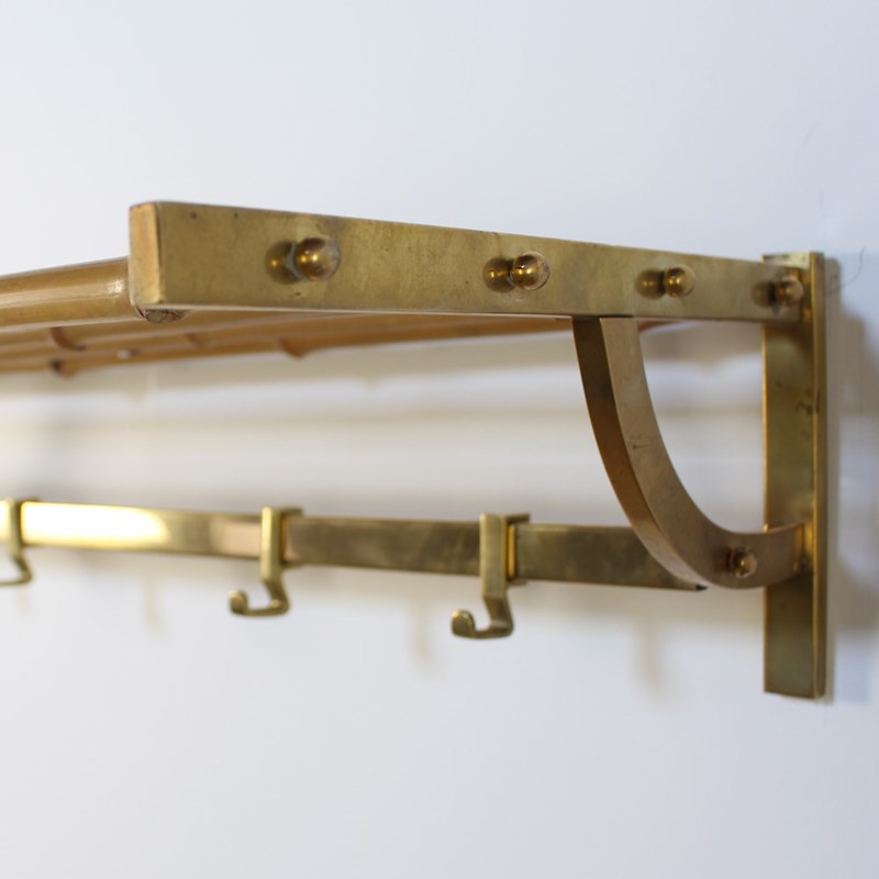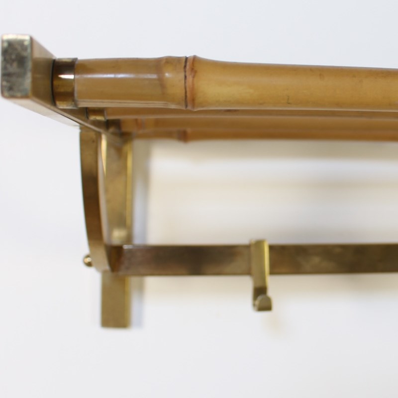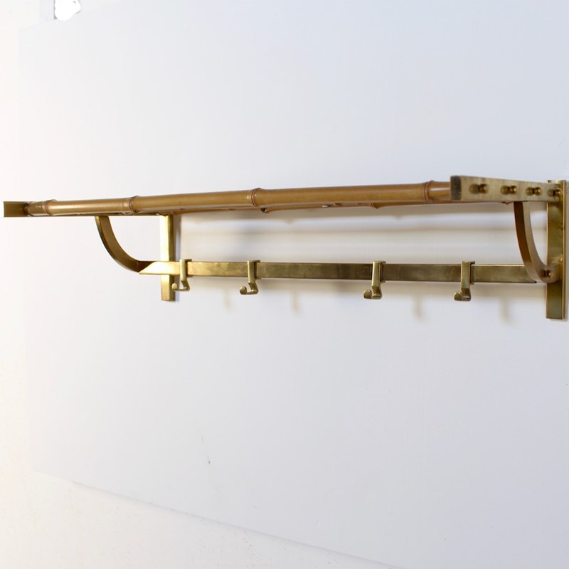 A stylish midcentury brass wall mounted coat rack featuring a bamboo upper shelf for hats and bags, supported by curved side brackets. Below, a horizontal rail with 4 sliding hooks offers ample hanging space for coats and accessories. Crafted in solid brass with a warm, aged patina, this functional piece adds a touch of vintage charm to any hallway.