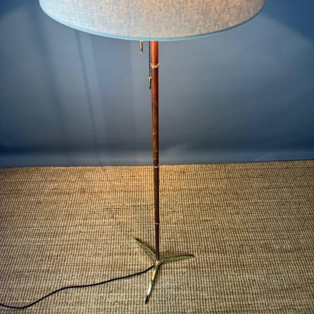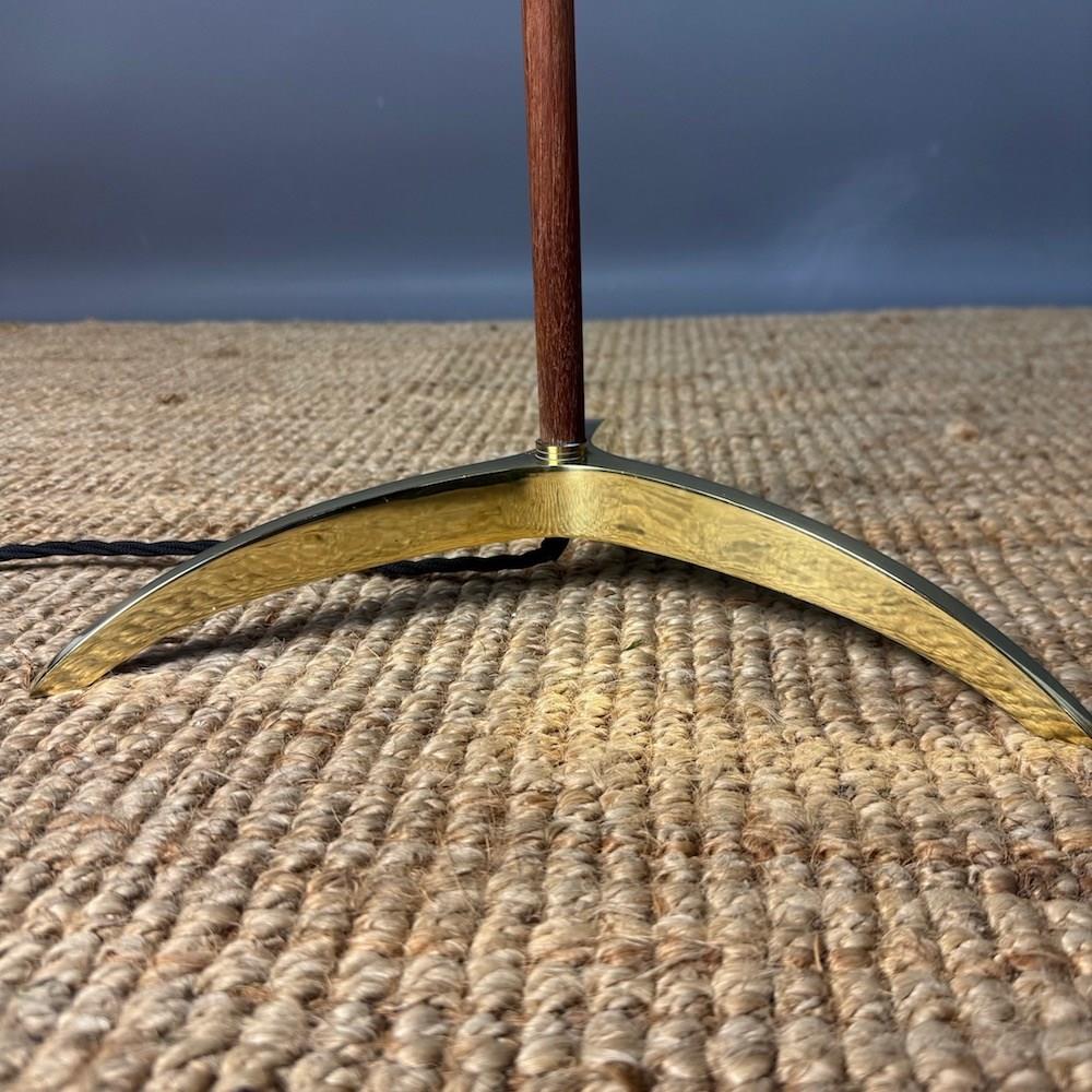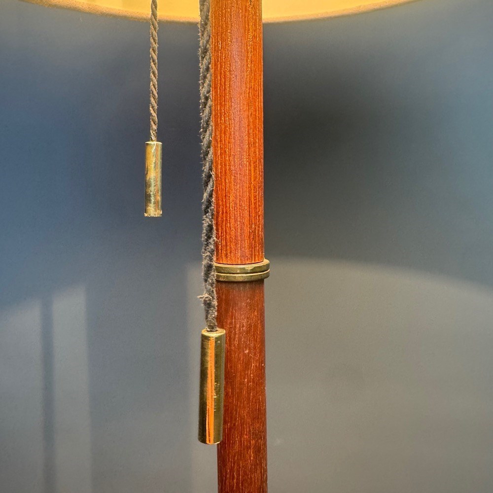 An elegant mid-20th-century floor lamp of Scandinavian Modern inspiration. The tall column is wrapped in teak veneer in perfect condition and is intersected by slender brass collars. The brass base consists of three polished legs forming a classic tripod . Two bulbs can be operated separately by two brass pull switches. The lamp has been rewired and PAT tested. The shade is not included in the price.
