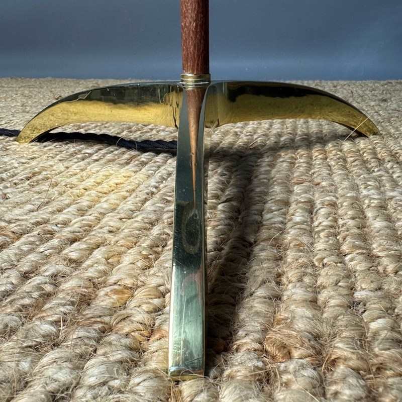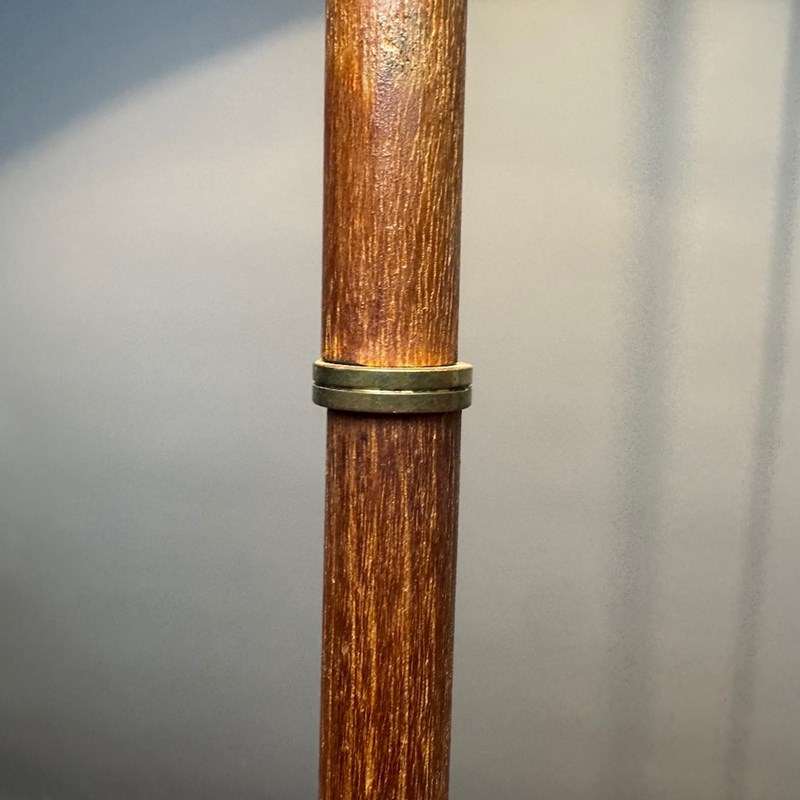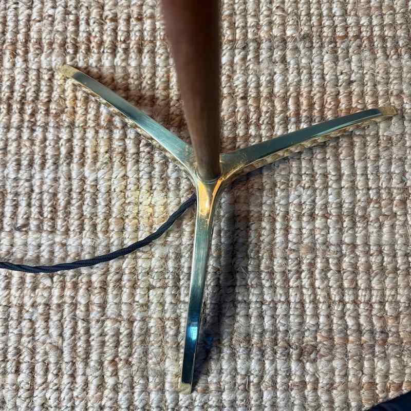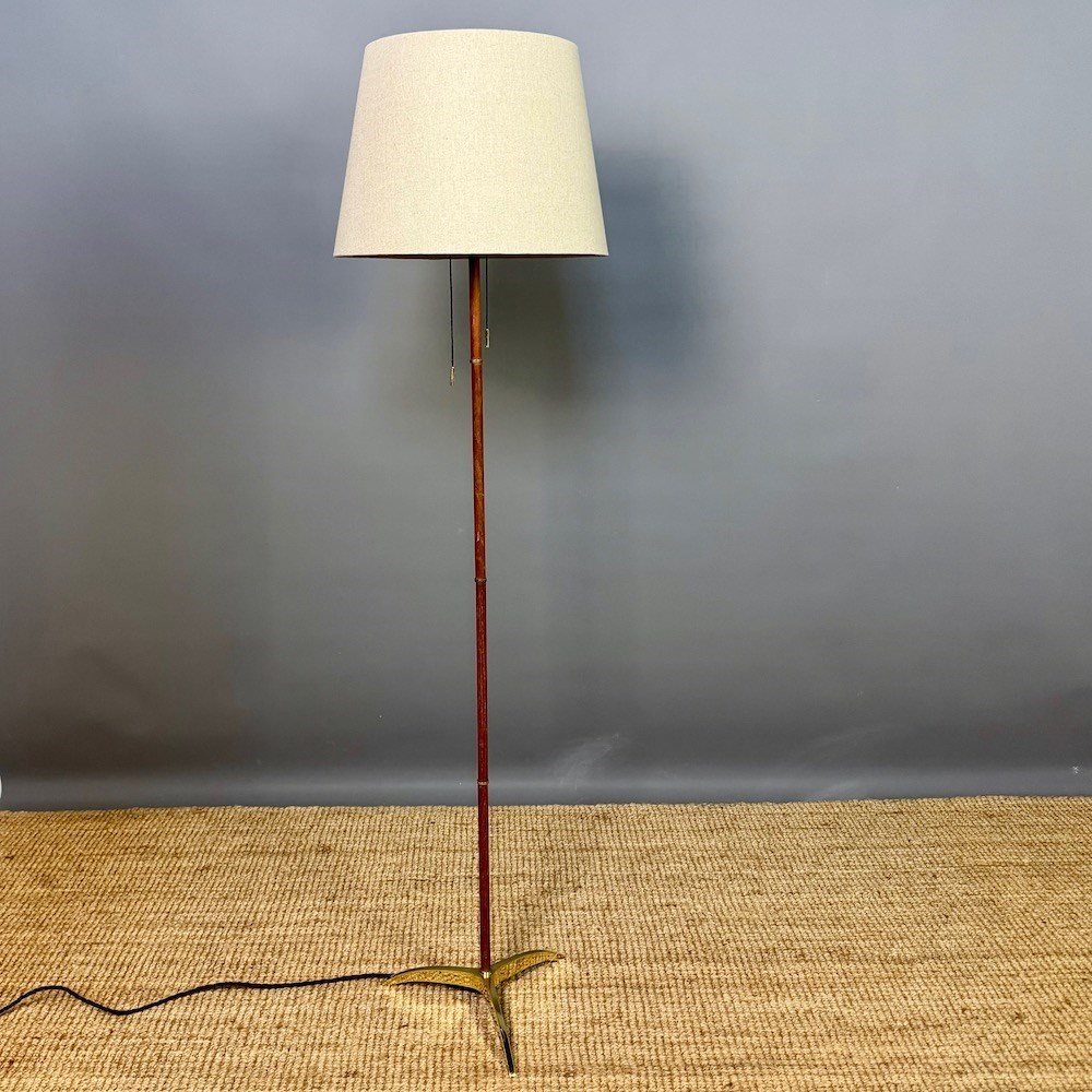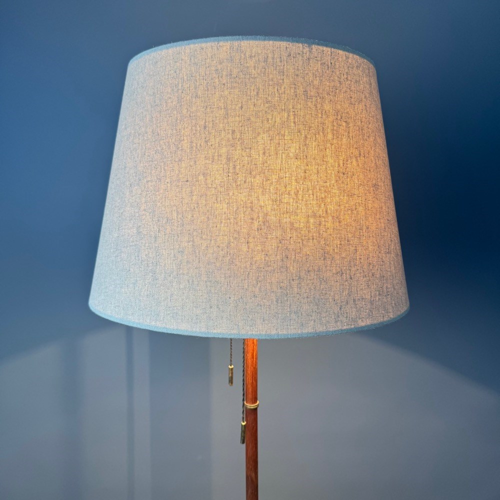 An elegant mid-20th-century floor lamp of Scandinavian Modern inspiration. The tall column is wrapped in teak veneer in perfect condition and is intersected by slender brass collars. The brass base consists of three polished legs forming a classic tripod . Two bulbs can be operated separately by two brass pull switches. The lamp has been rewired and PAT tested. The shade is not included in the price.