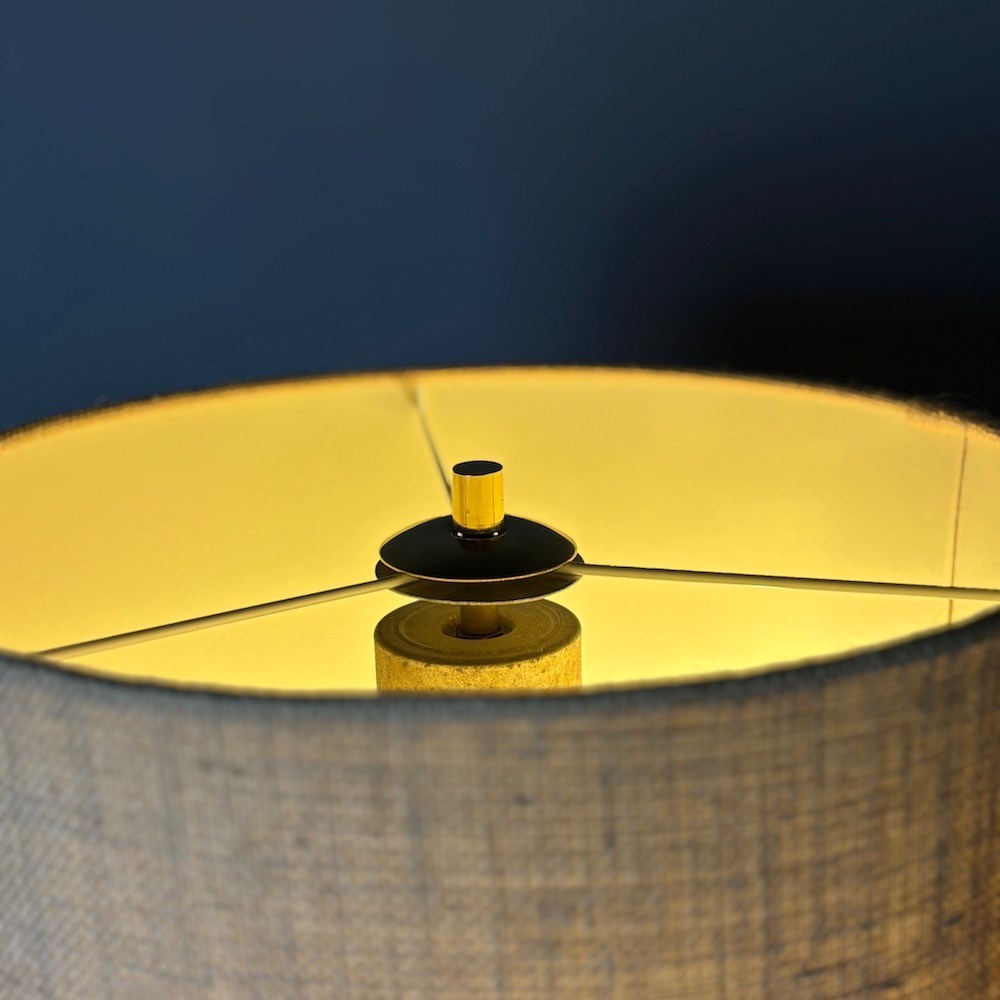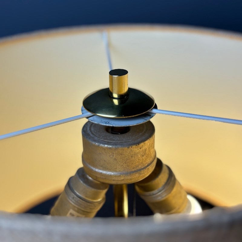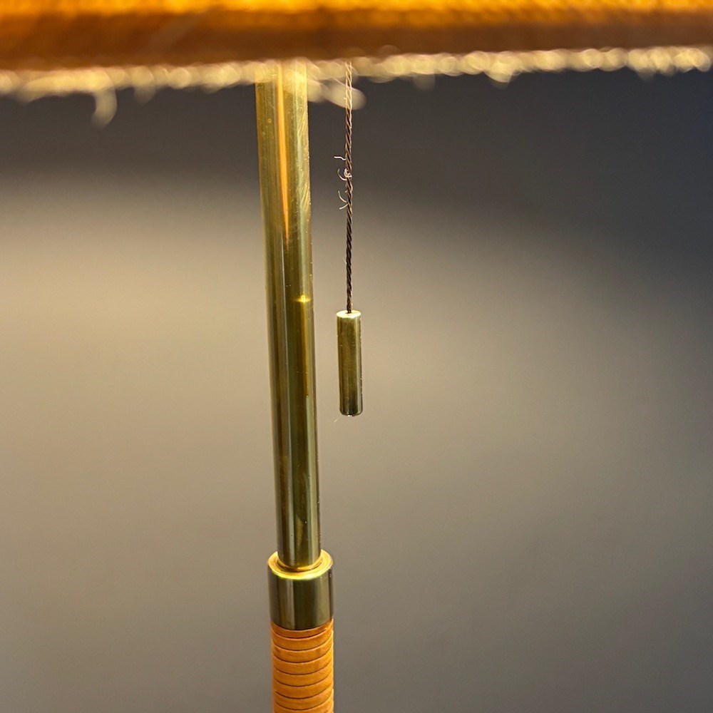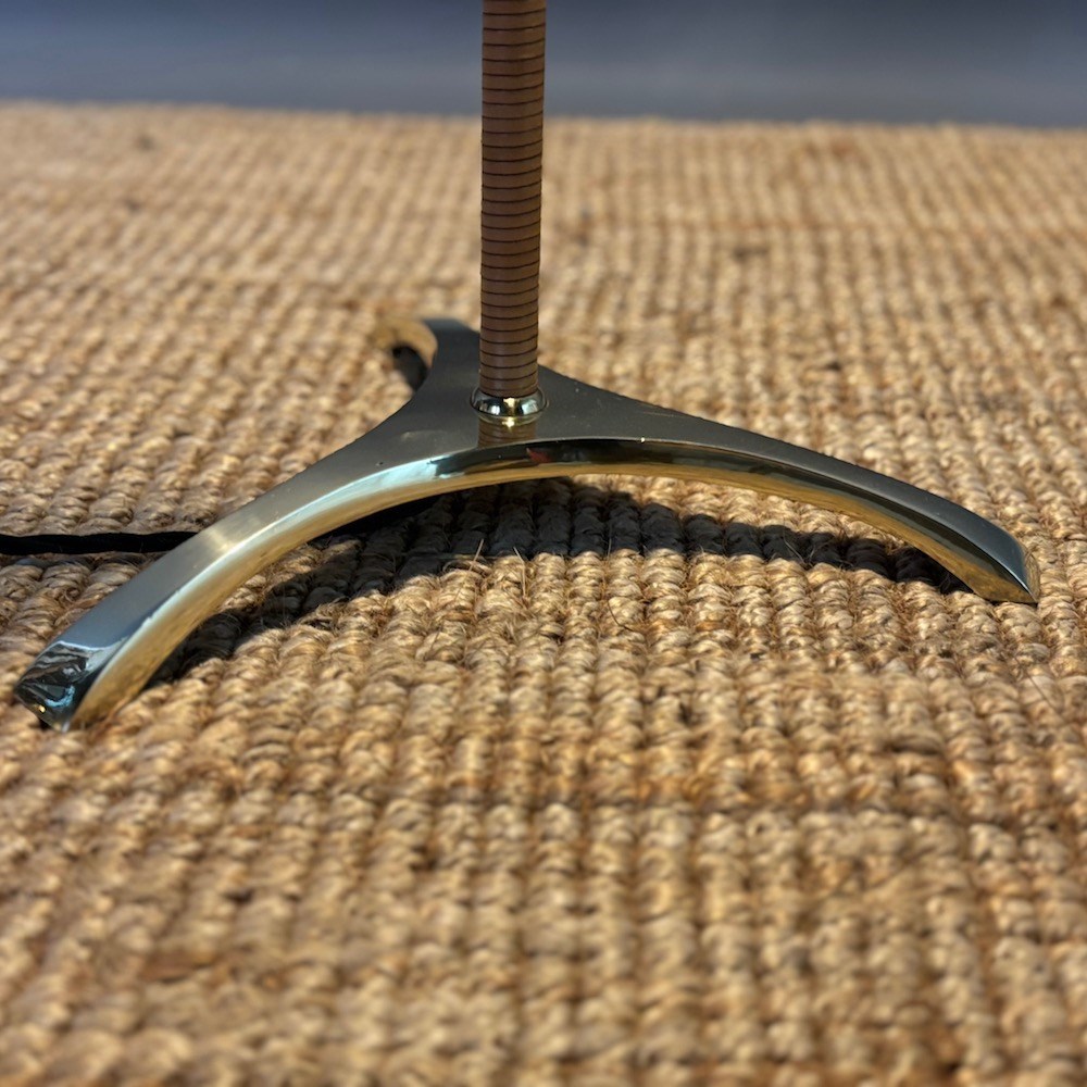 A leather-wrapped standard lamp, mid-20th century, the elegant tapering column finely wrapped in tan leather, rising to a brass stem with pull-switch fitting and raised on a brass three-splayed base. The 2 lightbulbs can be operated separately with the pull switch . The lamp has been rewired with a black braided flex and is PAT tested. The custom-made hessian lampshade is not included in the price.