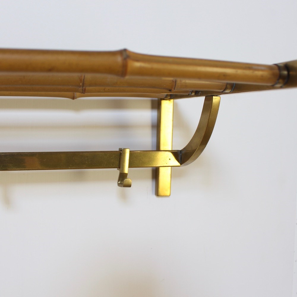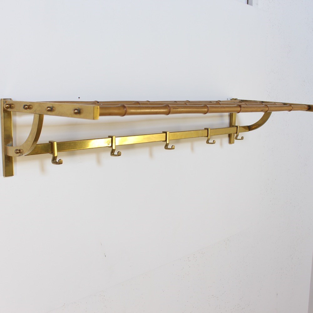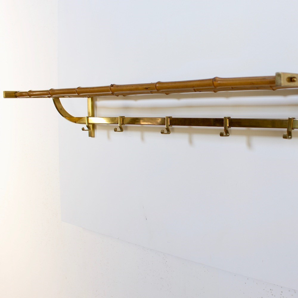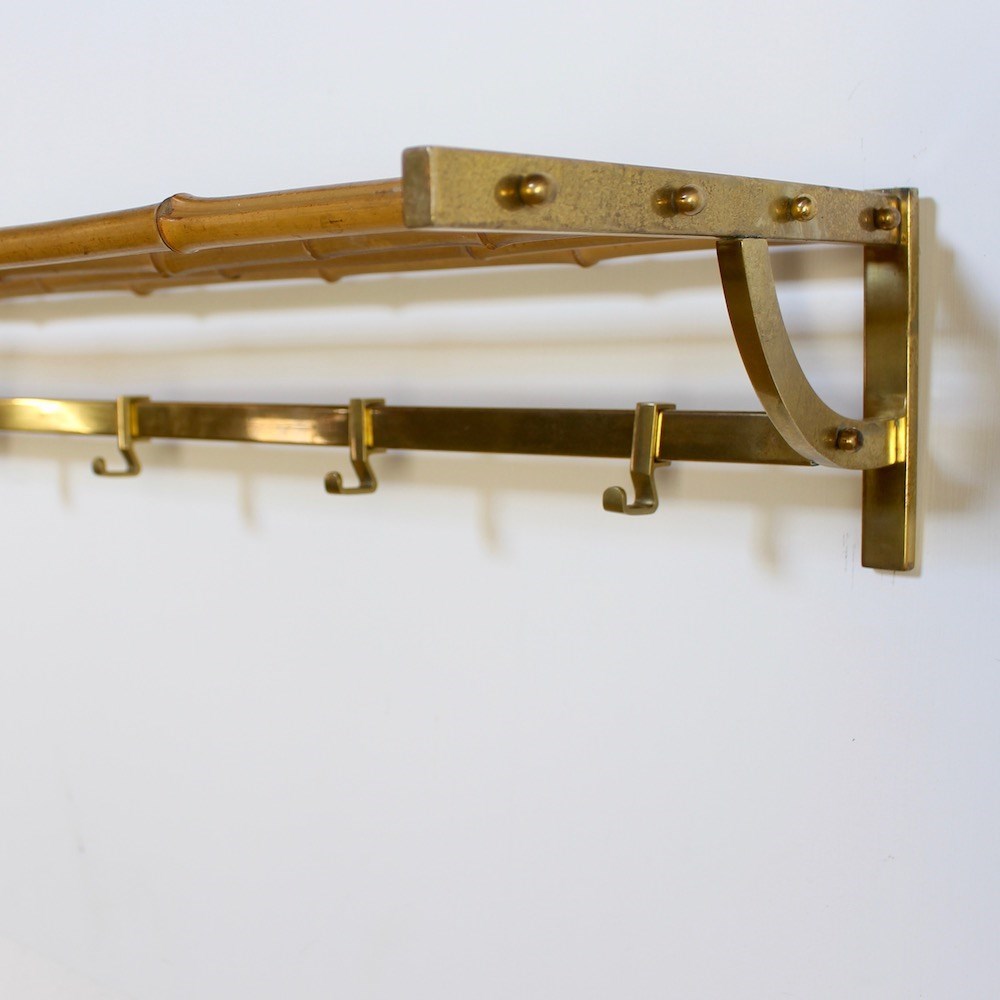 A large stylish midcentury brass wall mounted coat rack featuring a bamboo upper shelf for hats and bags, supported by curved side brackets. Below, a horizontal rail with 5 sliding hooks offers ample hanging space for coats and accessories. Crafted in solid brass with a warm , aged patina, this functional piece adds a touch of vintage charm to any hallway.