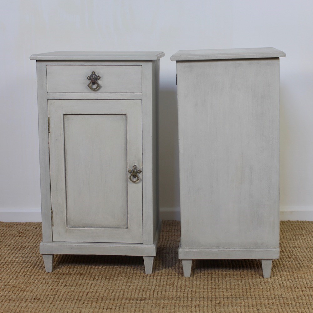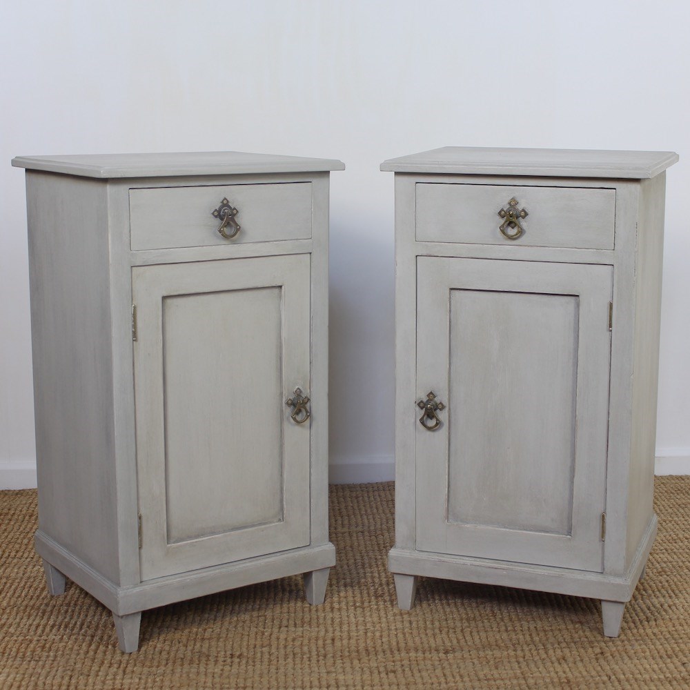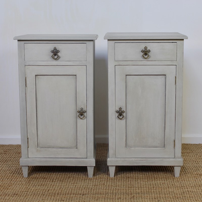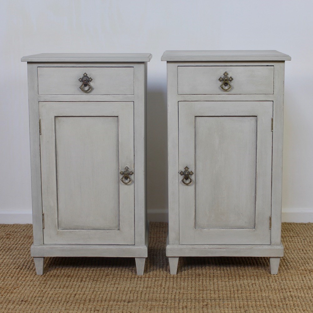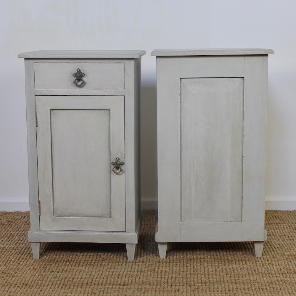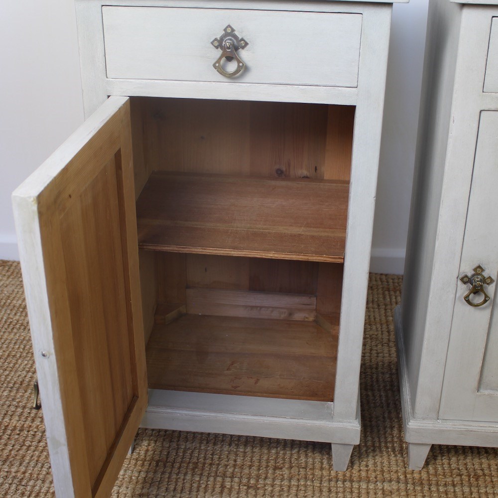 A German pair of baltic pine bedside cabinets, each with a moulded rectangular top above a single drawer and a panelled cupboard door, fitted with antique brass handles, on tapered feet. The later distressed chalk paint finish is in colour close to F&B "Skylight ". Each cabinet is fitted with a shelf.