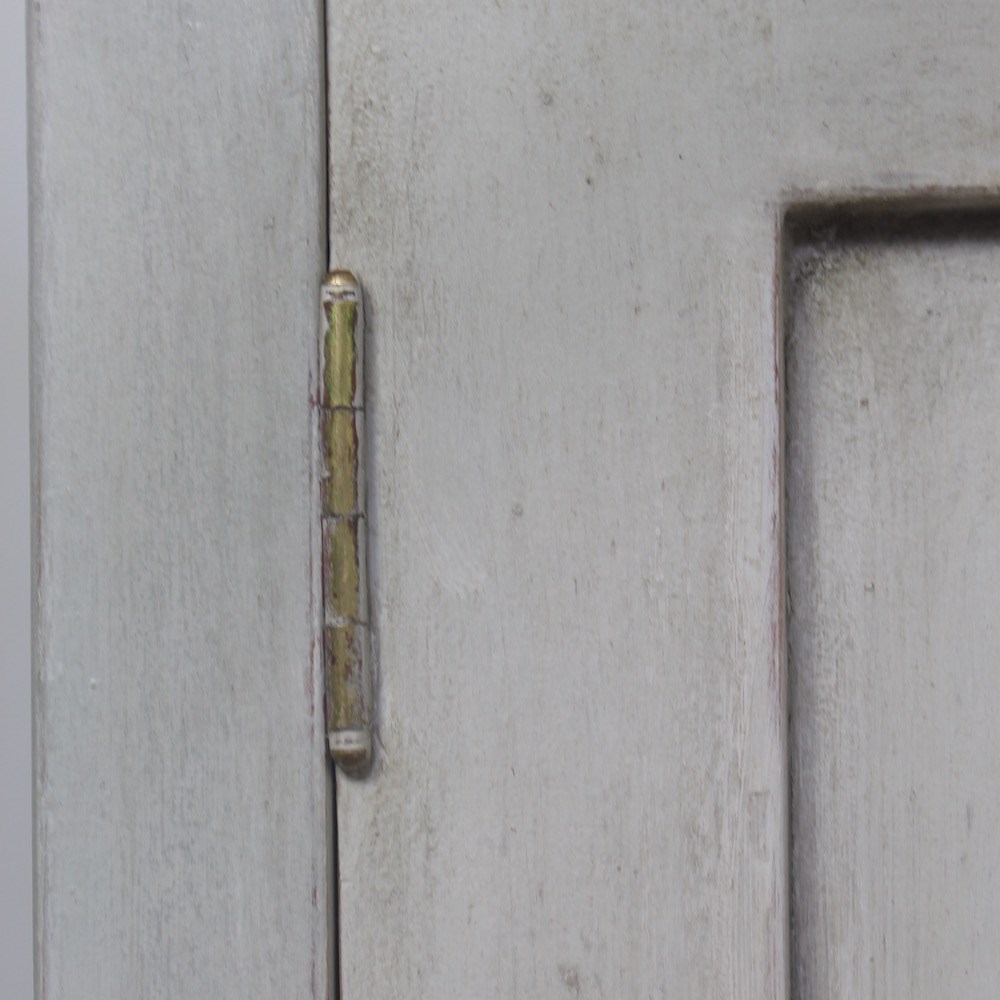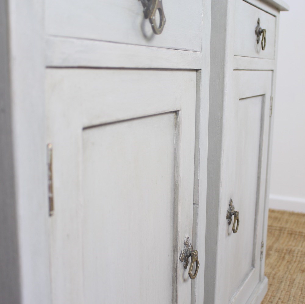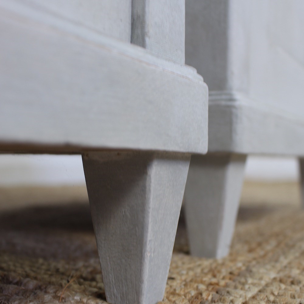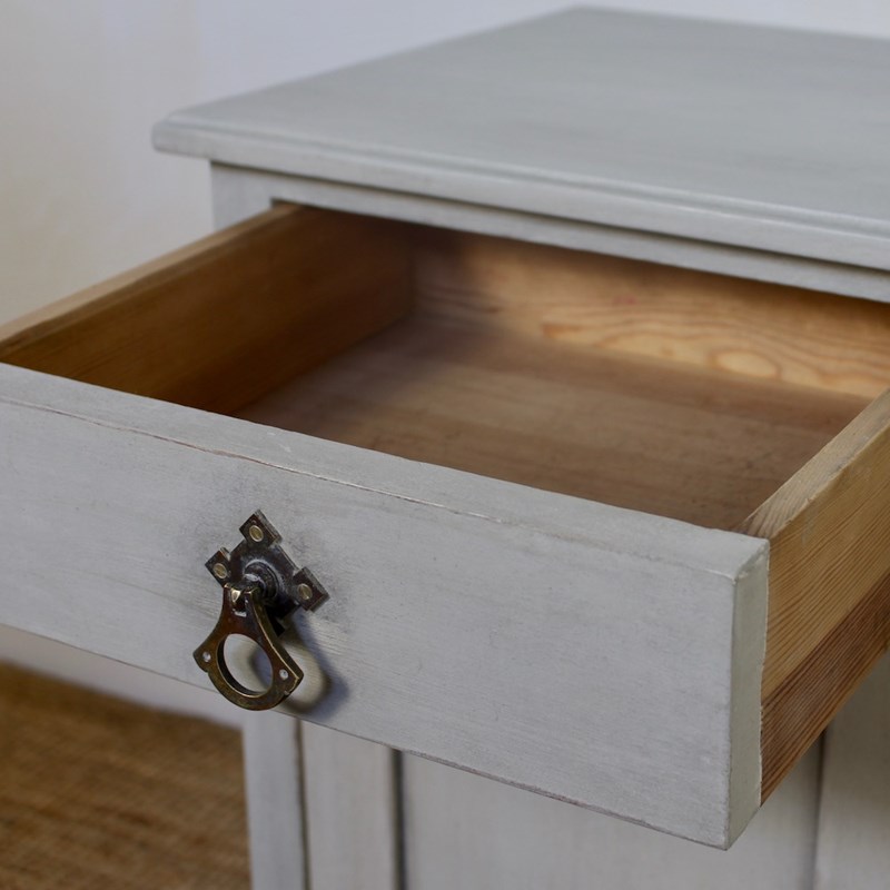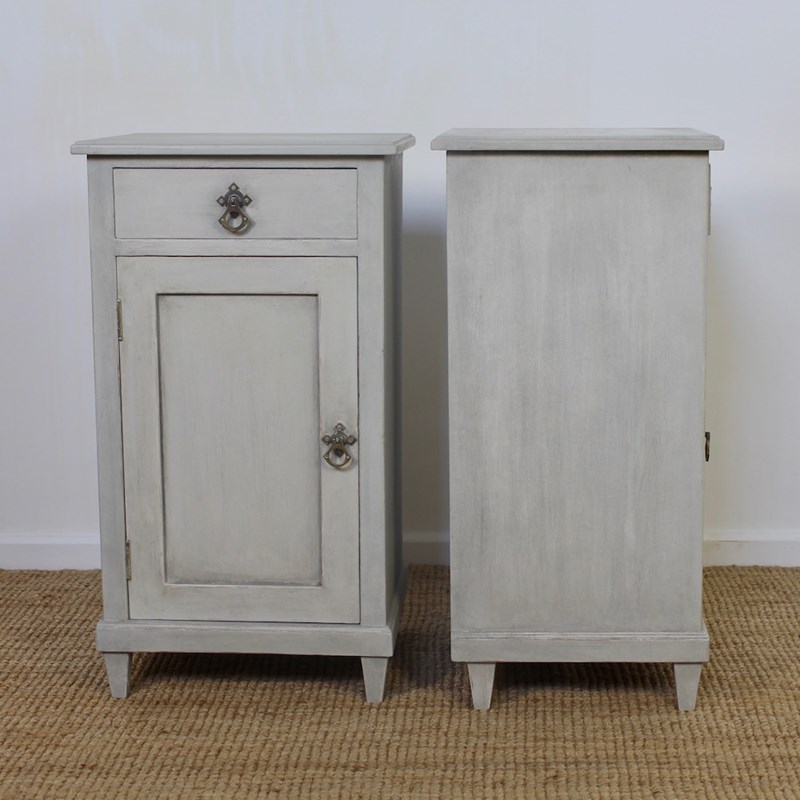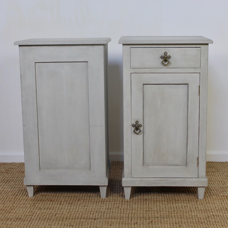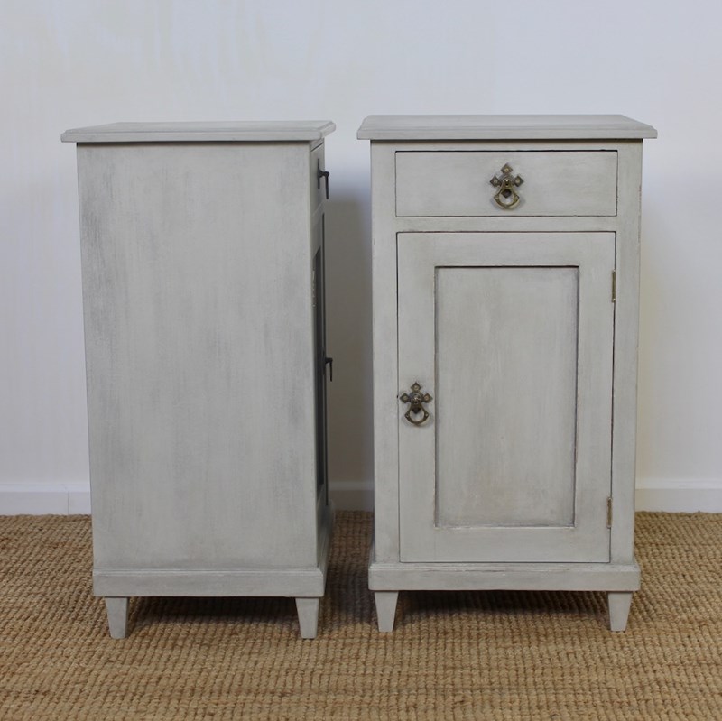 A German pair of baltic pine bedside cabinets, each with a moulded rectangular top above a single drawer and a panelled cupboard door, fitted with antique brass handles, on tapered feet. The later distressed chalk paint finish is in colour close to F&B "Skylight ". Each cabinet is fitted with a shelf.