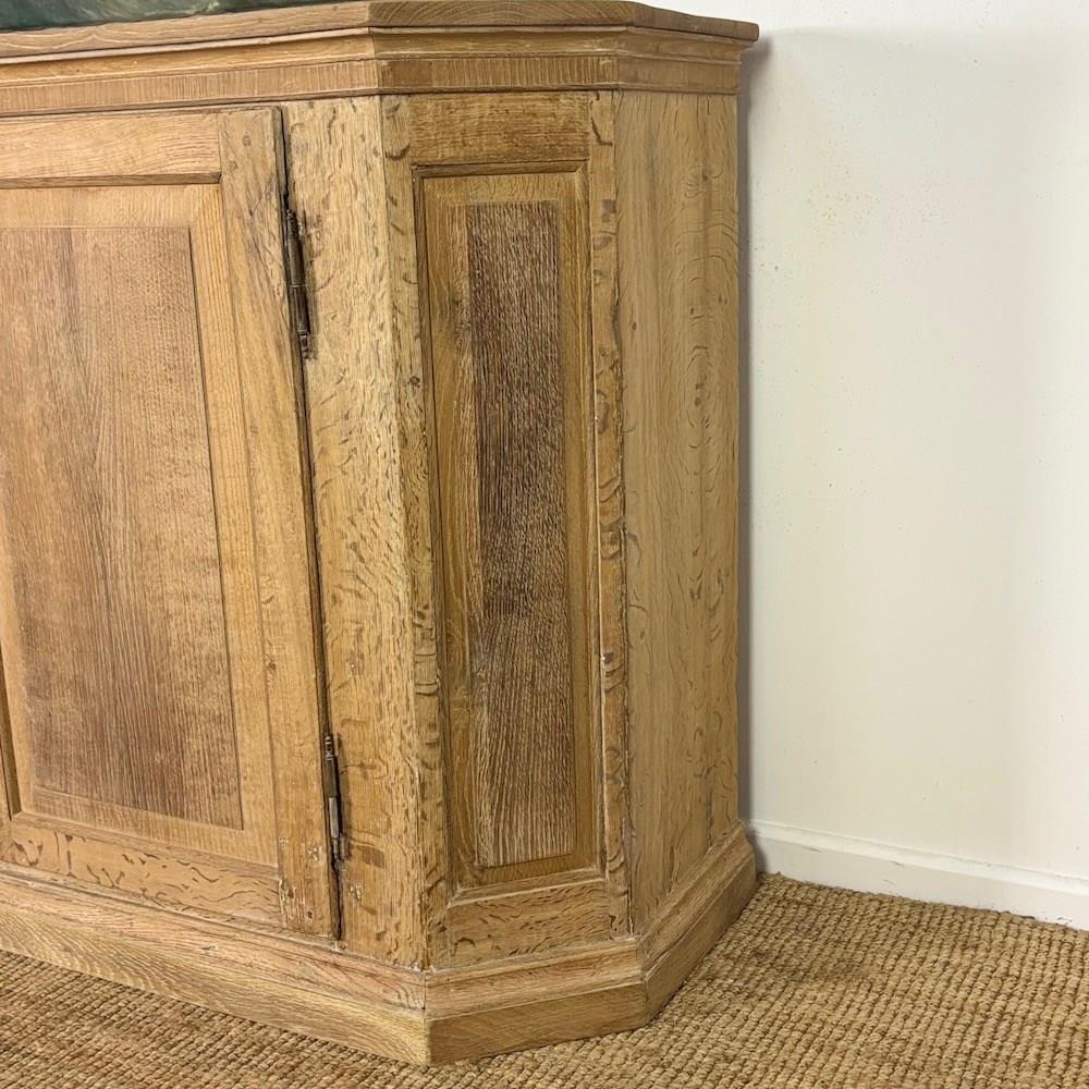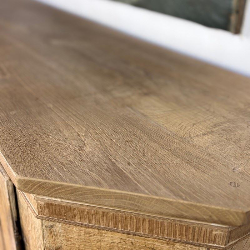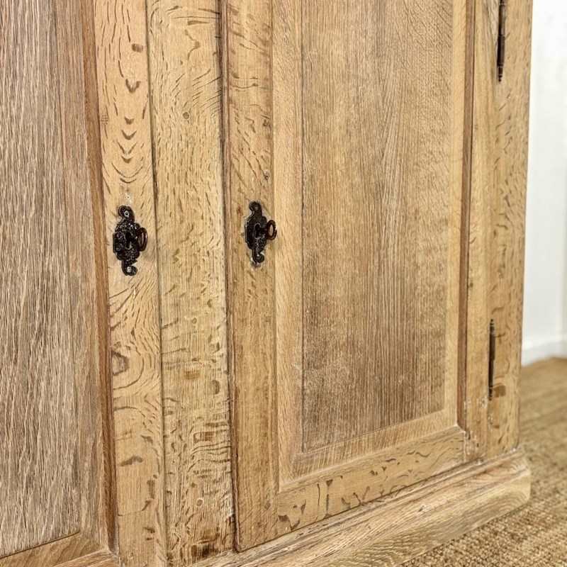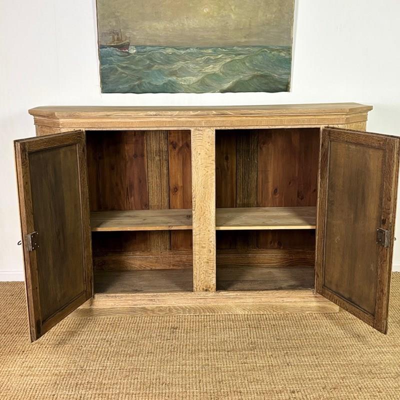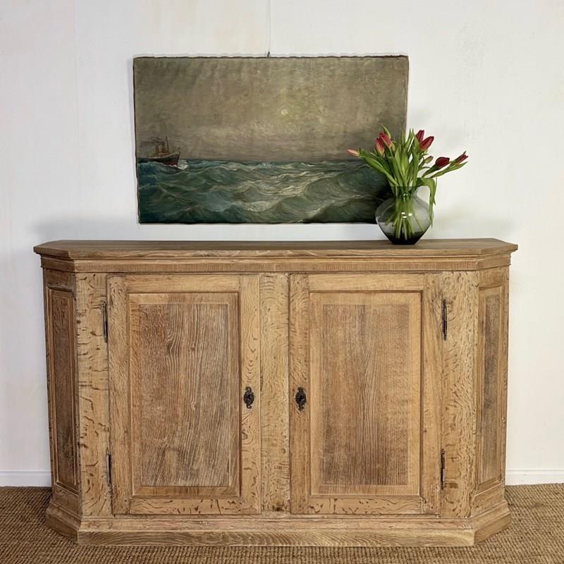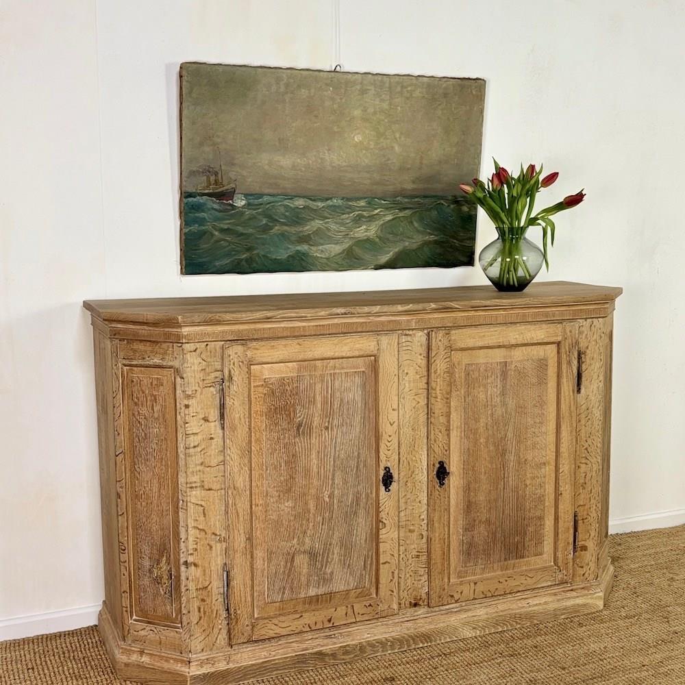 A substantial and well figured continental oak sideboard, dating from the 1890s. This piece is constructed from solid oak with a desirable bleached patina that highlights the natural grain and character of the timber. The top has a moulded edge above a two-door cabinet base, enclosing internal storage with 2 shelves. The doors are fitted with classic raised and fielded panels and retain their original metal escutcheons and hinges. The sideboard stands on a continuous plinth base, which adds to its age, displaying characterful signs of historic use and age-related wear.