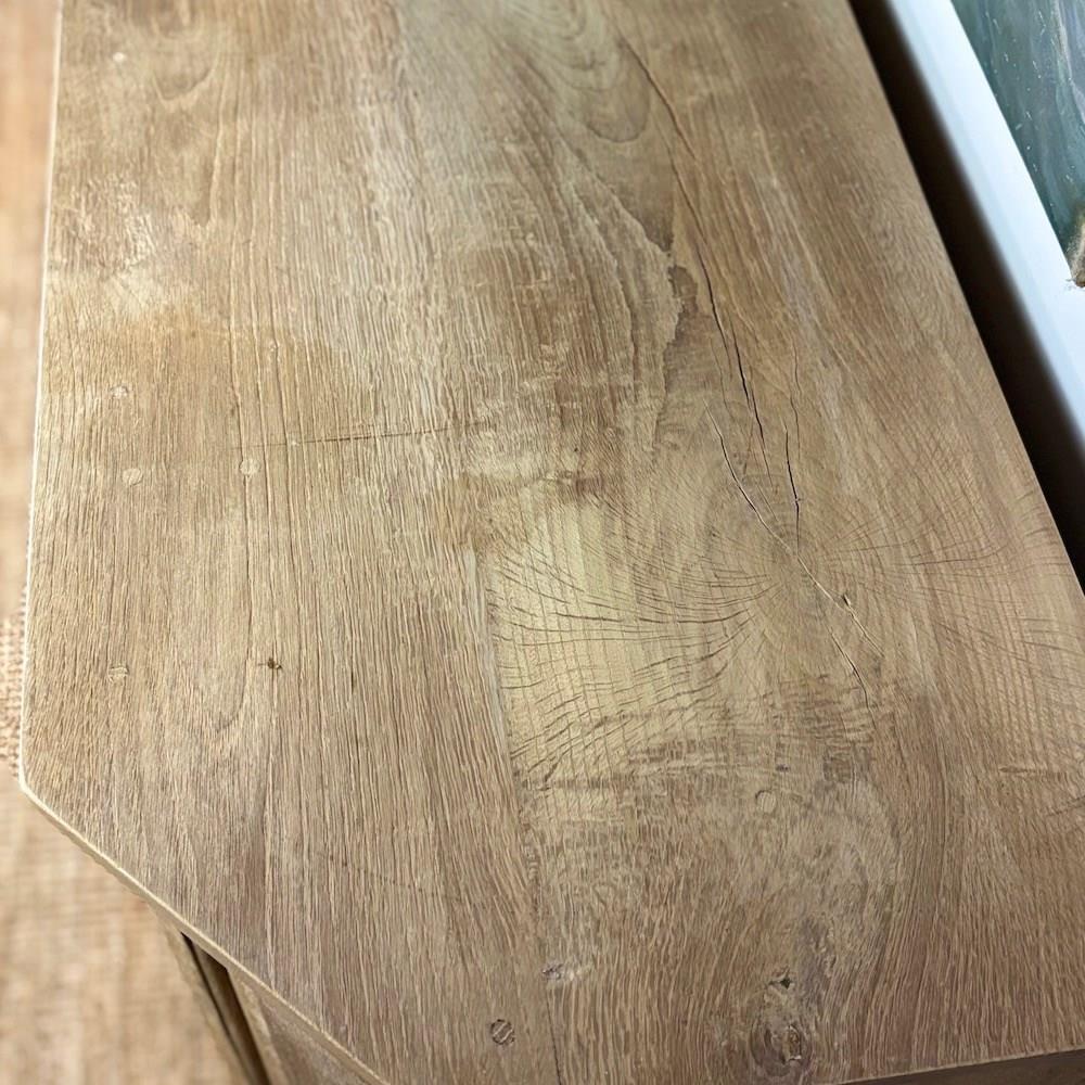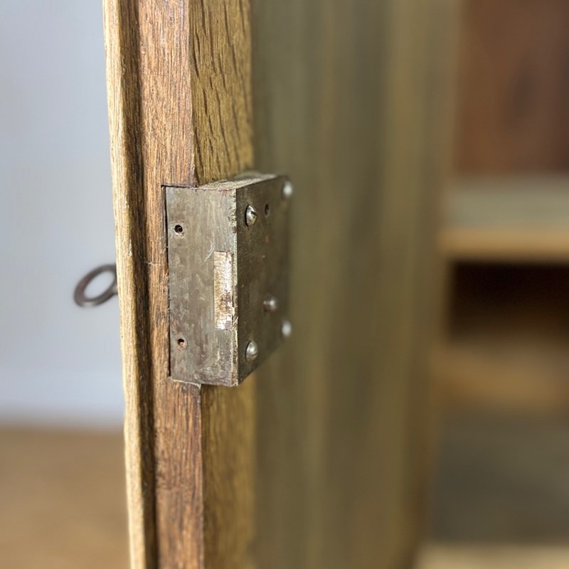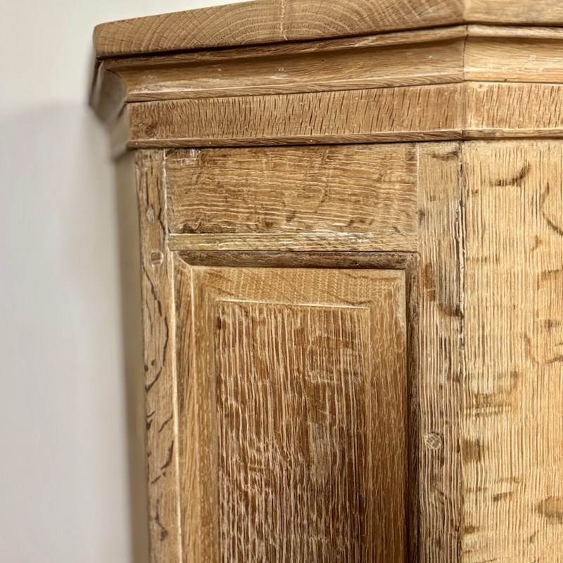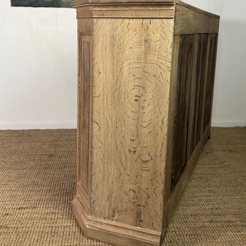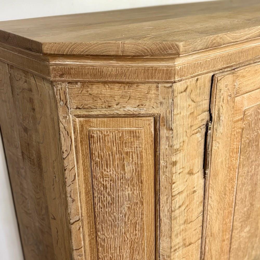 A substantial and well figured continental oak sideboard, dating from the 1890s. This piece is constructed from solid oak with a desirable bleached patina that highlights the natural grain and character of the timber. The top has a moulded edge above a two-door cabinet base, enclosing internal storage with 2 shelves. The doors are fitted with classic raised and fielded panels and retain their original metal escutcheons and hinges. The sideboard stands on a continuous plinth base, which adds to its age, displaying characterful signs of historic use and age-related wear.