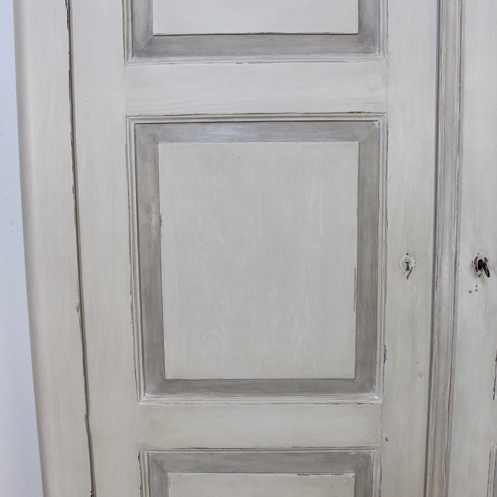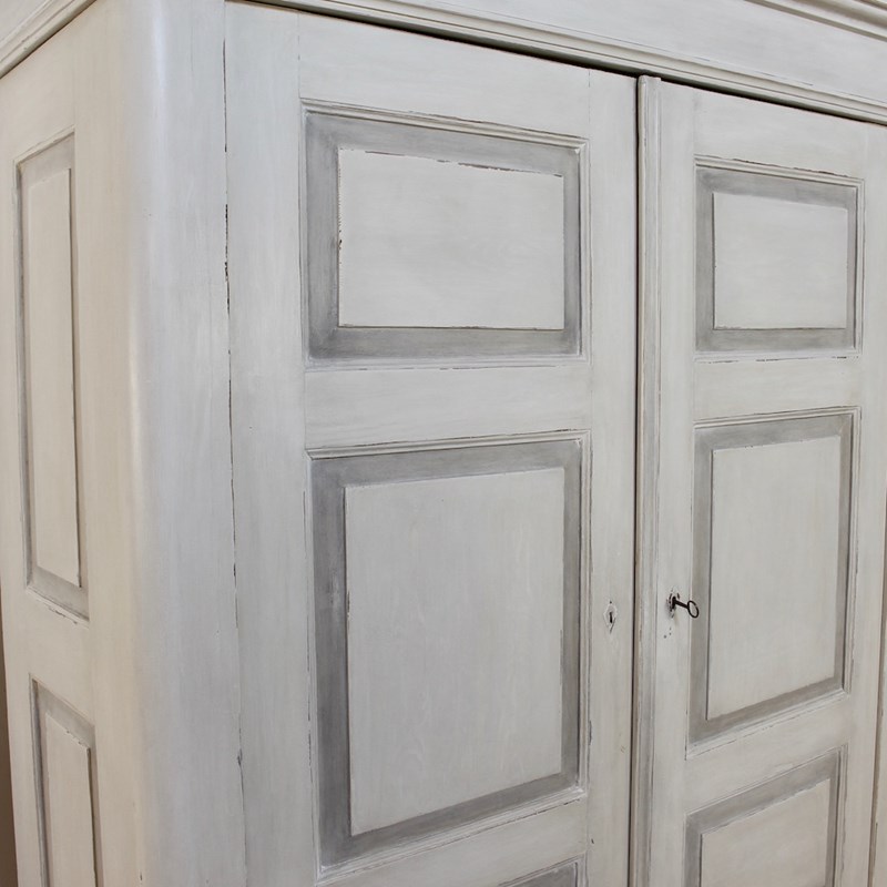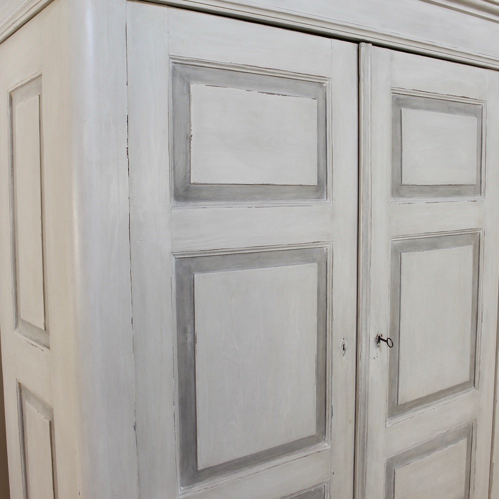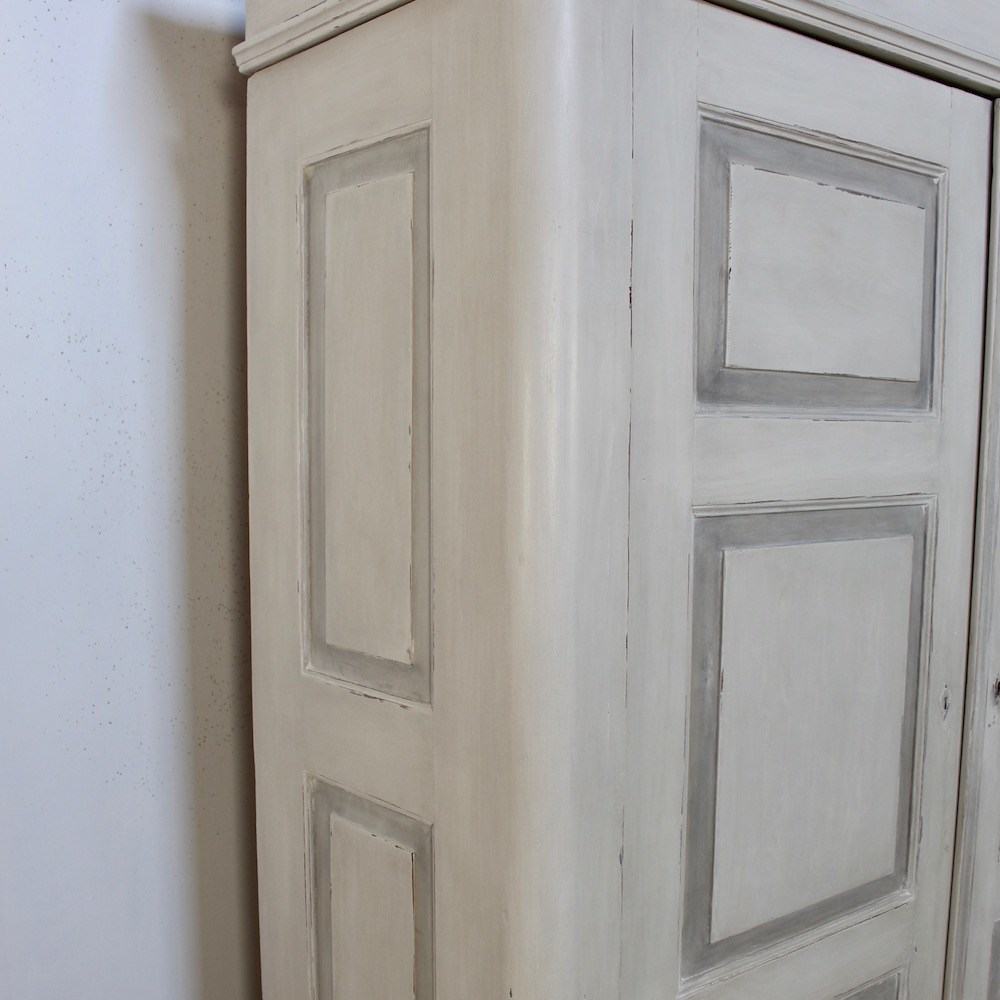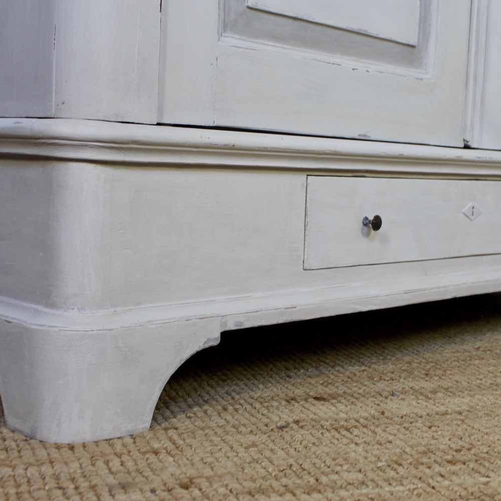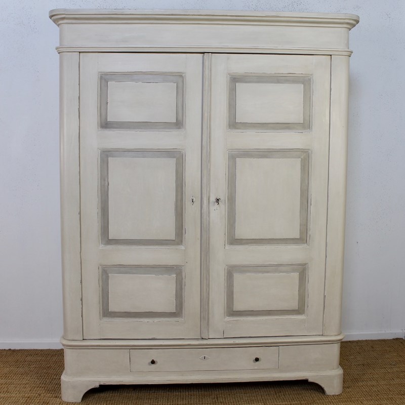 A charming 19th-century German provincial wardrobe, crafted in pine and later painted in a tasteful two-tone palette of antique white and soft grey. Featuring classic panelled doors with three recessed panels apiece , flanked by rounded corners and topped with a moulded cornice. Below , a fullwidth drawer offers additional storage , set on bracket feet. The interior is fitted with a hanging rail . The key is working smoothly in the old lock.