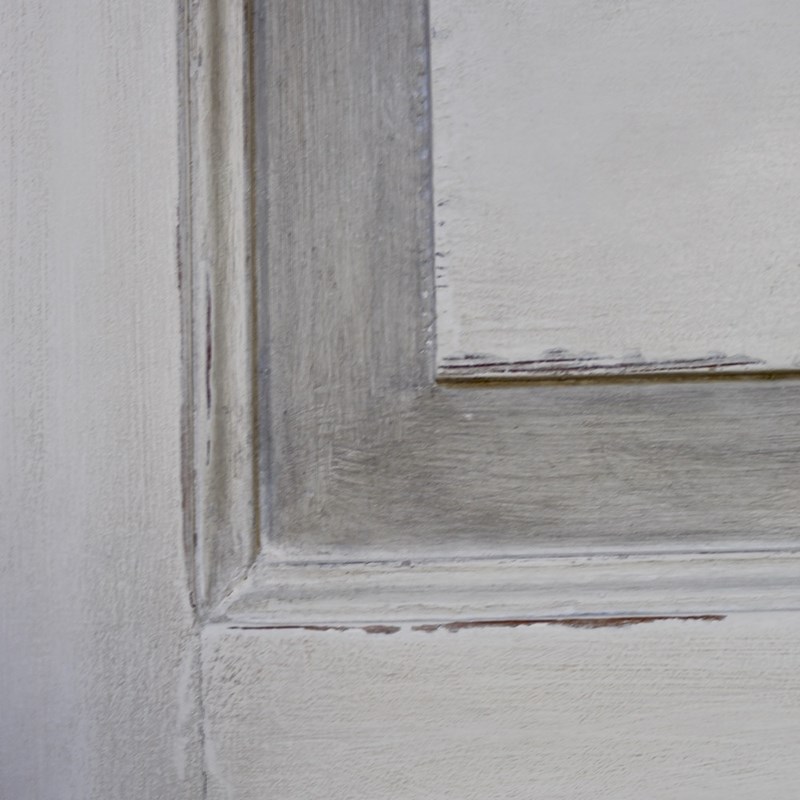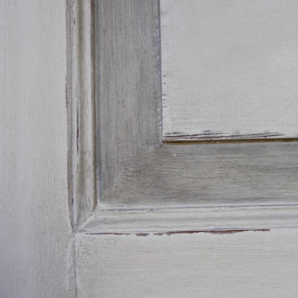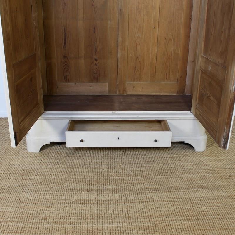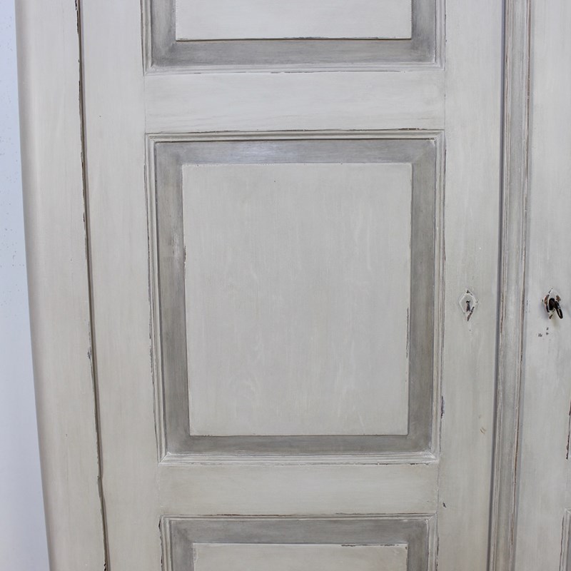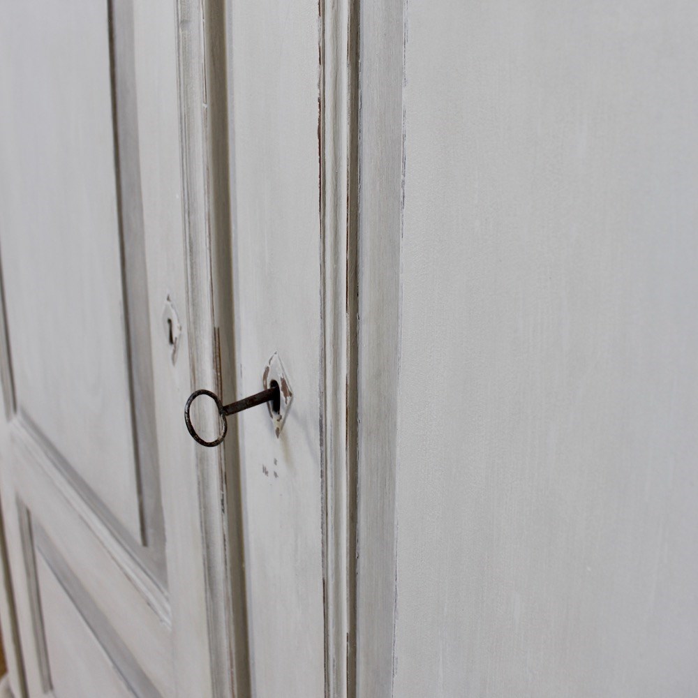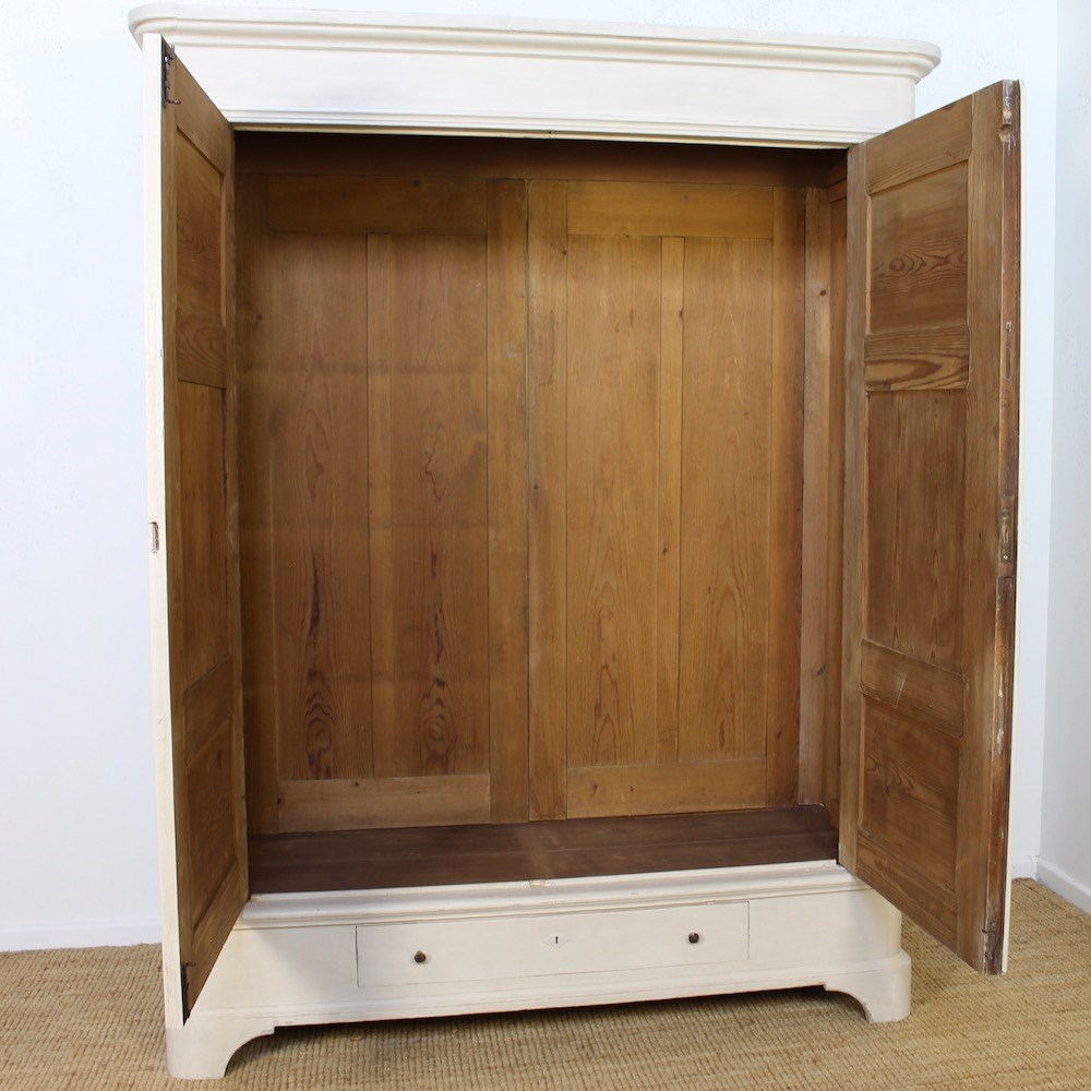 A charming 19th-century German provincial wardrobe, crafted in pine and later painted in a tasteful two-tone palette of antique white and soft grey. Featuring classic panelled doors with three recessed panels apiece , flanked by rounded corners and topped with a moulded cornice. Below , a fullwidth drawer offers additional storage , set on bracket feet. The interior is fitted with a hanging rail . The key is working smoothly in the old lock.
