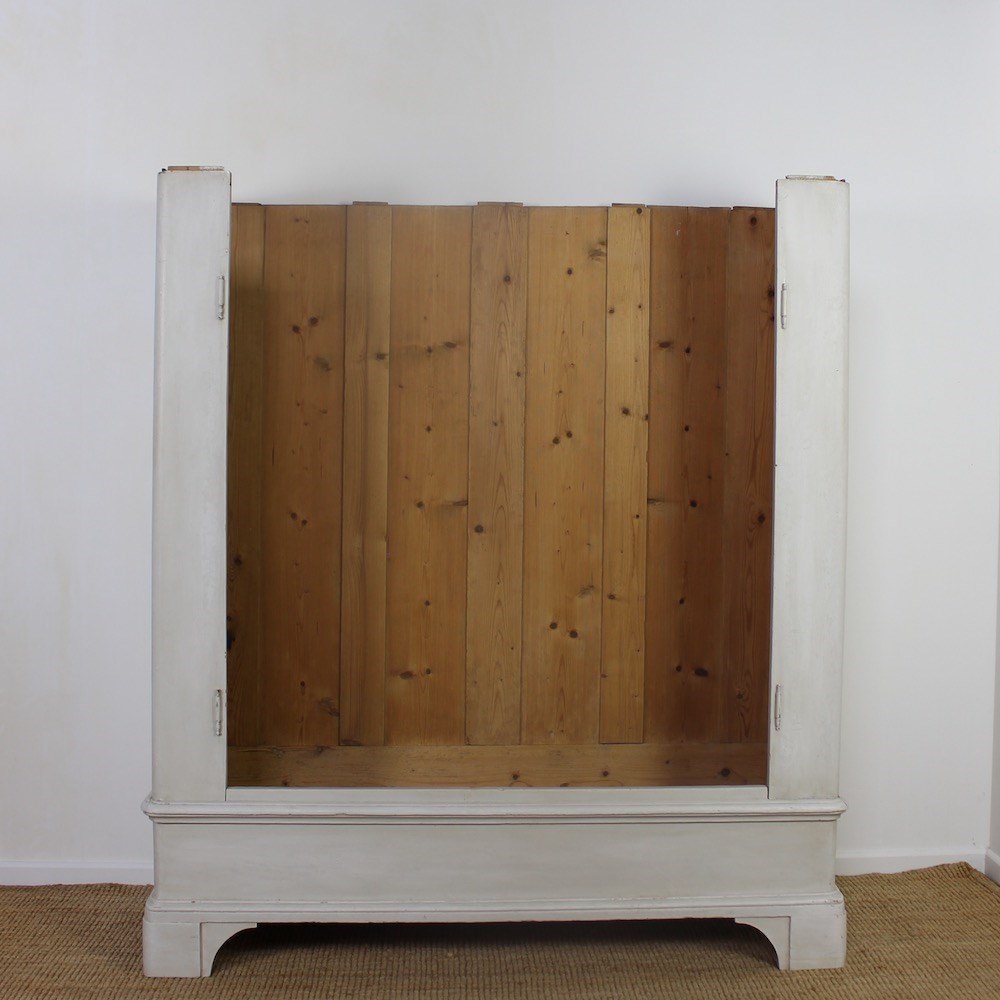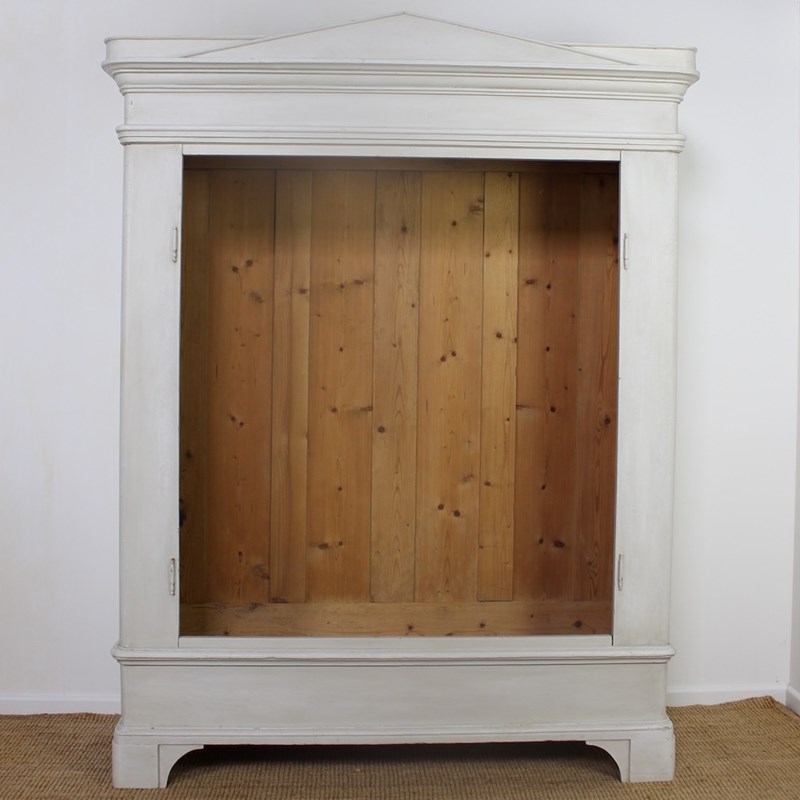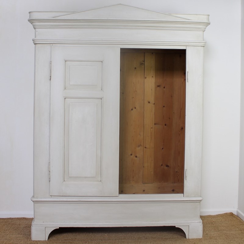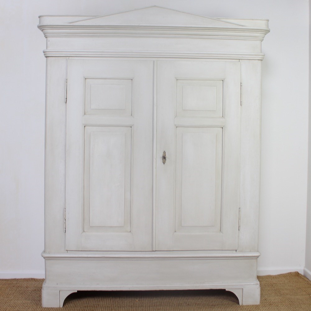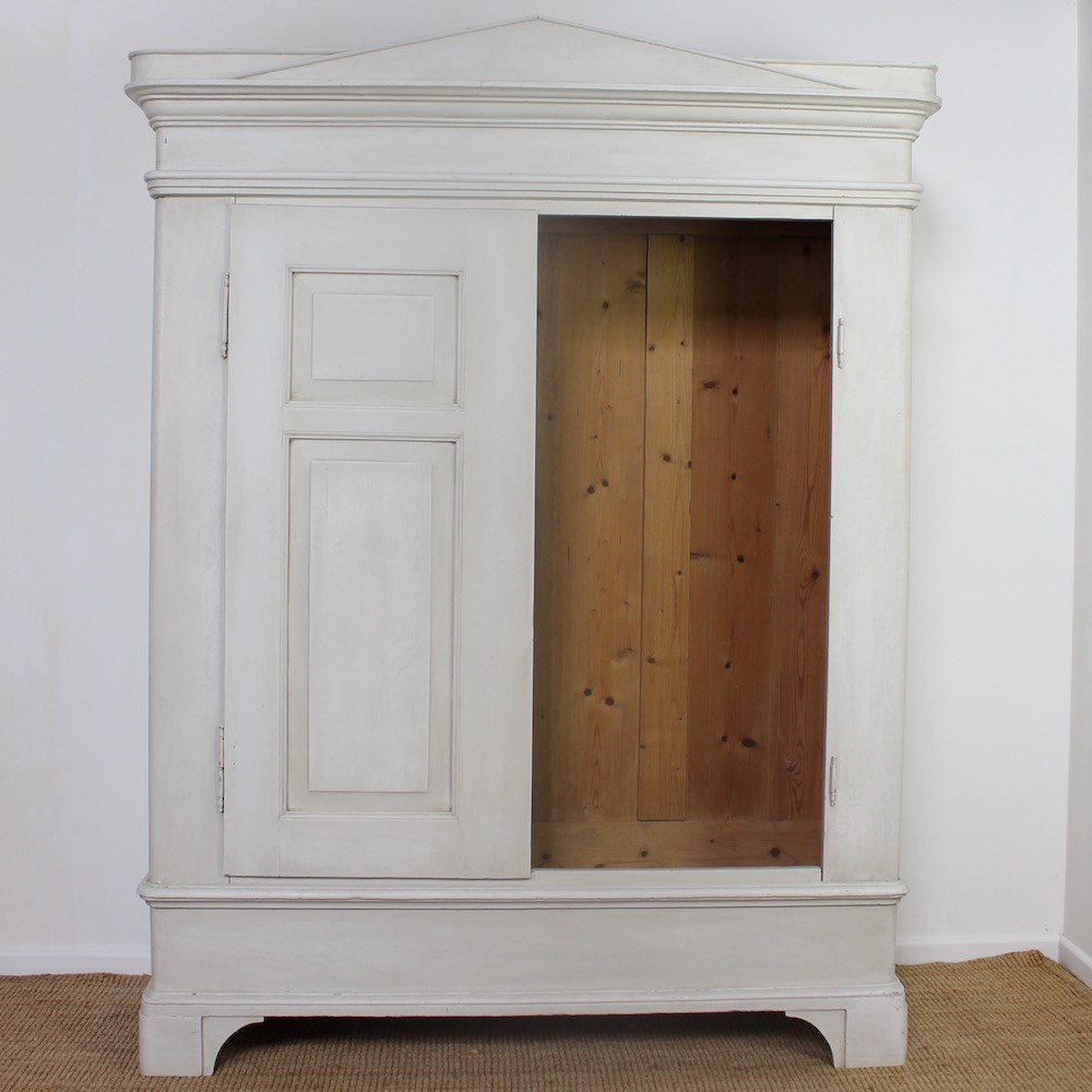 This early 19th Century North-German pine wardrobe is of neoclassical influence. The projecting triangular pediment sits above a boldly moulded cornice, over a pair of fielded panelled doors opening to an interior space for hanging clothes. Raised upon a plinth base with shaped bracket feet later painted in a soft off-white tone, exhibiting a gently worn patina consistent with age and use.