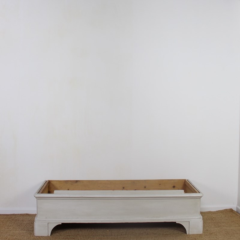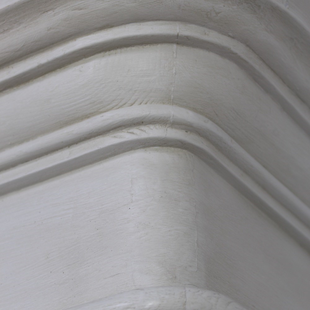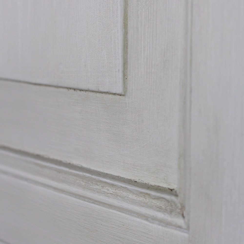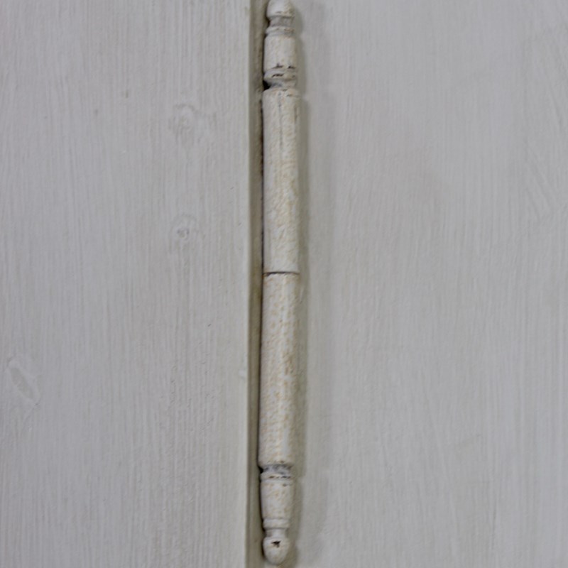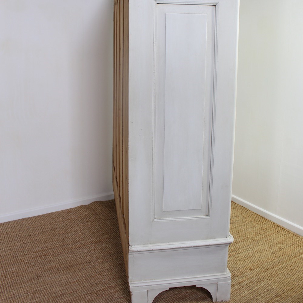 This early 19th Century North-German pine wardrobe is of neoclassical influence. The projecting triangular pediment sits above a boldly moulded cornice, over a pair of fielded panelled doors opening to an interior space for hanging clothes. Raised upon a plinth base with shaped bracket feet later painted in a soft off-white tone, exhibiting a gently worn patina consistent with age and use.