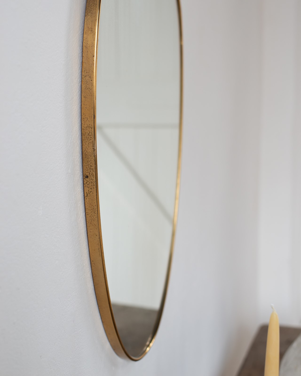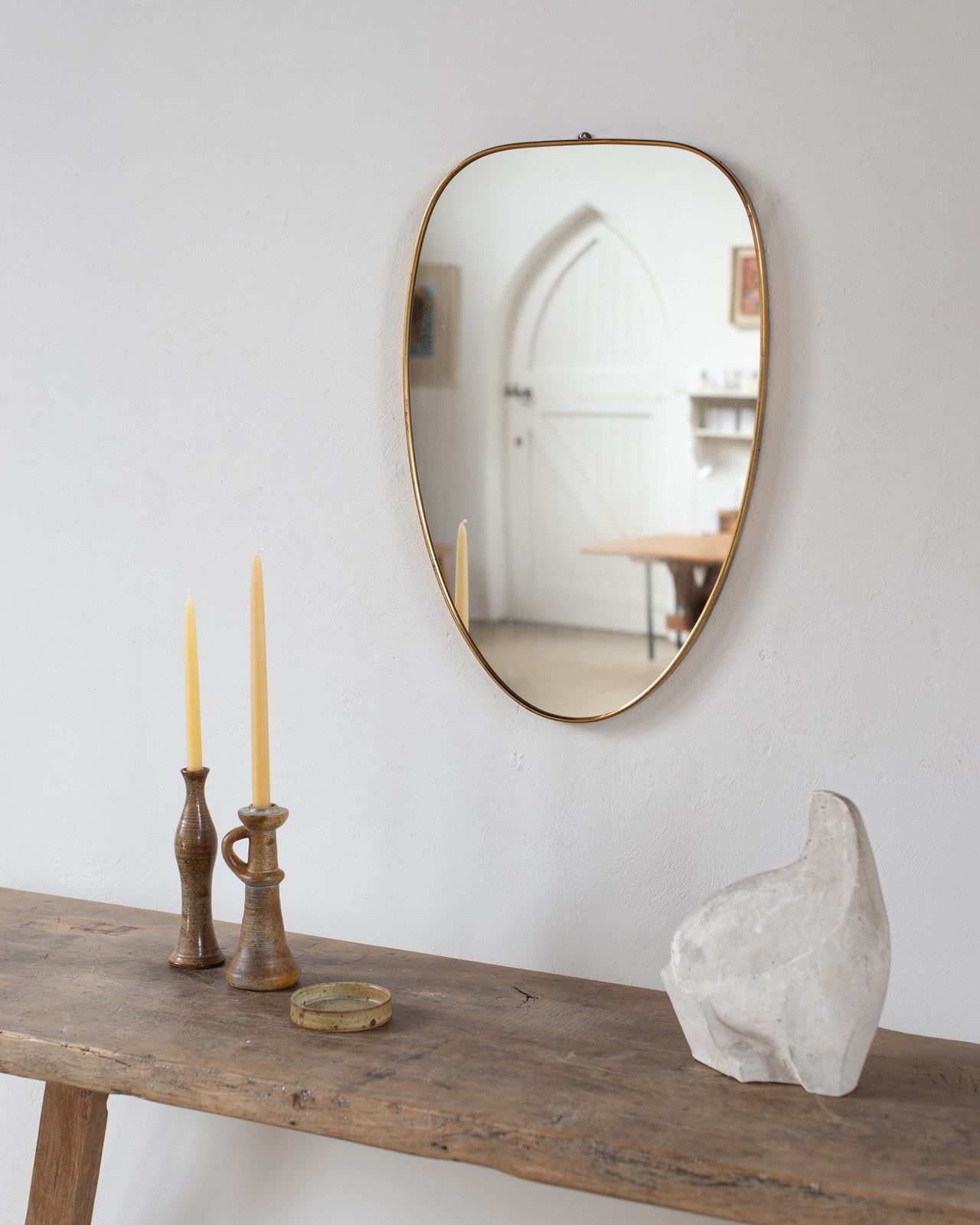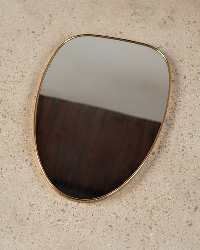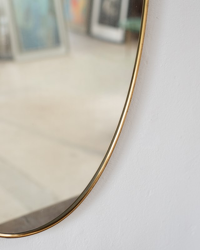 A mid-century brass and wood-framed mirror from Italy, C1950.  Generously proportioned and created in a shield shape, this piece has its original glass plate intact, which is in very good condition.