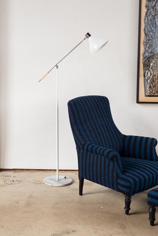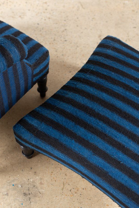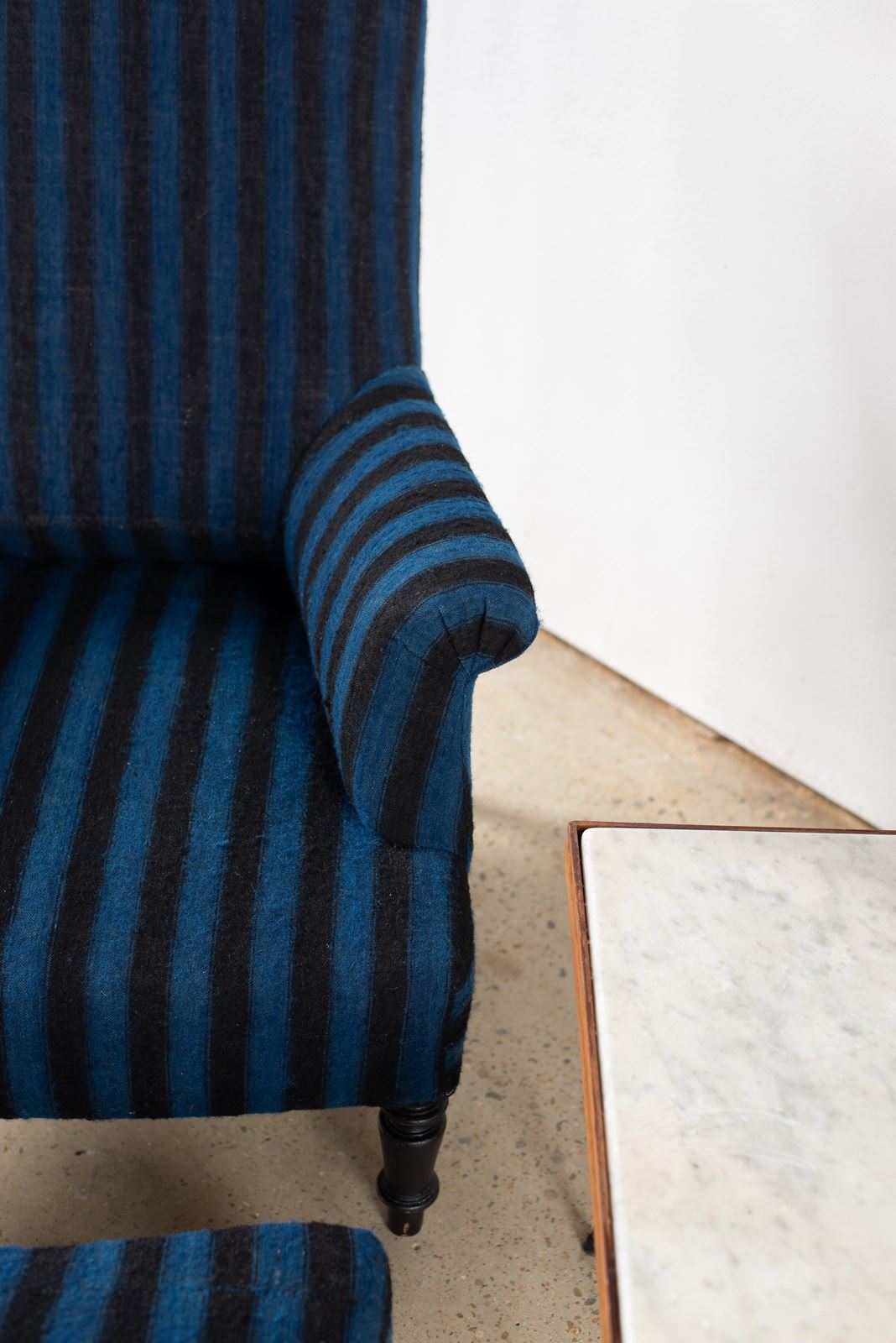 A 19th-century French Duchess chair and footstool,  from a Parisian residence. They have been fully reupholstered using antique wool and linen, woven striped Dutch cloth.  The turned wooden legs of the chair have been historically painted black.  In very good antique condition.