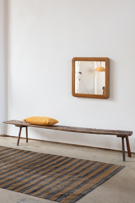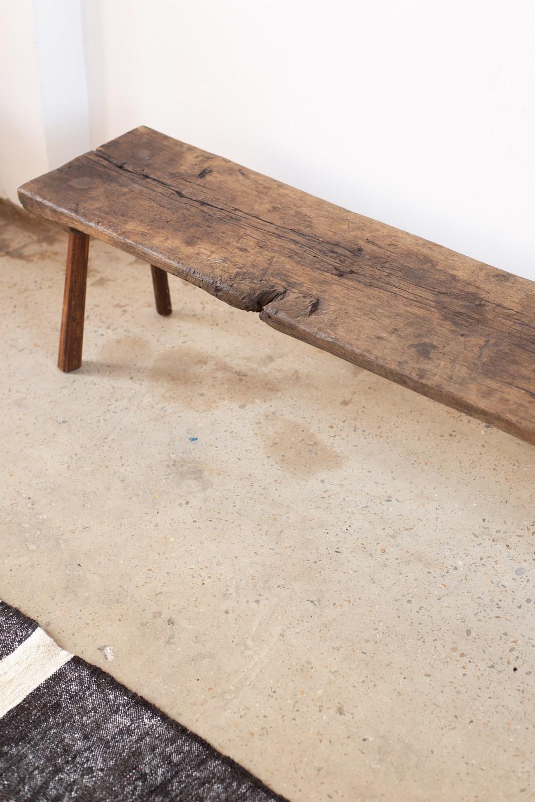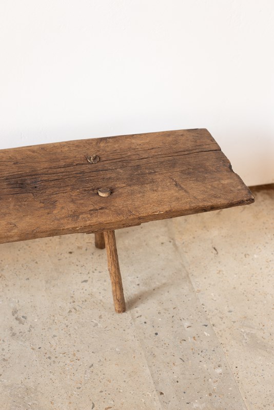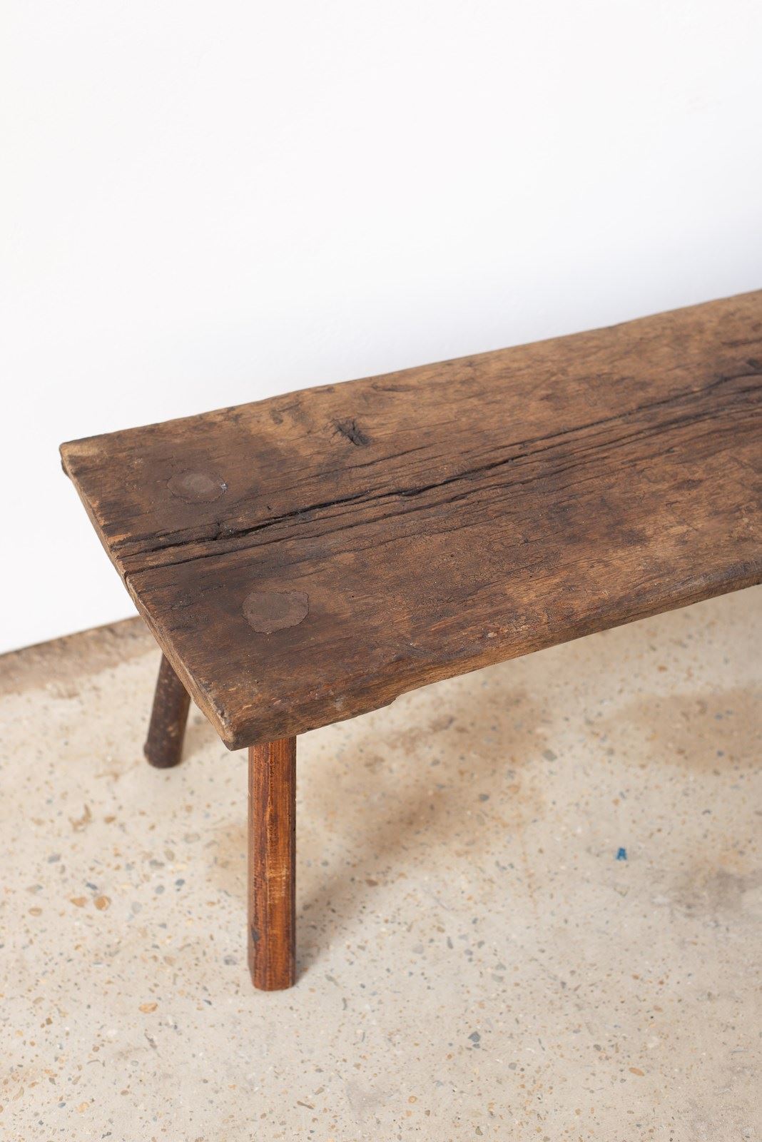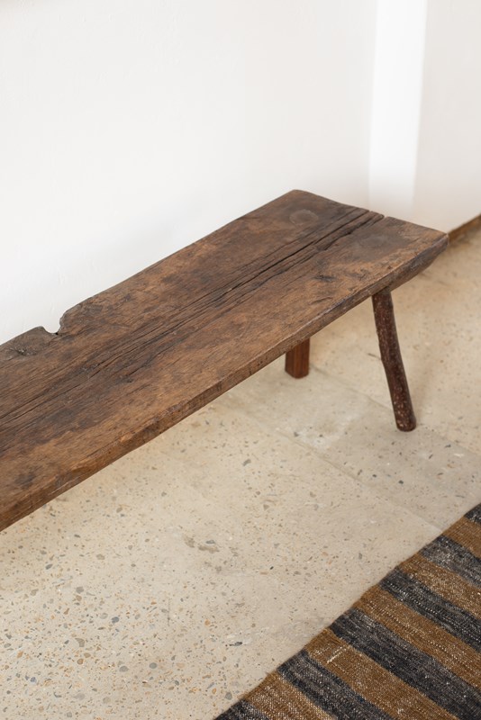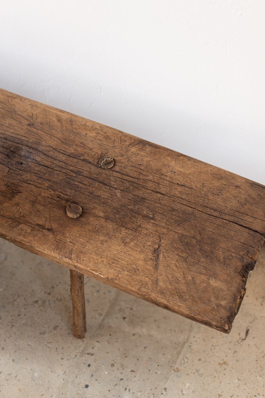 A long 19th-century wooden bench with stick legs, two of which have been historically replaced in a more brutalist style.  It is a characterful, hand-carved piece with some charming quirks, which make it all the more appealing.  Great for a hallway or bedroom.