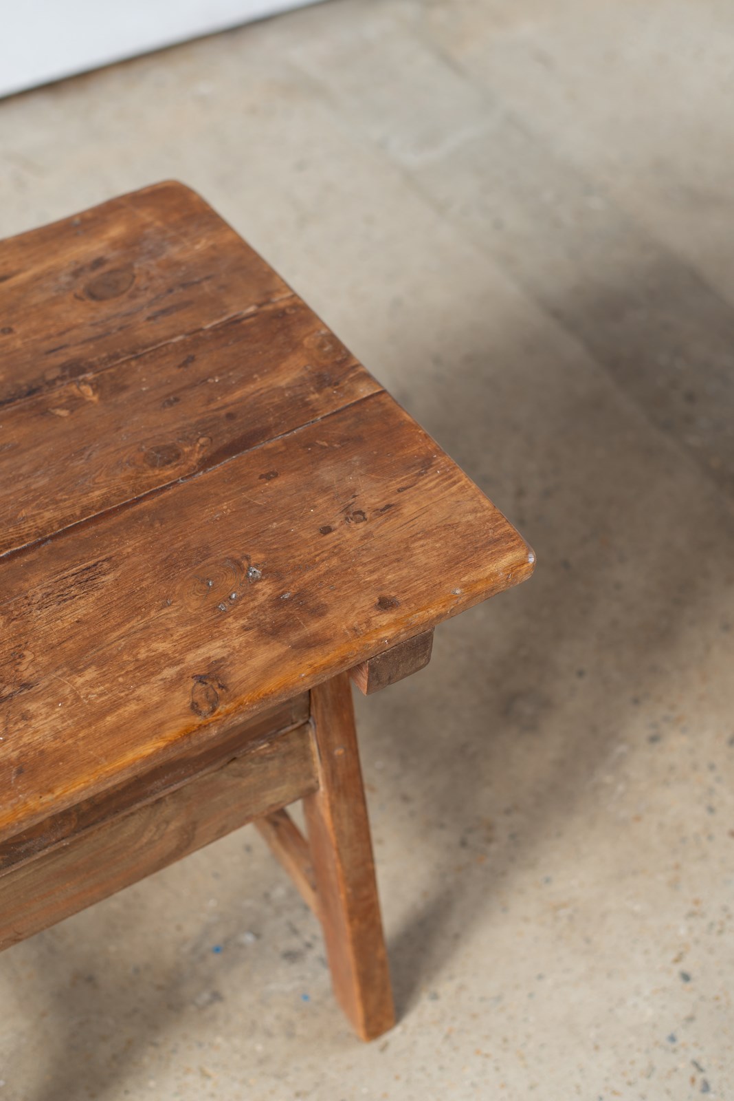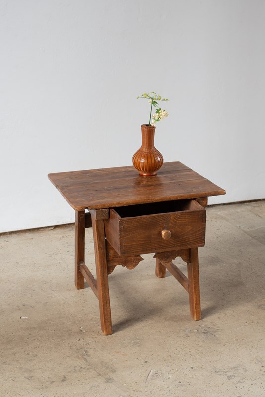 A 19th century Spanish side table crafted from chestnut wood.  It has a generously sized drawer which sits beneath the plank top.  Rustic in style, with simplistic carved scrolls and stretchers to the legs.  In very good antique condition.