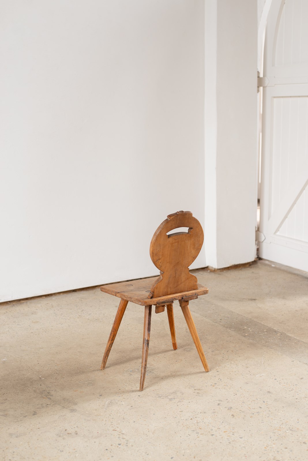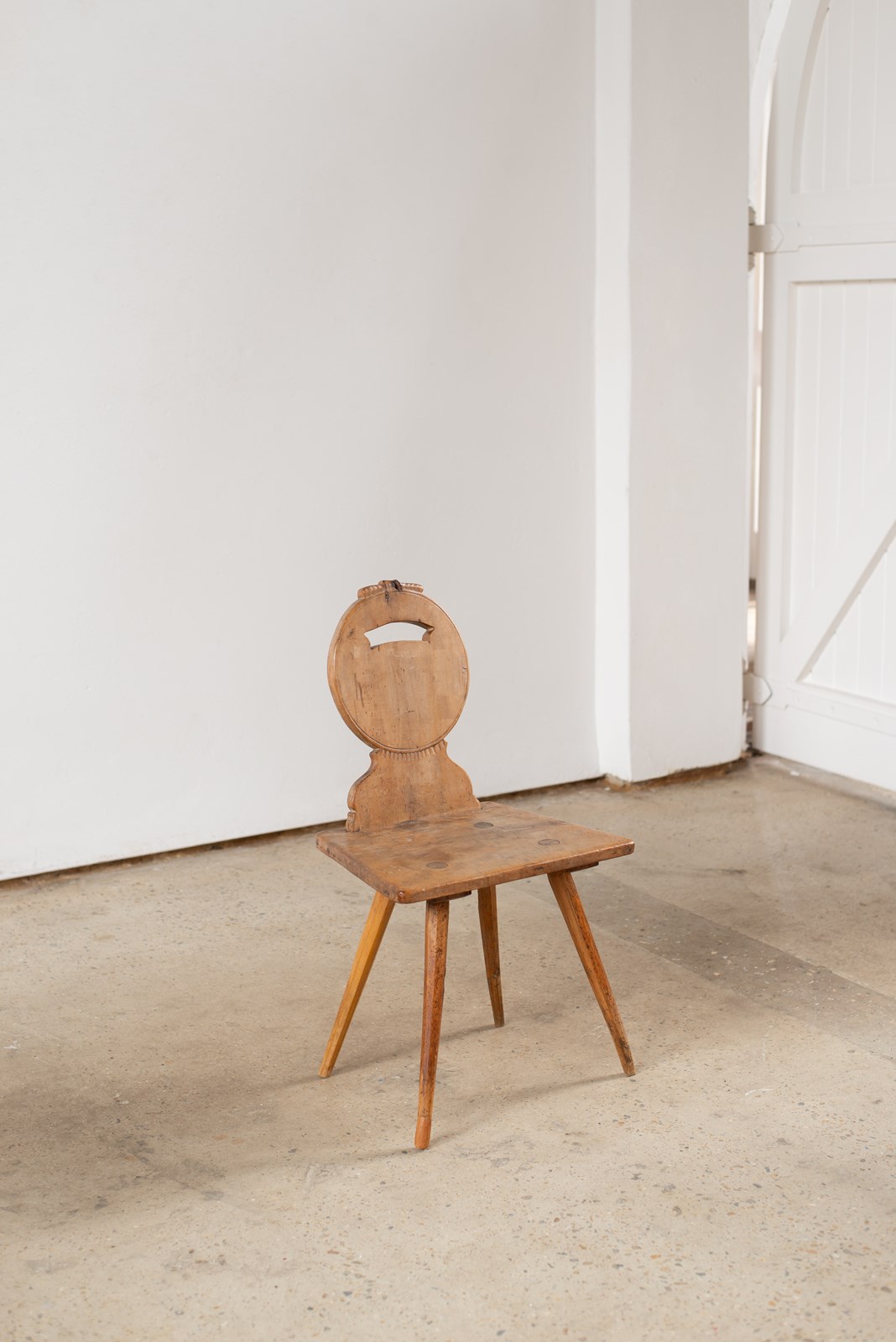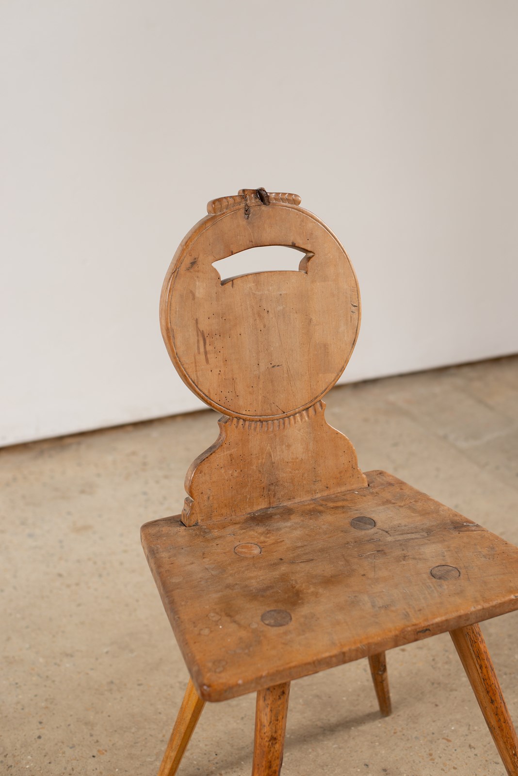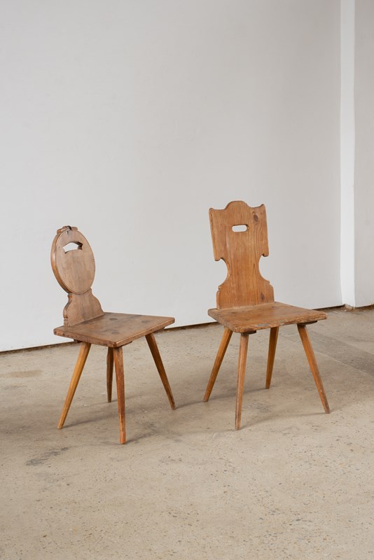 We came upon two individually characterful 19th-century Swedish folk art wooden chairs.   The back is pegged to the seat, and the legs are of a stick construction. A wonderful, handcrafted rural  piece. They are sturdy enough to seat, as an occassional piece.  They are priced individually.