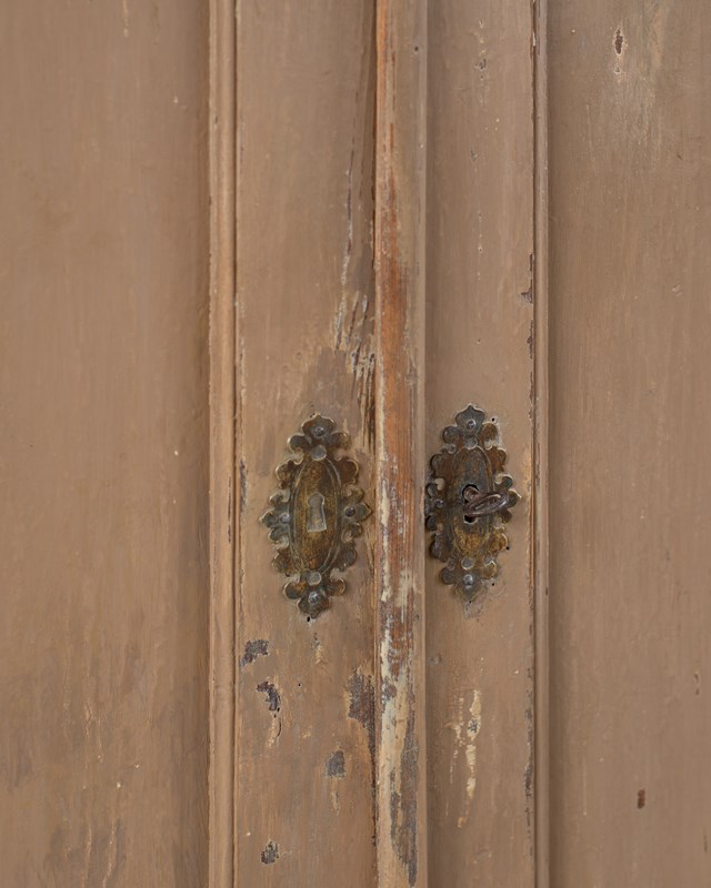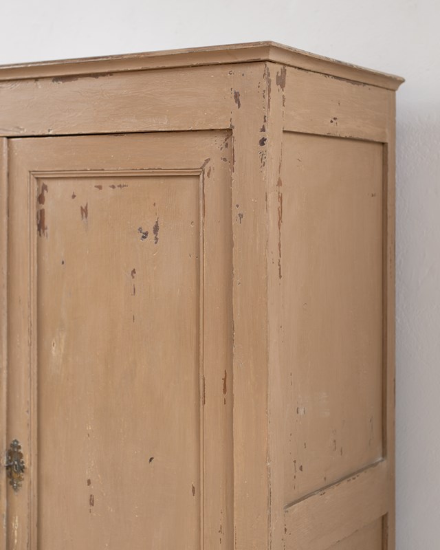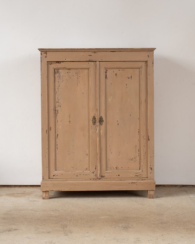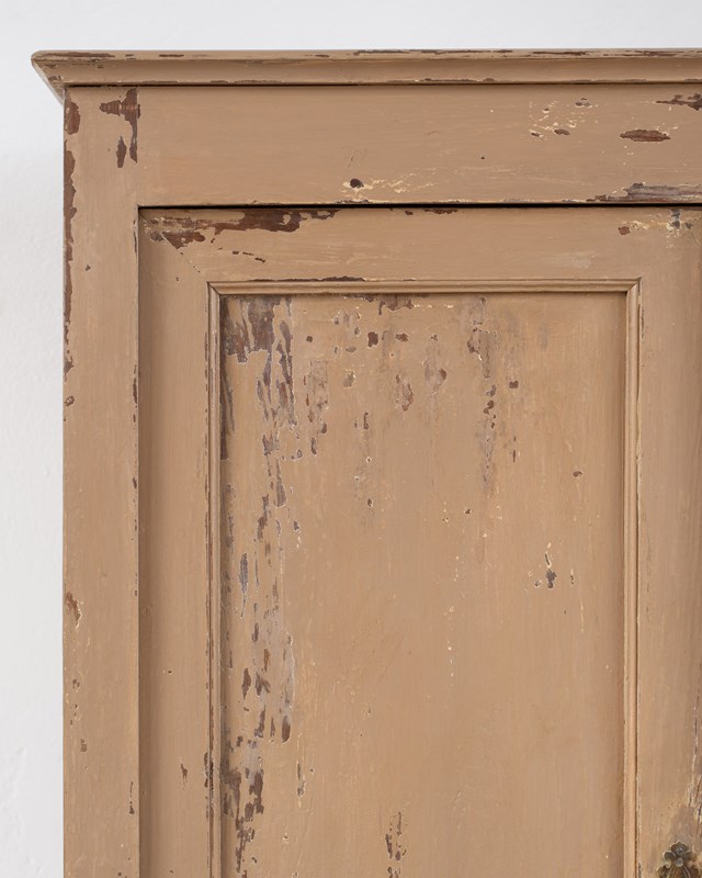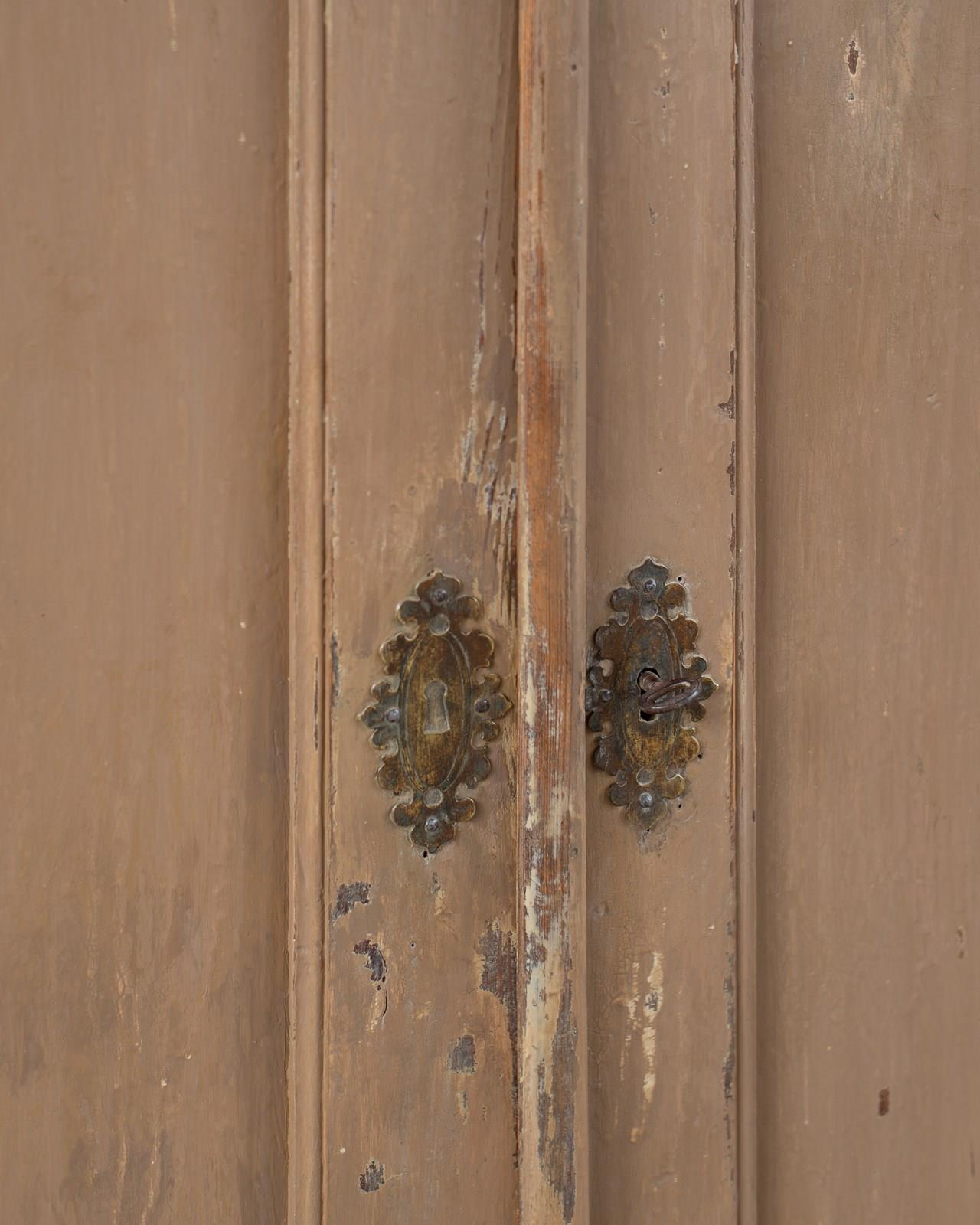 A wonderful 19th-century Swedish cupboard, with double doors and internal shelves.  Made in pine wood, with a historically painted surface in a putty tone, which has been part-restored in our workshop.  The door has a working lock with a key.  This piece shows its age, with wear and patina to its surface.