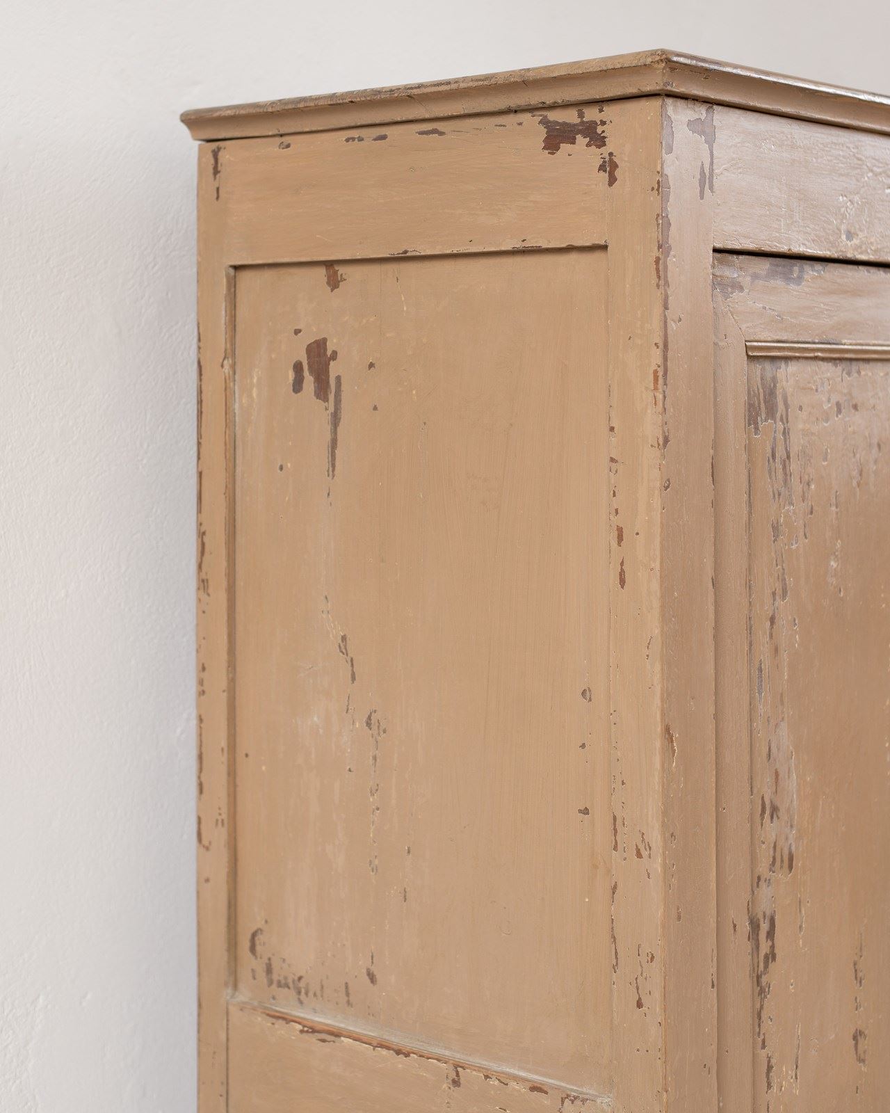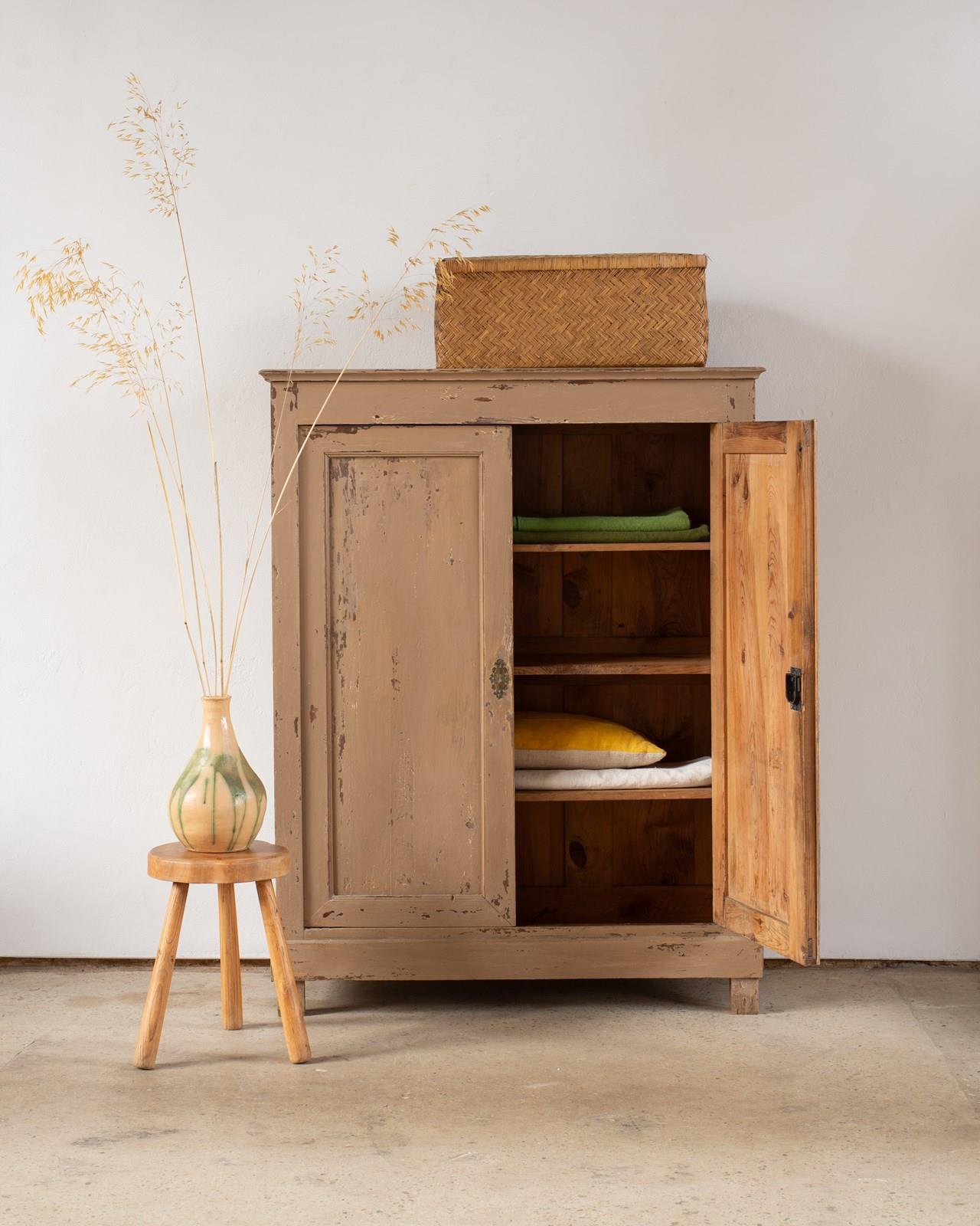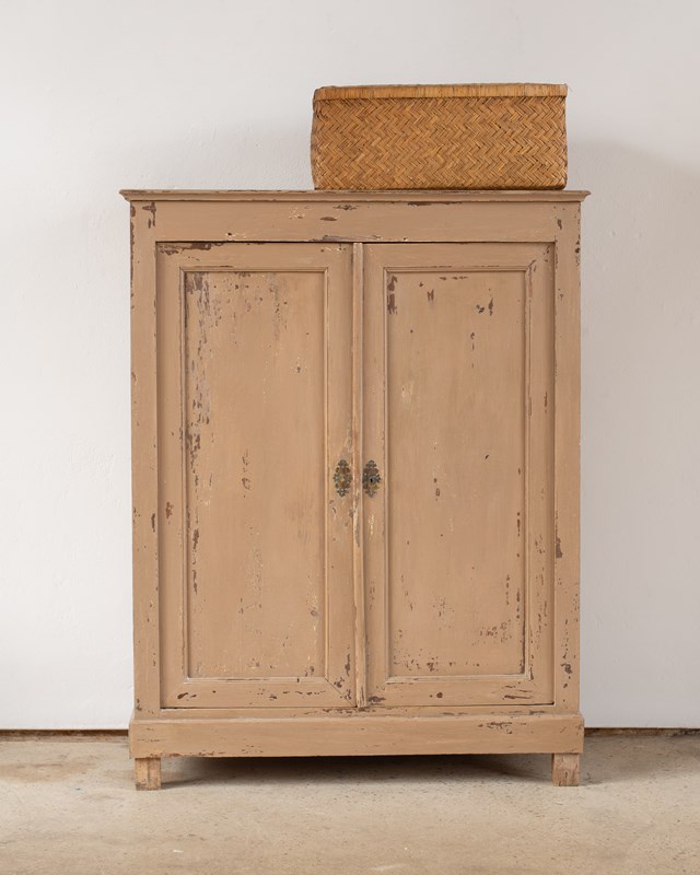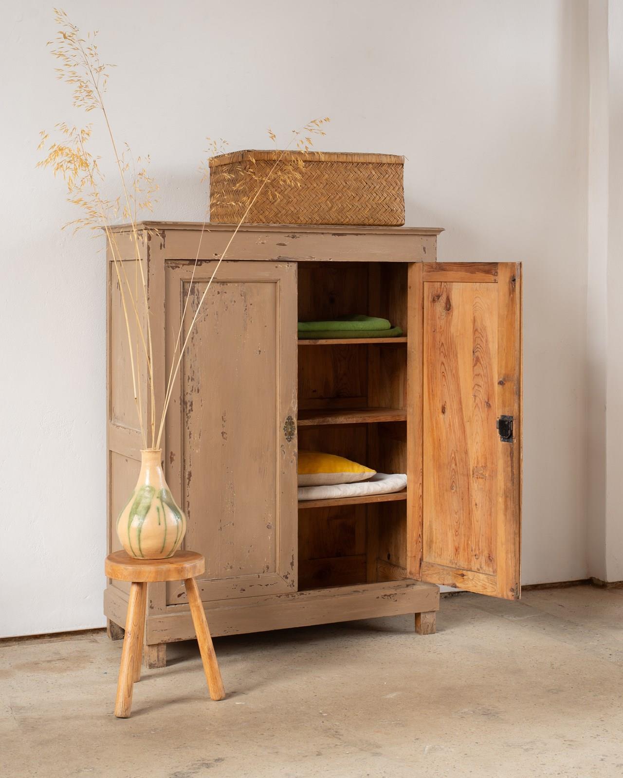 A wonderful 19th-century Swedish cupboard, with double doors and internal shelves.  Made in pine wood, with a historically painted surface in a putty tone, which has been part-restored in our workshop.  The door has a working lock with a key.  This piece shows its age, with wear and patina to its surface.